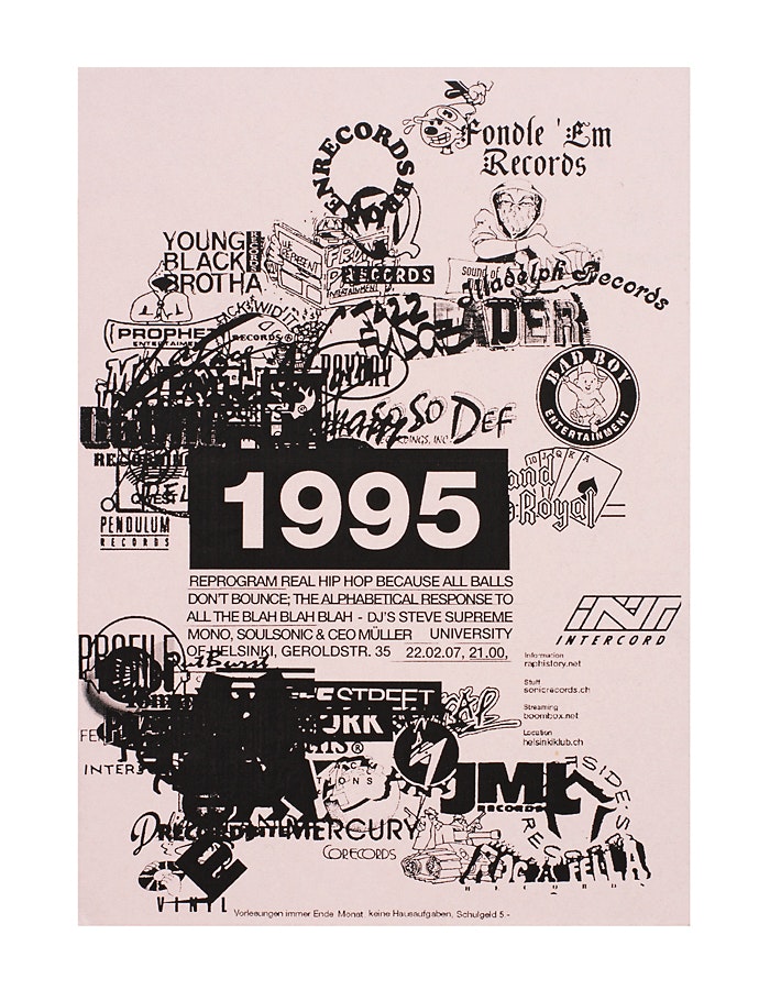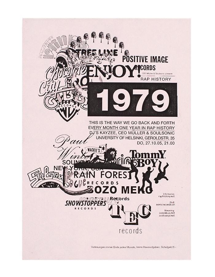 Mais plus que l'effort de dresser une liste aussi complète que possible de tous les disques de rap jamais publiés, ce qui intéresse Ivan Sterzinger, alias DJ CEO Müller, c'est la musique. Son média à lui, c'est la soirée musicale. Voilà pourquoi il a ouvert plus de trente fois, avec Klemens Wempe, au club zurichois 'Helsinki', les portes de l''University of Helsinki'. Les DJ s'y muent en professeurs, chercheurs et spécialistes, et les cassettes, affiches et fanzines produits pour l'occasion deviennent autant de matériels d'enseignement. L'aspect visuel de l'ensemble est remarquable: c'est d'une manière saisissante que le directeur du projet et le graphiste ont réussi à donner ses lettres de noblesse à tout un riche courant musical, dont les facettes sont tout simplement innombrables. Leur manière concise et frappante de présenter les choses se manifeste en particulier dans le concentré symbolique des logos de firmes de disque, empilés les uns sur les autres. Année après année, les nouveautés sont repérables tandis que les labels existants s'entassent et se recouvrent. Un précis complété par des fragments remarquables de textes de chansons; cela ne ressemble à rien, et reste gravé dans la mémoire. Dans cet esprit, 'Rap History' est beaucoup plus qu'un événement-design décoratif: c'est un paquet de jeux éducatifs bien ficelé, qui permet de vivre l'éducation musicale avec une surprenante liberté.
