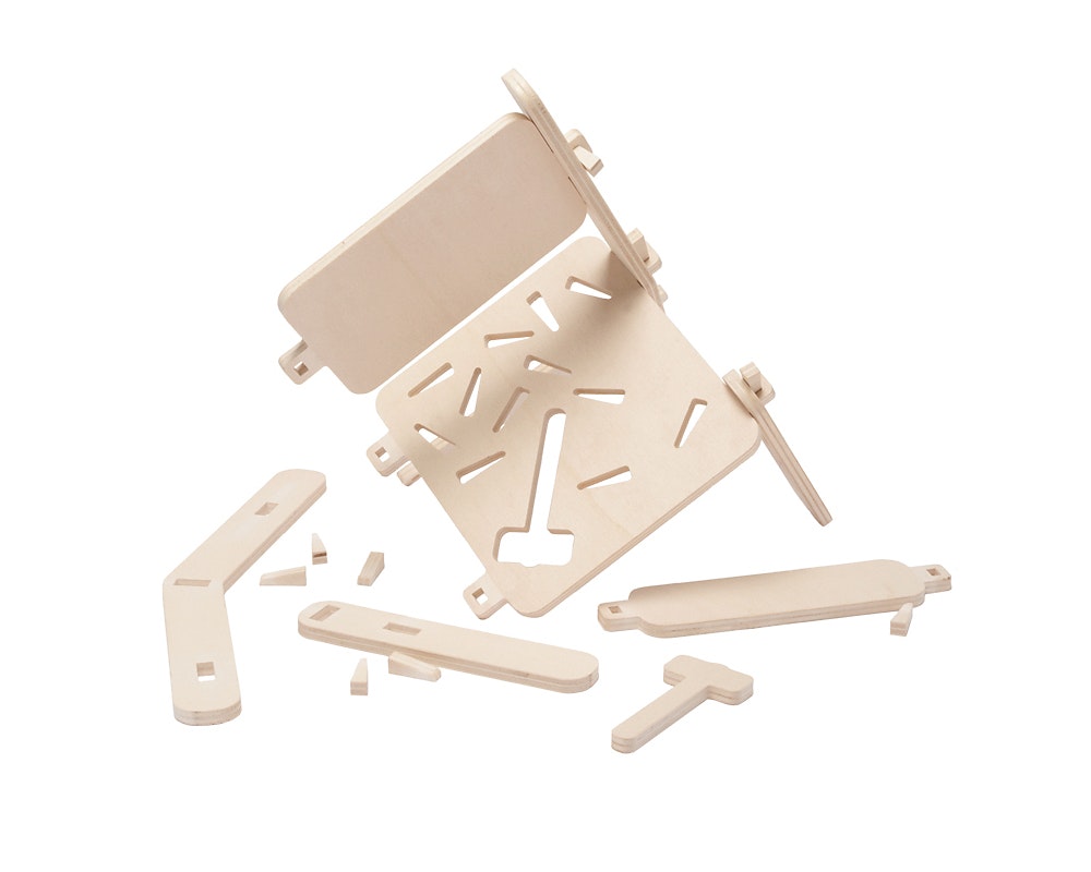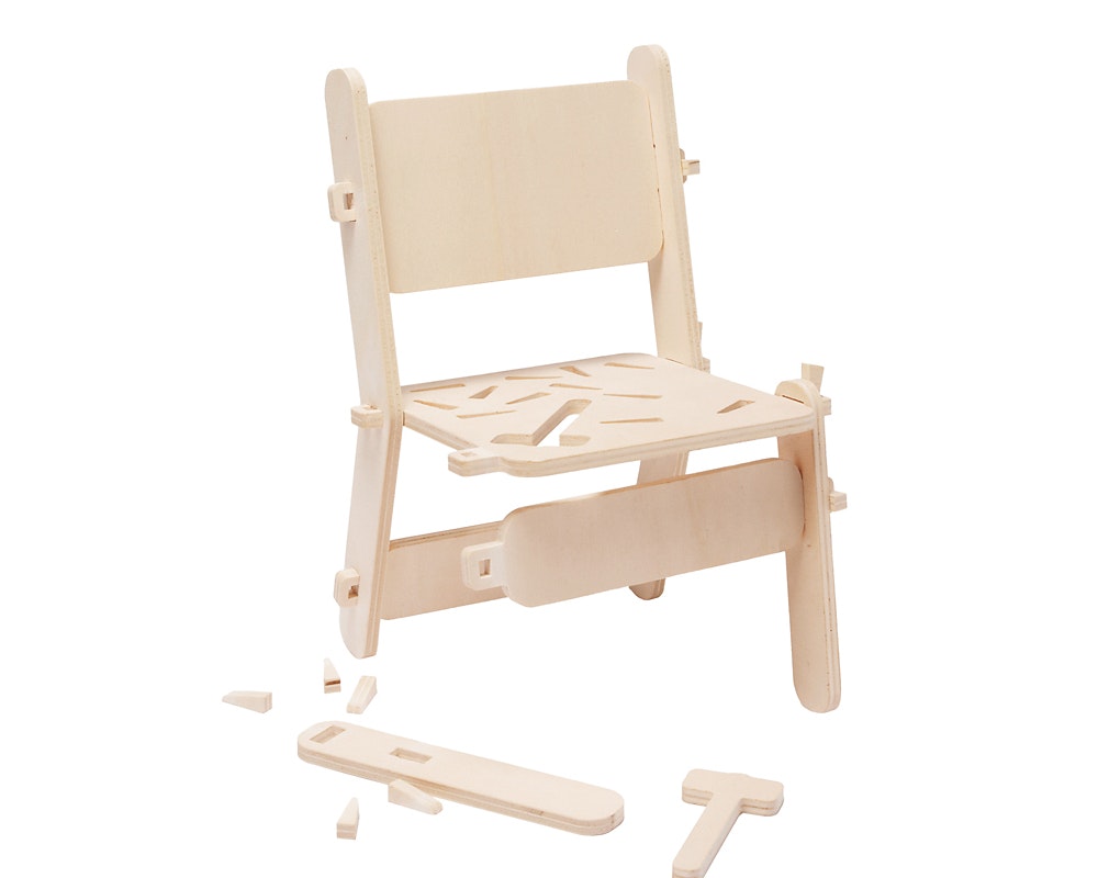 C'est aussi sans clous ni vis, mais avec des coins de bois, qu'est assurée la solidité de la petite chaise d'enfant 'BRicOLO', conçue avec Fabien Cappello. Les enfants peuvent assembler eux-mêmes leur meuble. Inspiré des jouets de bois traditionnels, un jeu de puzzle peut ensuite commencer avec les formes découpées dans le siège. Le marteau rappelle, dans sa forme, un instrument qui n'est plus nécessaire ici. Cette chaise stimule l'adresse des petits et les prépare dès leur jeune âge à assembler eux-mêmes leurs meubles, comme il se doit à l'ère d'Ikea.