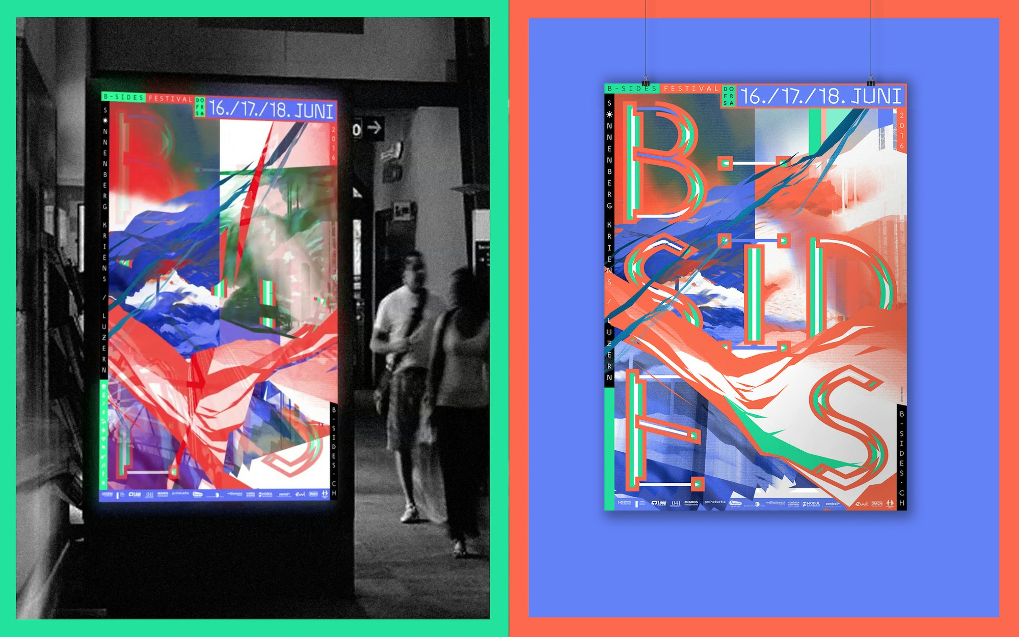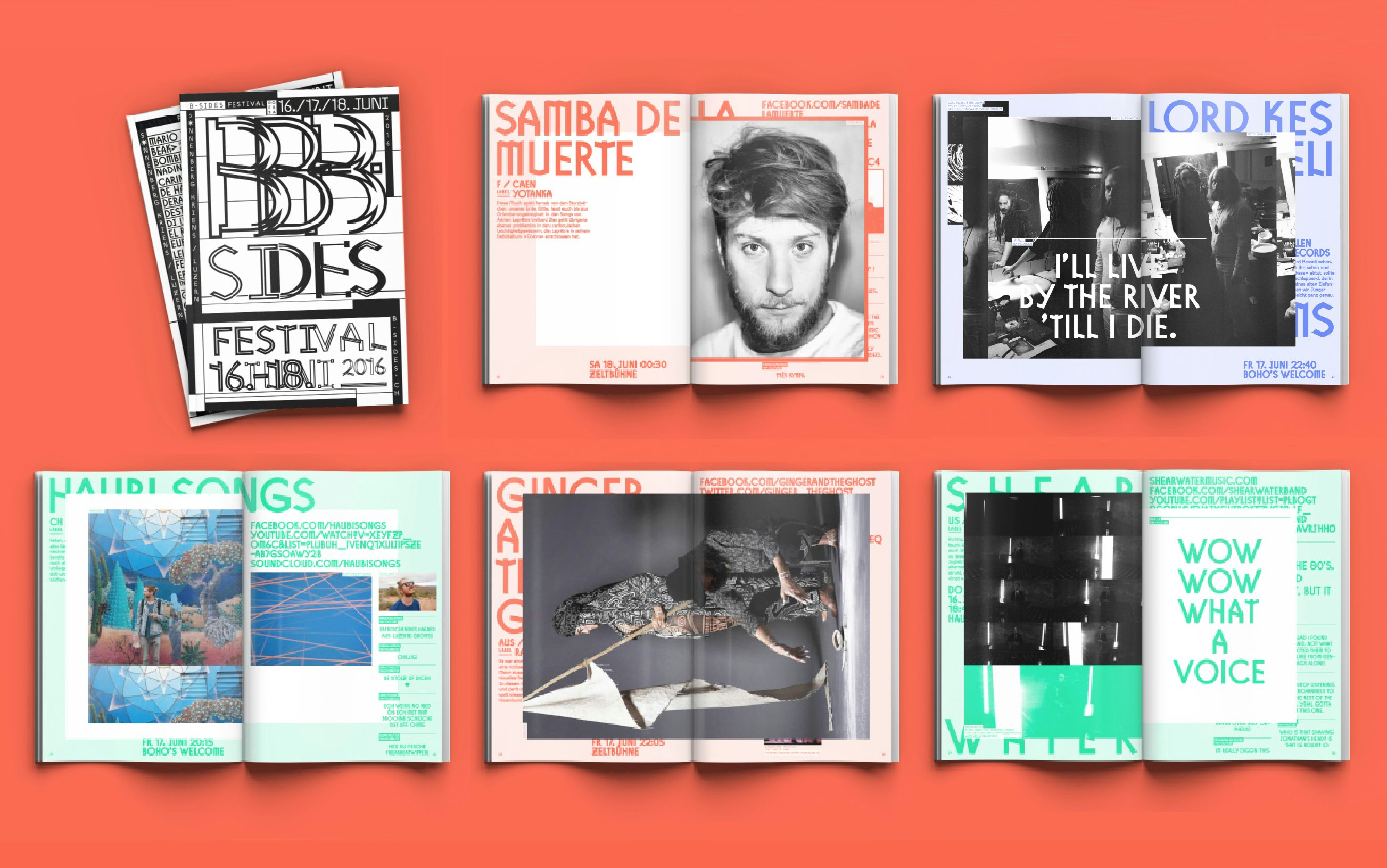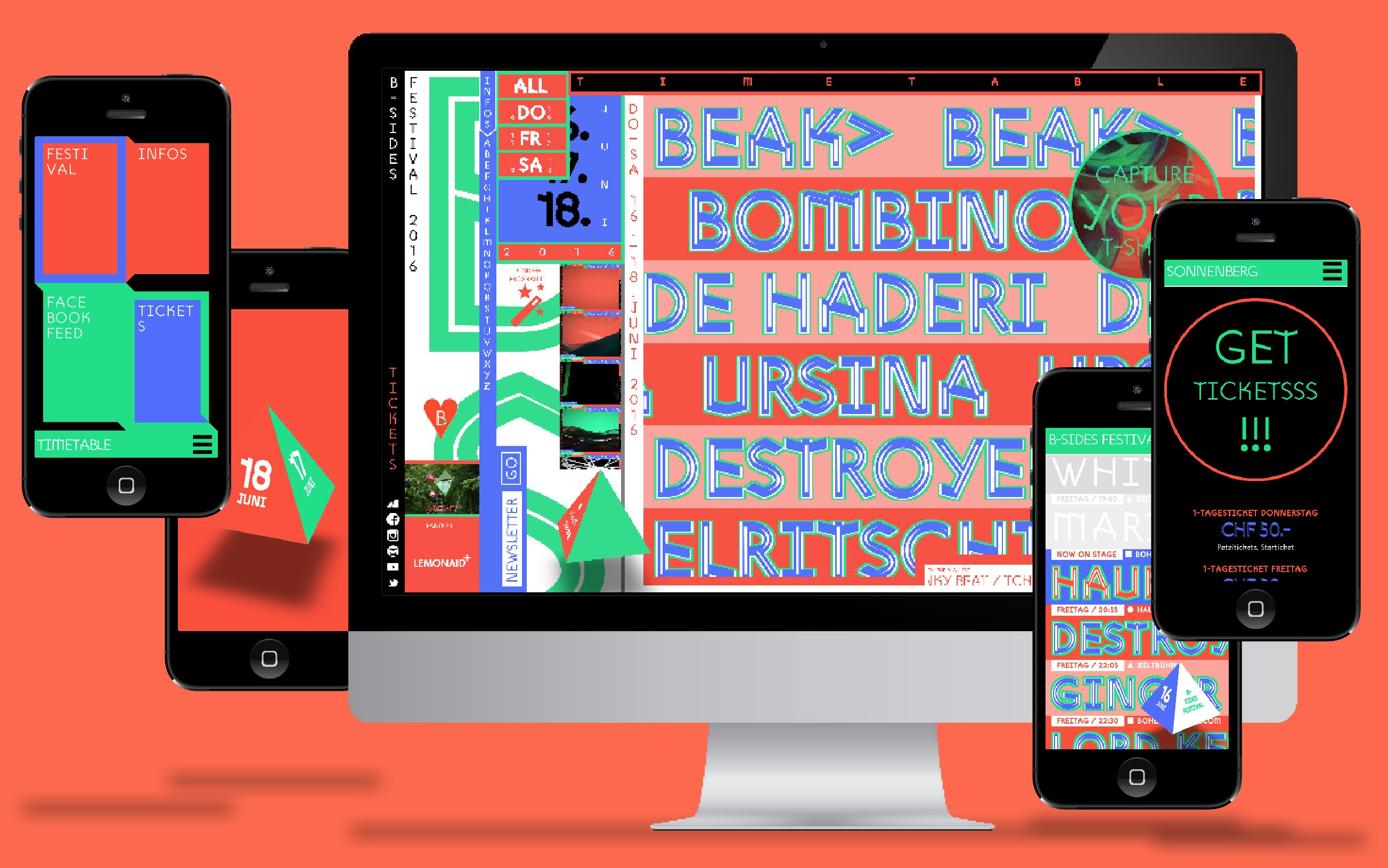 L'identité visuelle et la campagne pour le festival de musique B-Sides est centré autour d'un site internet expérimental, conçu et programmé simultanément, présentant une formidable avalanche de graphiques, d'images, d'animations 3D, de clips audio et de typographie sur mesure. Grâce à l'interaction des utilisateurs, le site nourrit et génère la matière imprimée (affiches, tee-shirts et les guides de l'événement) renversant ainsi la hiérarchie traditionnelle, utilisant habituellement l'impression comme outil informatif de la représentation disponible sur les médias numériques, au lieu d'en être le résultat.