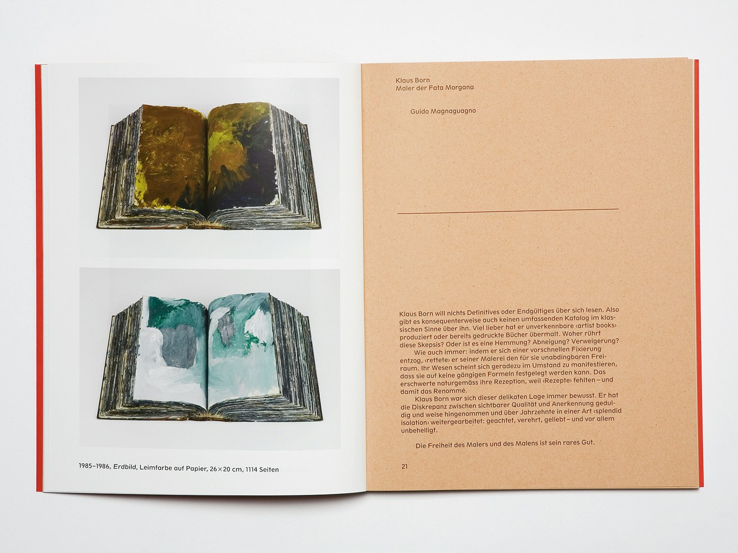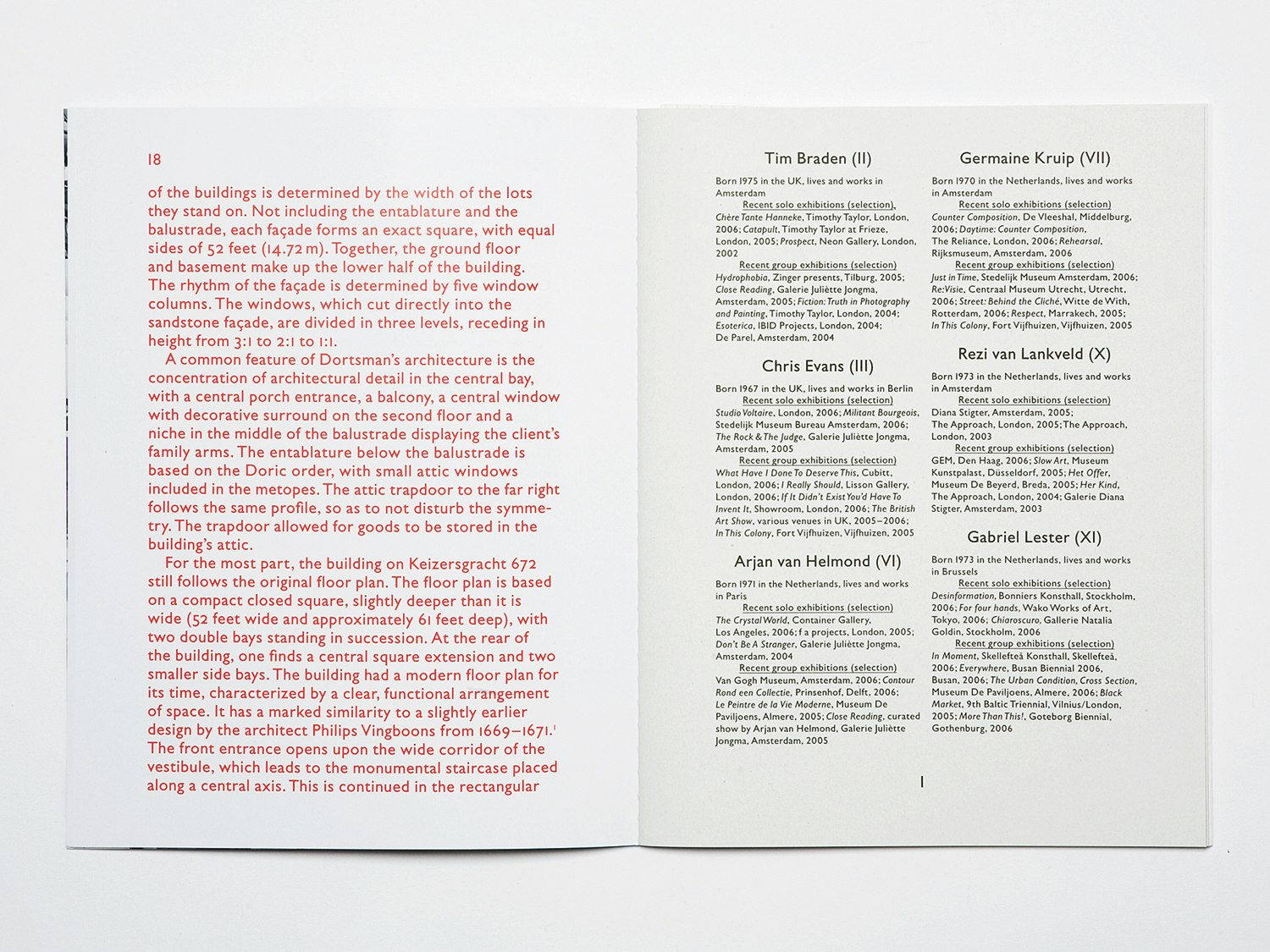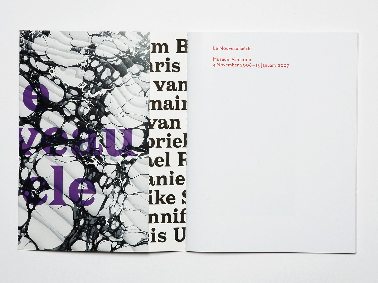 Dans le catalogue d'exposition 'Le Nouveau Siècle', Julia Born (en compagnie de Laurenz Brunner) reprend le signe distinctif principal du lieu d'exposition – à savoir sa symétrie – dans la réalisation du livre. Le Grachtenhaus de 1672 obéit entièrement aux règles de la symétrie, même là où celle-ci n'a aucune fonction. Par exemple, on y a inséré de fausses portes ou agrandi des motifs uniquement pour sacrifier à cet idéal de symétrie complète. Les deux graphistes reprennent cette idée de la façon suivante: ils articulent très strictement le contenu, de manière parfois centrée. Ils ont également conçu la partie images d'une manière originale, en montrant des objets et des lieux de la maison qui, malgré leur composition symétrique, dissimulent en eux une asymétrie. Le titre de la jaquette, devant et derrière, est placé sur axe médian et sert de rabat. A la fois double et à chaque fois coupé en deux, ce titre reste lisible comme un tout sur la couverture. Voilà deux types d'ouvrages qui montrent de manière exemplaire comment Julia Born fait passer le contenu dans la forme.