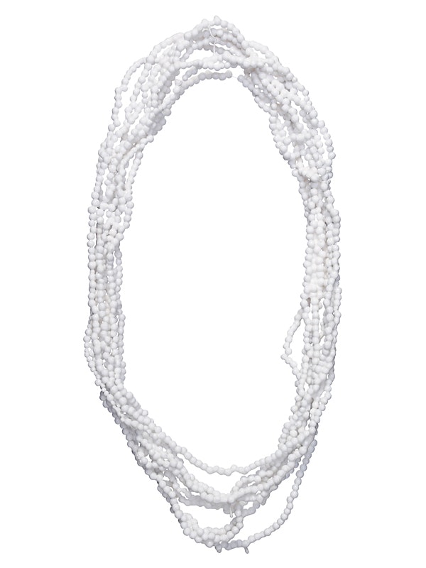 De loin, on dirait un authentique collier de perles. Mais si on le touche, on reste sidéré par sa perception tactile: ce qu'on tient en mains, c'est un collier sans poids, fait de perles en cellophane. La facture de l'objet suggère au premier regard une matérialité naturelle, mais lorsqu'on l'examine de plus près, on découvre qu'il s'agit d'une réfraction ironique. Cette ambiguïté, ce moment où le regard glisse dans la mise en abîme, se retrouve souvent dans l'œuvre de Julie Usel, qui cependant ne se limite pas au geste humoristique, mais offre toujours une alternative intéressante et surtout personnelle à l'objet originel, le collier de perles. Elle expérimente de nombreux matériaux; de la cellophane dont on vient de parler jusqu'à la porcelaine, en passant par la silicone et l'albâtre.
