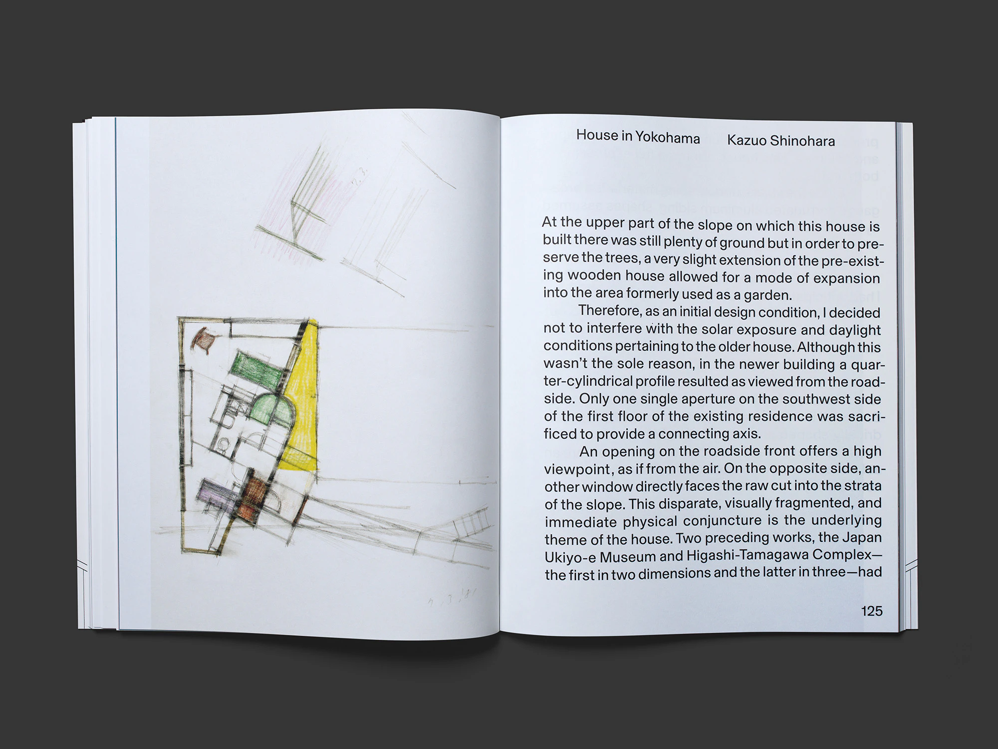 Cet ouvrage broché, essentiellement en noir et blanc et de très grand format, présente trois œuvres issues de différentes phases créatrices de l’architecte japonais Kazuo Shinohara (1925–2006), dans un design somptueux, très élégant. La jaquette d’aspect graphique; des plans extrêmement détaillés, redessinés; des photographies en noir et blanc magnifiquement reproduites; ici et là, des croquis de couleurs pâles; des feuillets colorés pour séparer les parties du livre; des textes courts en grands caractères, en allemand et en japonais: toutes les parties sont traitées indépendamment; mais additionnées, elles forment un ensemble harmonieux. Une section finale plus longue, avec des textes sur deux colonnes justifiées, est animée grâce à une disposition inhabituelle, mais très belle, des illustrations de référence. Quelle que soit l’approche, cette architecture est présentée avec générosité et sympathie, si bien qu’elle apparaît attrayante et parfois même sensuelle. Le livre s’adresse donc à un lectorat qui va bien au-delà du public spécialisé. Cinq designers, pas moins, ont contribué à cet ouvrage. Voilà qui montre l’ampleur du travail accompli, dans un extrême souci du détail.