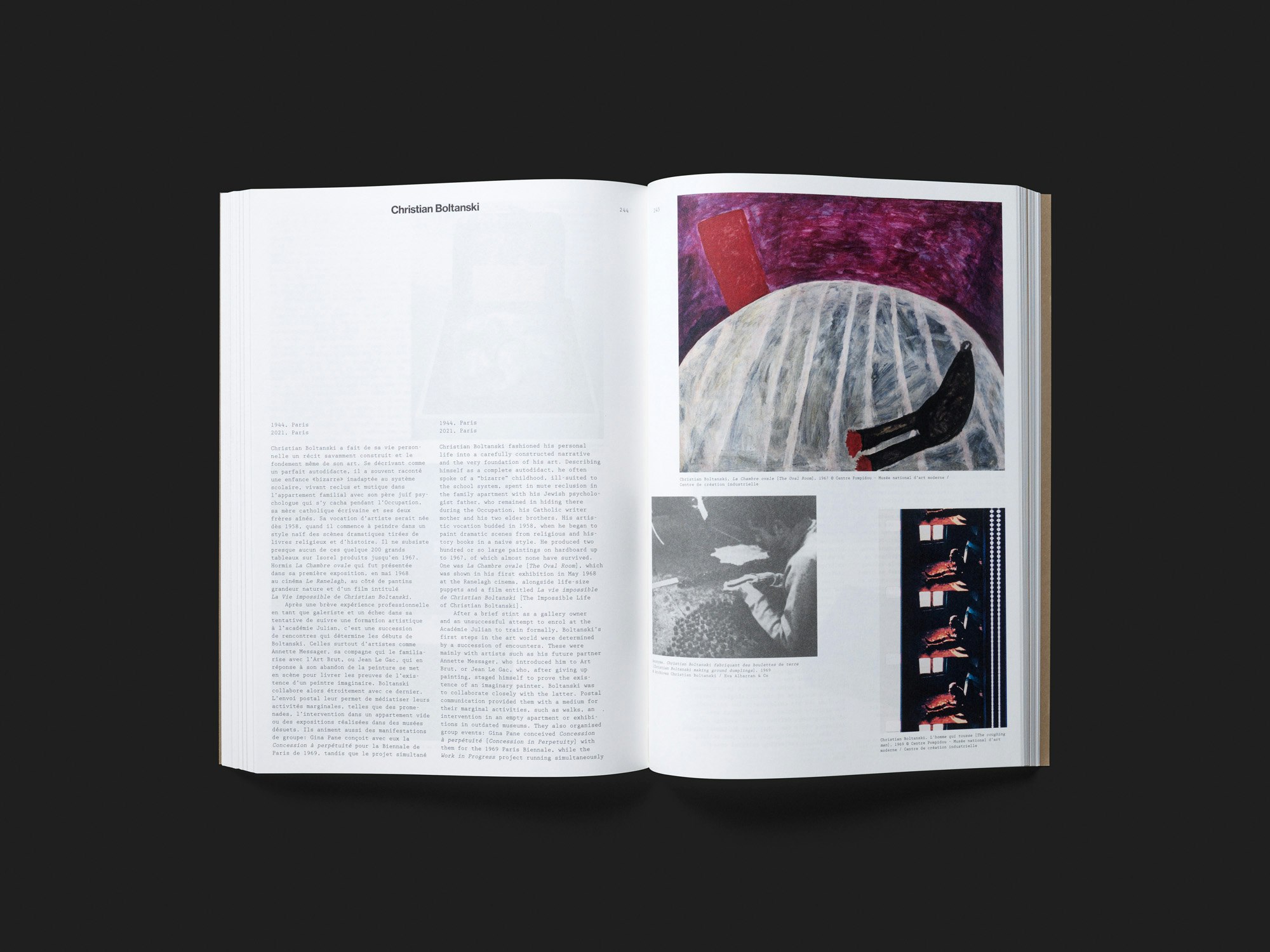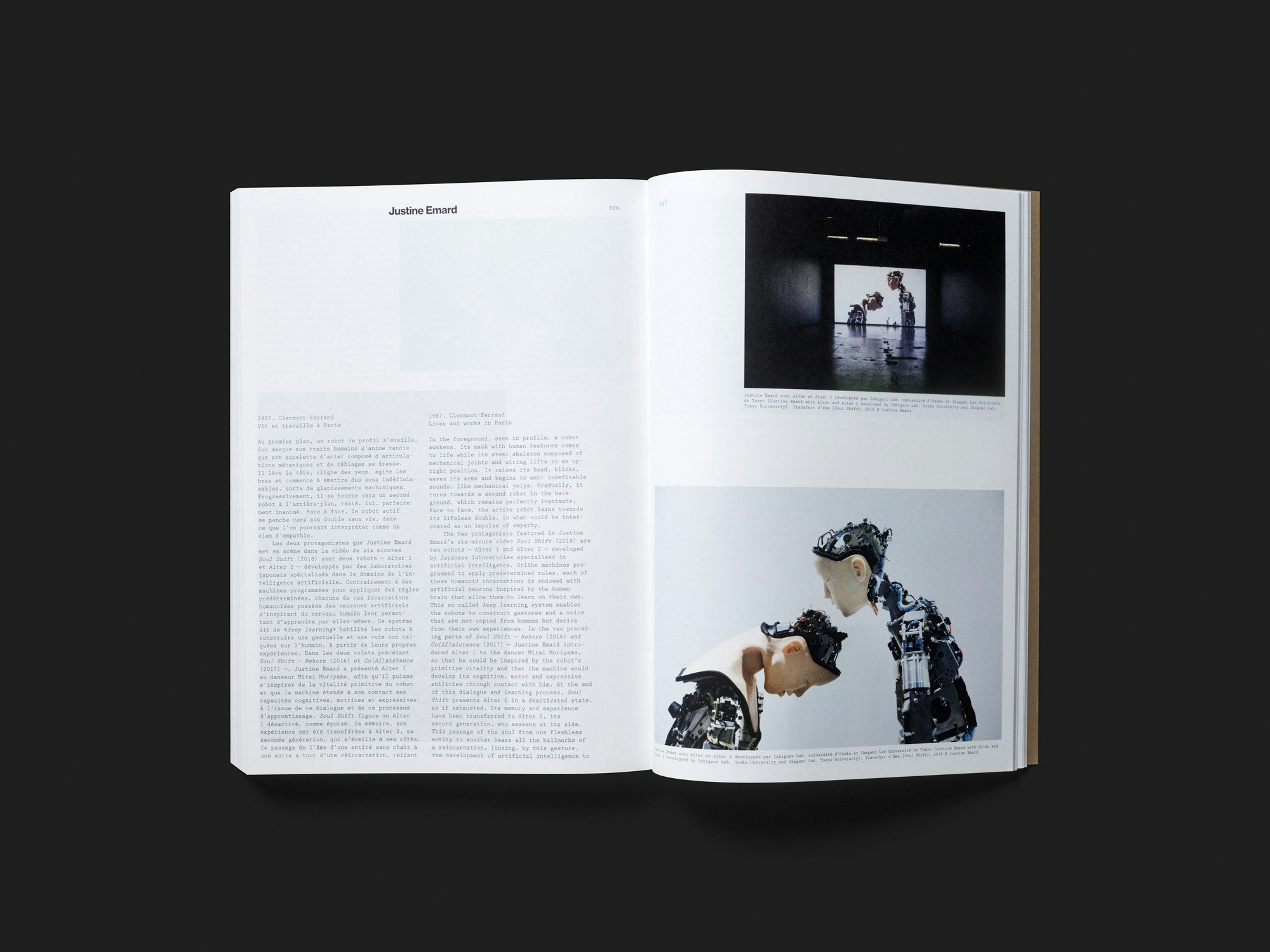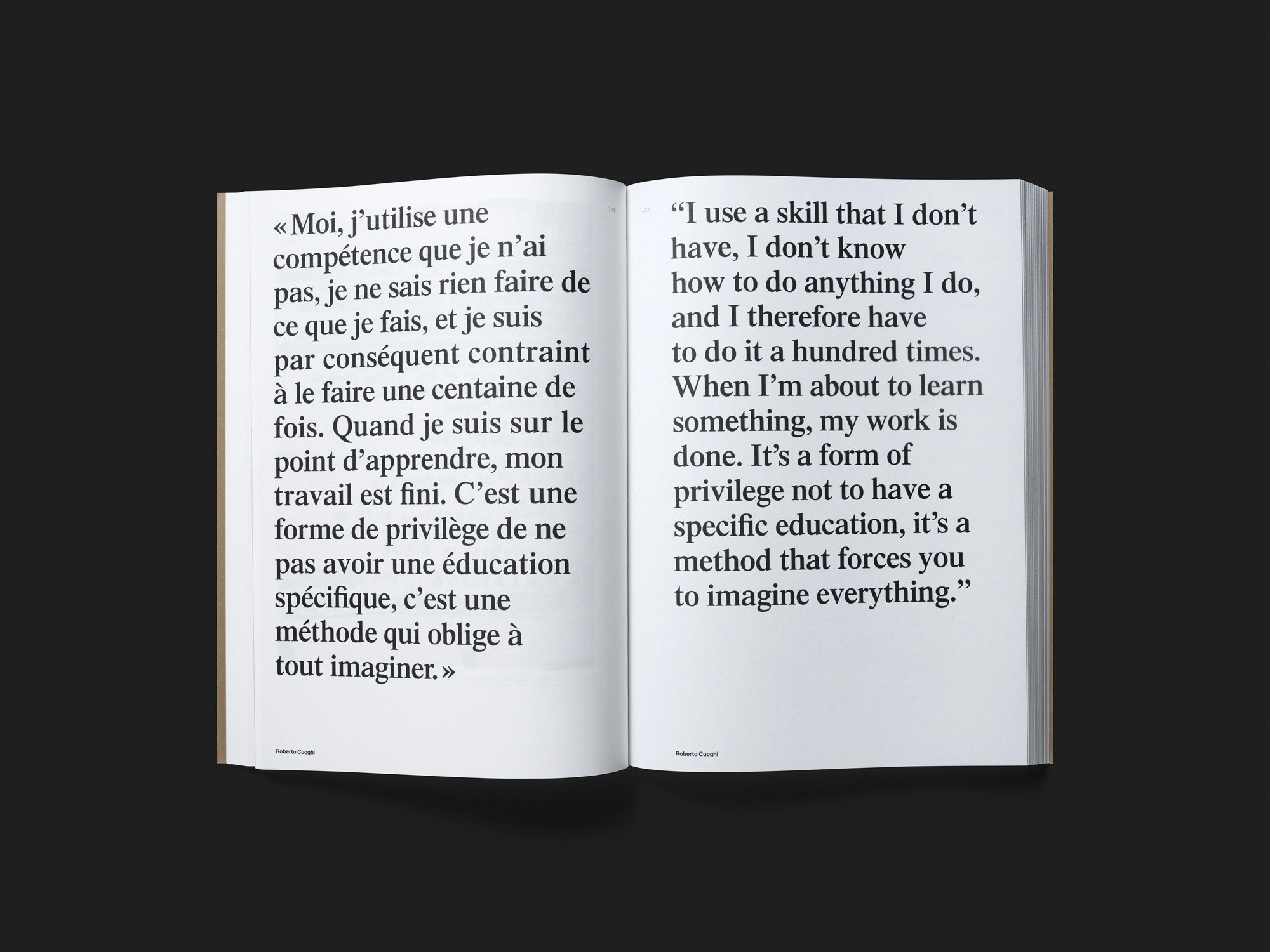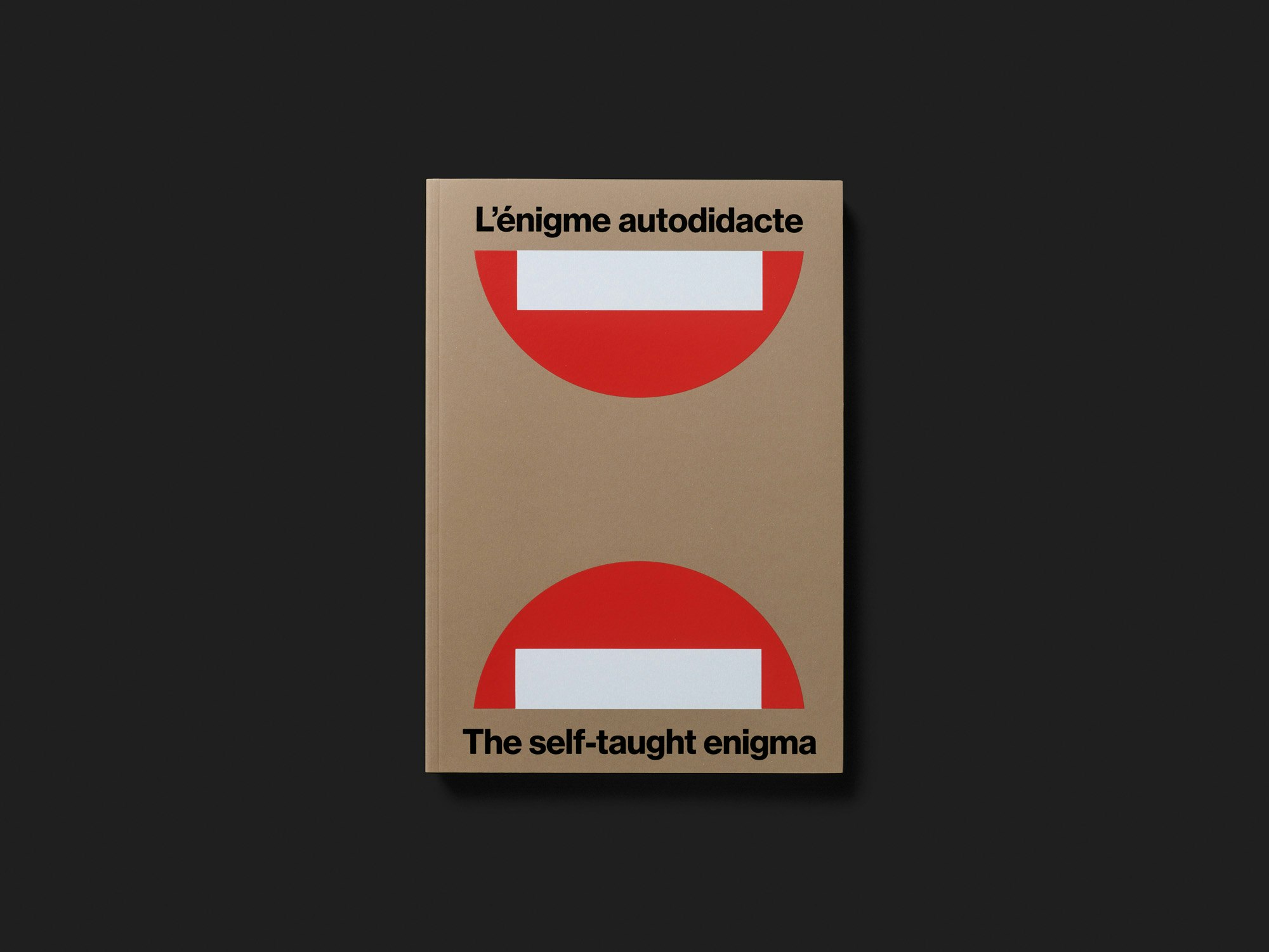Ce catalogue d’exposition consacré à l’autodidaxie dans les arts plastiques, fruit des recherches d’une enseignante en école supérieure d’art, propose une vue d’ensemble simple mais extrêmement riche, servie par une mise en page droite et régulière.Composés sur deux colonnes dans une police à empattement, différents essais précèdent la partie catalogue à proprement parler, qui est organisée en six sections thématiques. Chacune d’entre elles s’ouvre par une feuille de couleur brune – similaire à celle de la couverture souple – et aborde différents procédés et stratégies autodidactes à travers les œuvres de cinq à huit artistes. Deux pages de texte et deux pages d’illustrations sont consacrées à chaque artiste, dont certains et certaines sont célèbres et d’autres à peine ; la maquette reste toujours la même. Pour un catalogue d’exposition doté d’une matière iconographique aussi fabuleuse, l’ensemble paraît presque un peu simpliste au premier abord mais au fil de la lecture, cette présentation très brute s’avère fort convaincante. L’absence de toute forme de hiérarchie ou de narration met toutes les œuvres sur un pied d’égalité, ce qui correspond à la démarche autodidacte. Le travail de mise en page de la première et de la quatrième de couverture mérite tout particulièrement d’être relevé. L’œuvre choisie comme image de titre, un panneau de sens interdit coupé en deux, reflète l’absence de normes propre à l’autodidaxie.