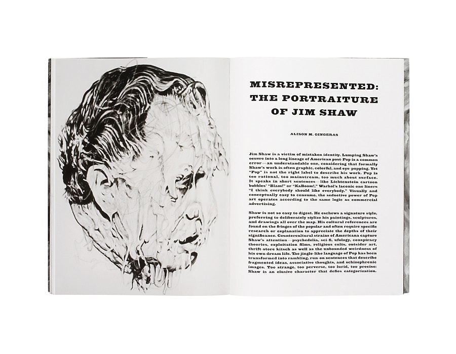 Le livre de grand format 'Jim Shaw. Distorted Faces & Portraits' présente des portraits en pleine page et en gros plans, réalisés au graphite et à l'aérographe. Les dessins, restitués grandeur nature, occupent toute la surface de la page, et l'on peut vraiment dire qu'ils sautent au visage de celui qui les regarde. Pour son projet de police de caractères, Nicolas Eigenheer s'est inspiré de la fonderie allemande 'Bauer', et il a développé la 'Material'. Clairement découpée, un peu rude, avec des sérifs très marqués, elle donne une image directe et claire, et souligne le caractère puissamment original du livre. En contraste avec ce choix, Nicolas Eigenheer a conçu, pour la publication 'Carsten Nicolai', l'écriture 'Px-Grotesk', qui apparaît ambitieuse, sobre, arrondie et claire. Avec son caractère froid, technologique, elle convient aux photographies en couleurs, très brillantes, et aux documents de laboratoire concernant les recherches de l'artiste allemand Carsten Nicolai, qui se meut aux limites de la science, des arts plastiques et des sons. Le livre d'artiste 'Ari Marcopoulos, The Chance is Higher' montre des photocopies de photographies personnelles que l'artiste a réalisées sur une période de trente ans. L'écriture créée pour lui, 'Sonoma', reflète la fragilité de ce projet intime, grâce à son dessin arrondi, discontinu, en filigranes.
