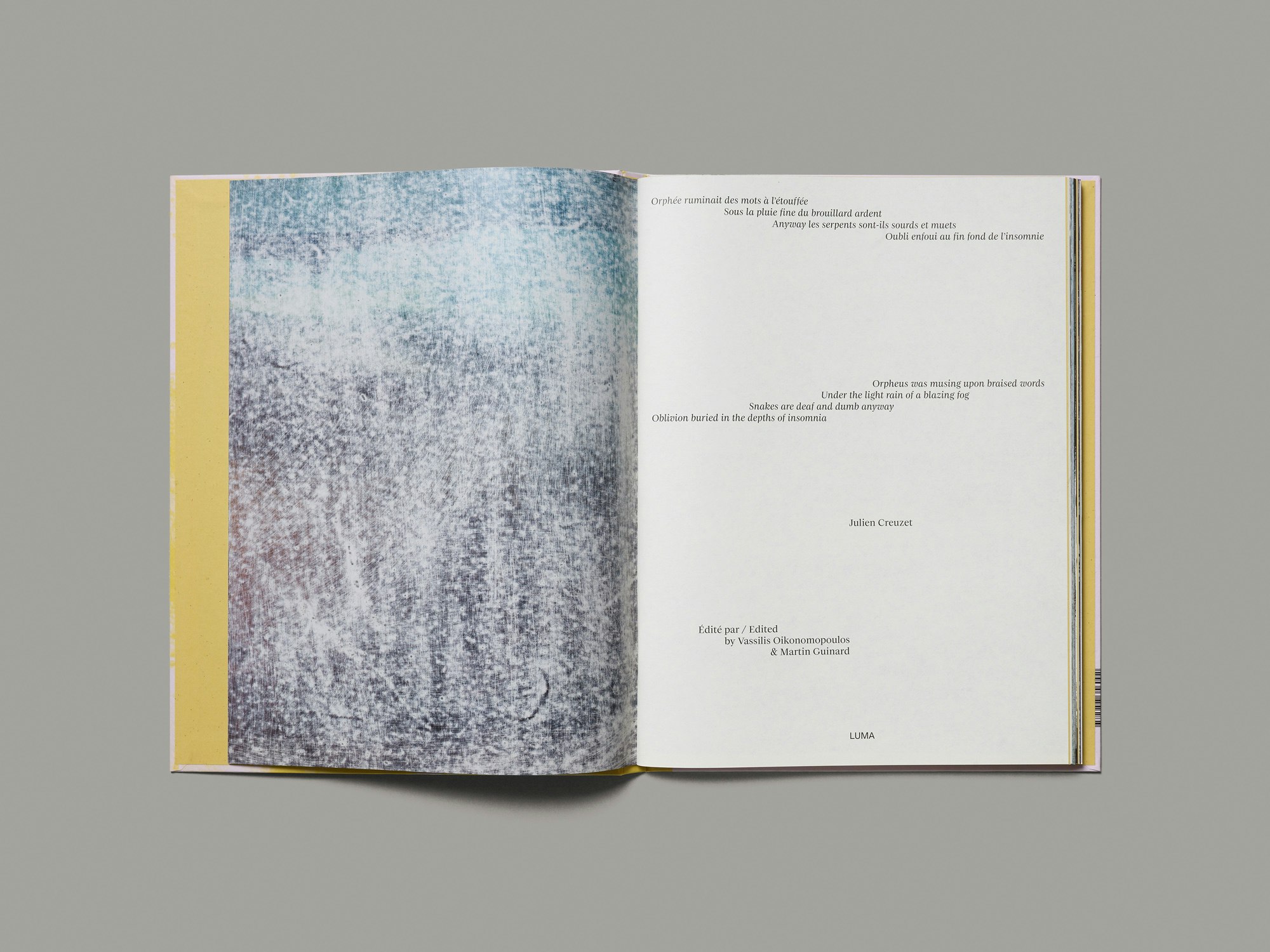 Ce catalogue d’exposition tout en couleurs du jeune Martiniquais Julien Creuzet se distingue de premier abord par sa finesse artisanale : une liasse de trois papiers différents a été adaptée à l’aide de trombones à une couverture en carton avec dos. L’utilisation alternée des papiers structure les différentes parties de l’ouvrage. Certaines sont textuelles, d’autres illustrées, toutes sont indépendantes et s’harmonisent pourtant bien. Certains textes sont imprimés sur deux types de papier non couché aux tons jaunes, présentés dans différentes maquettes et presque exempts d’illustrations. Une série de lettres adressées à l’artiste et le chapitre d’un livre d’André Breton des années 1940 sont encartés sous forme de photocopies à fort contraste. Les cinq parties illustrées sont imprimées à fond perdu : l’une porte des dessins et peintures figuratives de Julien Creuzet ; les quatre autres présentent des fragments de peintures anciennes de couchers de soleil sur la mer que l’artiste a photographiées dans des livres d’art puis retouchées pour en supprimer tout élément figuratif. L’exposition présentait ces éléments abstraits dans des caissons lumineux accrochés au plafond qui contribuaient à l’éclairage des lieux. Le papier couché du livre fait ressortir ces fascinantes variations de couleurs. Le traitement graphique de chaque élément est brut et direct et dégage à la fois une nonchalance très agréable et une puissante énergie. Le livre se passe totalement de blanc.