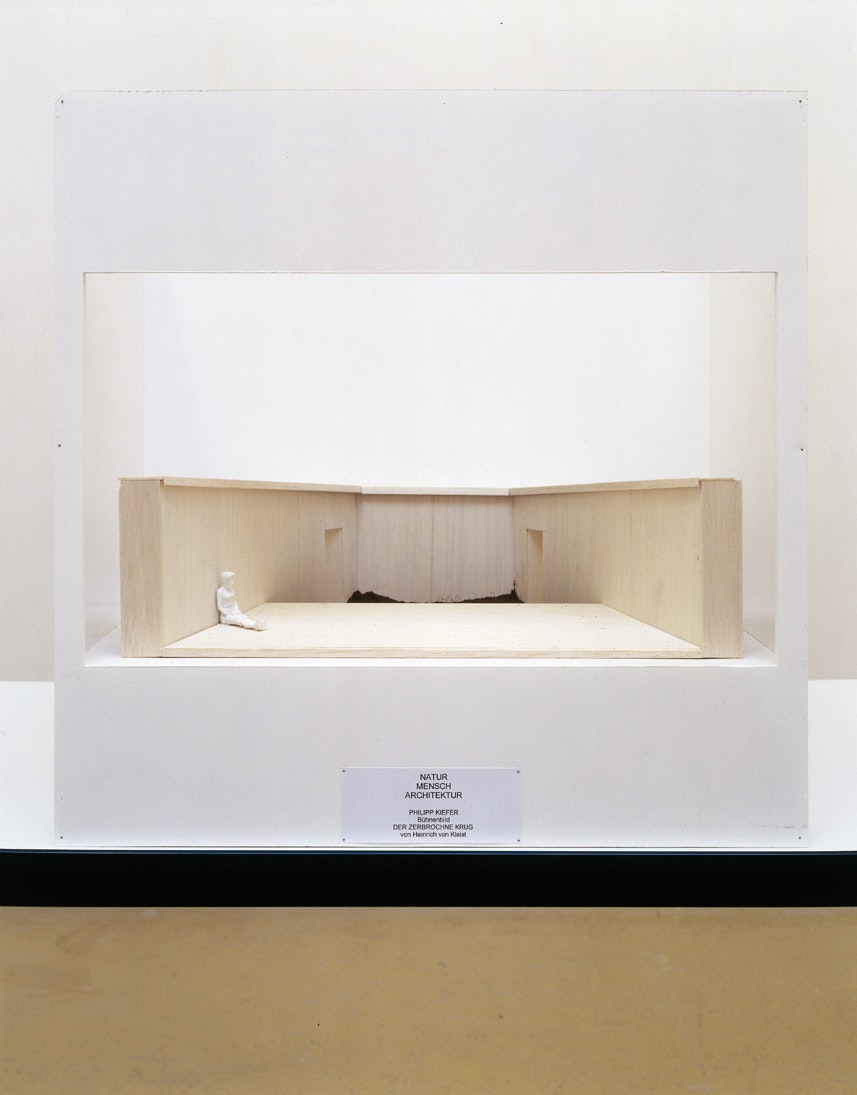 Le décor pour 'La cruche cassée' de Heinrich von Kleist comprend dans un espace unitaire à la fois un intérieur et un extérieur, dans une architecture campagnarde. L'installation propose une perspective rétrécie, comme une boîte à images. Le dispositif scénique, simple et réduit, crée une extrême concentration spatiale, avec une claire subdivision, selon l'horizontale, en deux niveaux. Cette situation est abstraite en un espace scénique fondamental. Philipp Kiefer l'utilise habilement: pour l'œil, la ligne d'horizon devient une corde, et le personnage principal devient un danseur de corde. L'espace intérieur symbolise ainsi la situation du juge Adam, qui se trouve coincé toujours plus à l'étroit; l'espace se transforme en piège, devient une tombe qu'il se creuse lui-même. Le monde visible reflète le monde intérieur du personnage d'une manière pénétrante, et fonctionne comme une métaphore convaincante de sa situation. Les costumes solides, taillés dans le feutre, à la coupe franche, sont des enveloppes rigides qui limitent considérablement les possibilités de mouvement des personnages, exprimant ainsi leur grande inhibition intérieure.