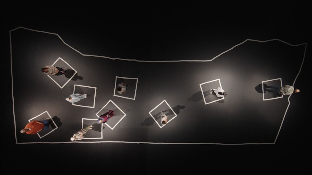 Une carte de Gaza, ses villes, camps et quartiers. Peinture blanche sur un sol noir. Dans les contours tracés sommairement, neuf réfugiés qui ont pu échapper à l’enfer, racontent. Leurs vies d’avant, la perte des êtres chers. Des existences oppressées, mais pas encore réduites en cendres. En partageant leurs récits, les protagonistes tentent de se reconnecter à eux-mêmes, de cesser d’être des fantômes. De revenir, peut-être, à la vie.
