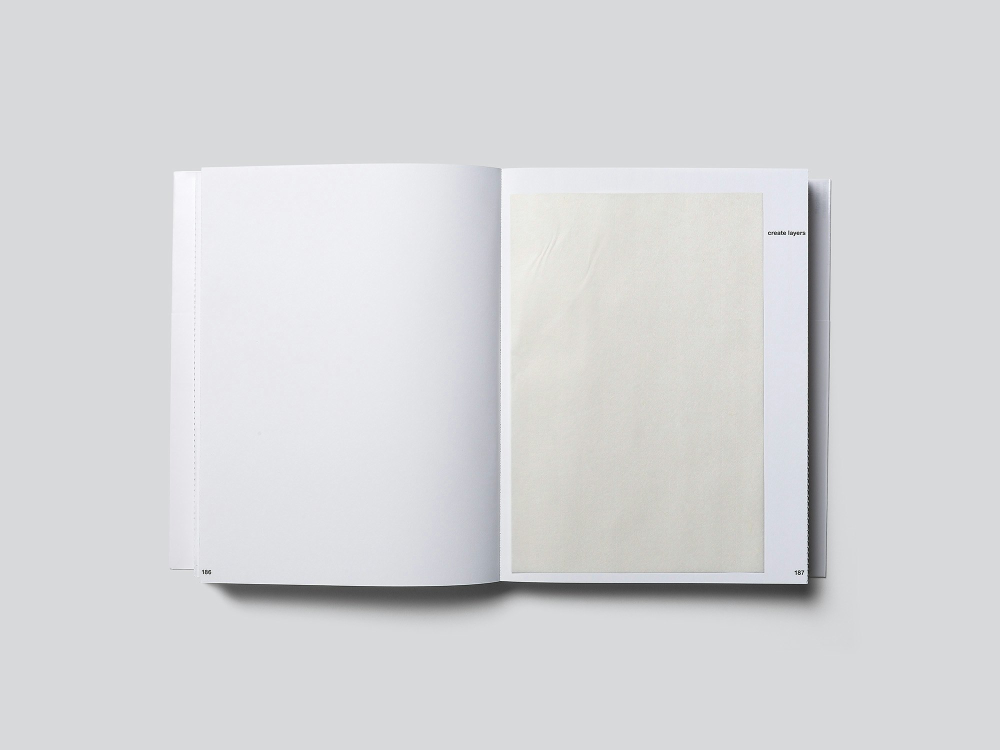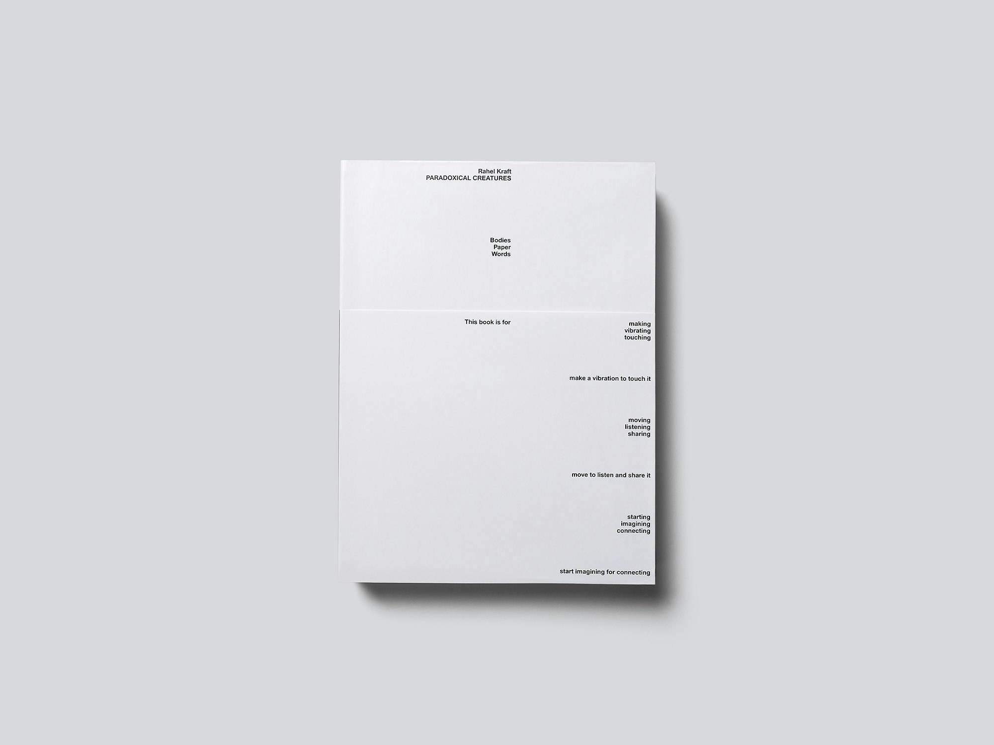 L’artiste sonore suisse Rahel Kraft propose un livre en noir et blanc de près de 500 pages à la reliure japonaise qui traduit de manière tout à fait étonnante les bruits en typographie et la performance artistique en livre. Les pages immédiatement accessibles de la reliure japonaise portent, composées dans la même police et le même corps, un peu plus de deux douzaines de « Text Scores », des « partitions de mots » que les lecteurs et lectrices peuvent interpréter pour créer des performances. Les indications succinctes ne comprennent souvent que quelques mots par double page et laissent beaucoup de place à l’improvisation. Chaque indication s’inscrit dans l’une des sept « dimensions » de la performance – comme « temps », « espace » ou encore « métaphore et sentiment ». Elles sont listées de haut en bas sur des feuilles de registre rigides intercalées entre les différentes partitions et les indications occupent la partie de la page correspondant à leur « dimension ». La moitié des pages est uniquement accessibles en détachant les feuillets. On découvre alors sur certaines d’entre elles un essai relativement long ainsi que des « graphic scores » disposées sur des doubles pages qui proposent des sortes de masques pour les performances. Le caractère performatif de l’ouvrage se fait sentir dès la lecture, à travers le toucher des feuilles parfois souples, parfois rigides ou le son produit par la séparation des pages. La très haute prétention conceptuelle va au-delà de la forme conventionnelle du livre, mais les moyens formels tels que l’usage systématique du noir et blanc ou du même corps de caractère restent étonnamment simples.