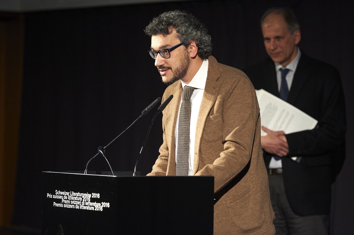 La quatrième cérémonie des Prix suisses de littérature a eu lieu le 18 février 2016 dans la salle de lecture de la Bibliothèque nationale suisse à Berne, en présence de M. le conseiller fédéral Alain Berset.