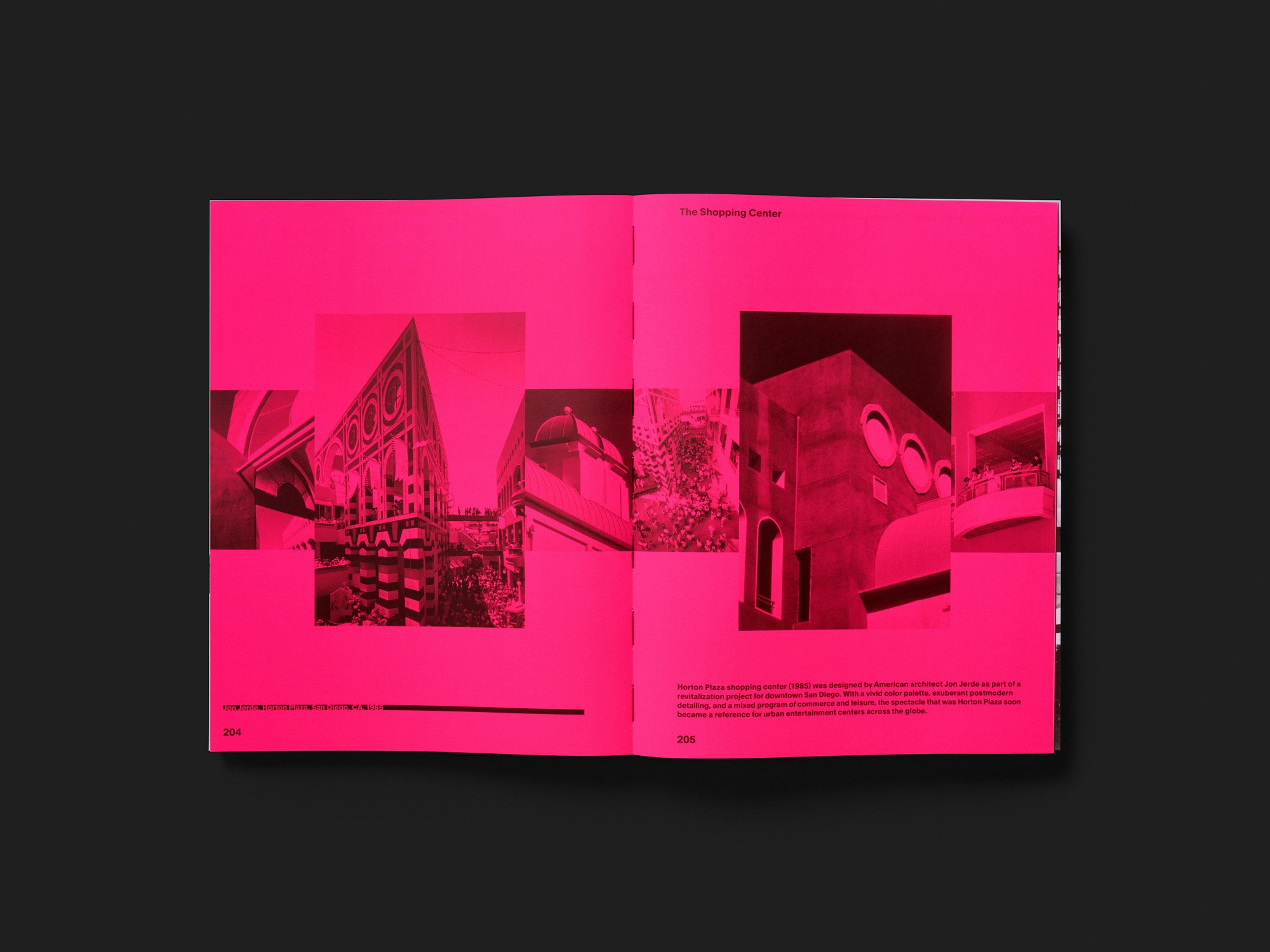 Ce lourd volume de plus de 600 pages, qui propose une lecture du déclin du commerce de détail par le biais de la théorie de l’architecture, séduit grâce à une idée graphique aussi simple qu’efficace : une double page sur deux est rose fluorescent. À la lecture, l’alternance répétitive entre les fonds blancs et roses – tandis que les textes et les images sont imprimées en noir – soumet la vision à une stimulation permanente qui peut provoquer un scintillement devant les yeux. Les titres en gras qui figurent sur de nombreuses doubles pages finissent de donner à l’objet un aspect vulgaire qui s’accorde néanmoins bien avec le sujet autant qu’avec la notion d’effondrement systémique suggérée par le titre. La mise en page n’est pas chaotique pour autant. De nombreux textes, certains contemporains, d’autres plus anciens, richement illustrés, abordent la thématique sous l’angle de l’architecture, de l’art, du design ou de la mode. Différentes maquettes sont utilisées pour la mise en page de ces contributions. La composition identique de tous les introductions et titres courants facilite la navigation. Un peu comme si on se déplaçait à l’intérieur d’un écrit en ligne truffé de liens hypertextes, on peut se reporter à sa guise aux divers renvois et références. Il s’agit ici de l’une des rares publications de la liste restreinte du concours de cette année qui se consacre à une question d’actualité sociopolitique.