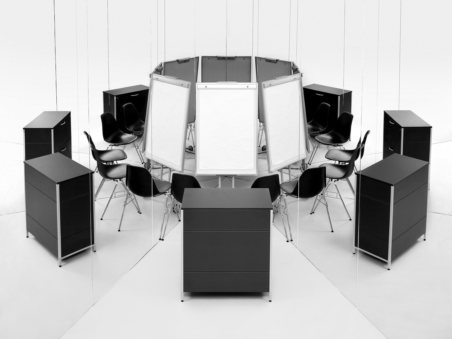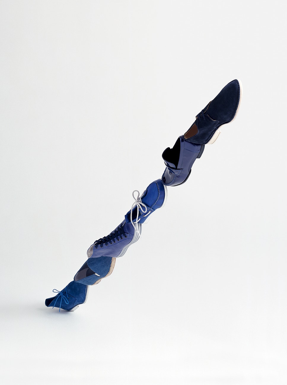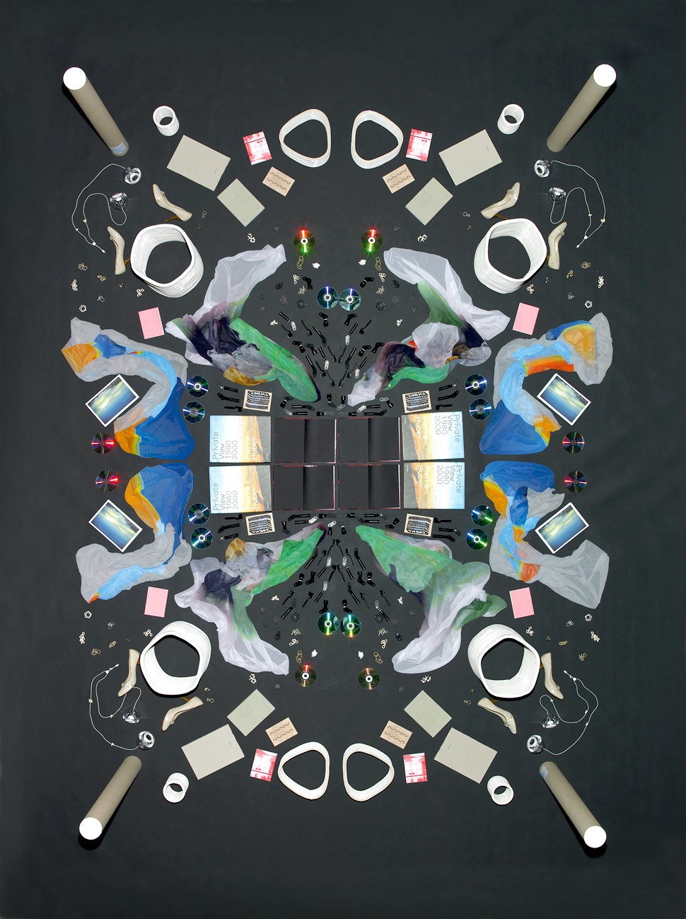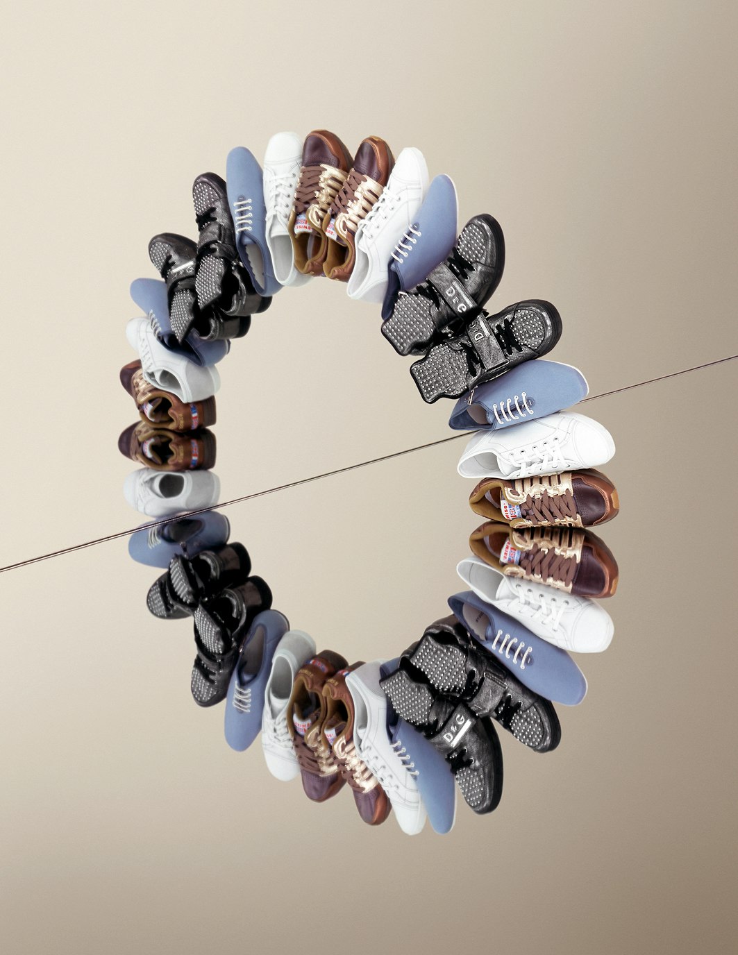 Pour le travail exécuté à la demande du magazine Another Man, des cravates, des chaussures de sport ou des ceintures sont réfléchis autour de leur axe, ils forment ensemble une structure géométrique délivrés de l'apesanteur. Ces jeux de réflexion sont menés à l'absurde dans les photographies réalisées pour le catalogue 'Bourses fédérales de design 2007'. Les travaux primés ont été photographiés d'en haut, de quatre manières, sur un échafaudage construit exprès pour la mise en scène, puis recomposés en une seule image. A quatre reprises, le photographe a lui-même arrangé chacun des objets sur le sol, ce qui ne se remarque qu'à d'infimes détails. Un travail considérable devant lequel il ne recule pas, même à l'ère de PhotoShop.