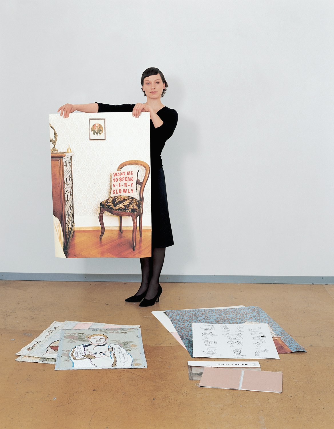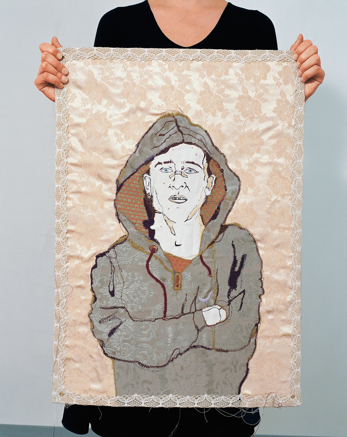 Plus on plonge dans le travail de diplôme de Sandrine Pelletier, ‘Wild Boys', plus il devient troublant. Ce qui, au premier abord, ressemble à des agencements intérieurs mis en scène du XIXe siècle, s'avère être, lorsqu'on y regarde de plus près et que l'on en déchiffre les éléments ornementaux, un regard sur un monde totalement opposé: les motifs de base des housses de coussins, des napperons au crochet et des papiers peints sont inspirés de la vie quotidienne de lutteurs de 'backyard wrestling'. Ce contraste atteint son maximum dans les portraits brodés et cousus, réalisés dans des tons pastels jaunis, de ces personnages plutôt chez eux dans le monde souvent brutal des arrière-cours qu'au milieu des tissus fins utilisés ici. Dans un souci de cohérence, la présentation est complétée par une carte d'échantillons dans laquelle chaque objet est offert à l'expédition, avec indication du délai de livraison et instructions d'entretien. La démarche audacieuse de Sandrine Pelletier, qui ne craint pas d'entrelacer deux univers opposés et ‘coud ensemble', à gros points, leurs symboles de réussite personnelle‚ en impose, car le résultat est un travail aussi complexe que sournois, et d'une force fascinante.
