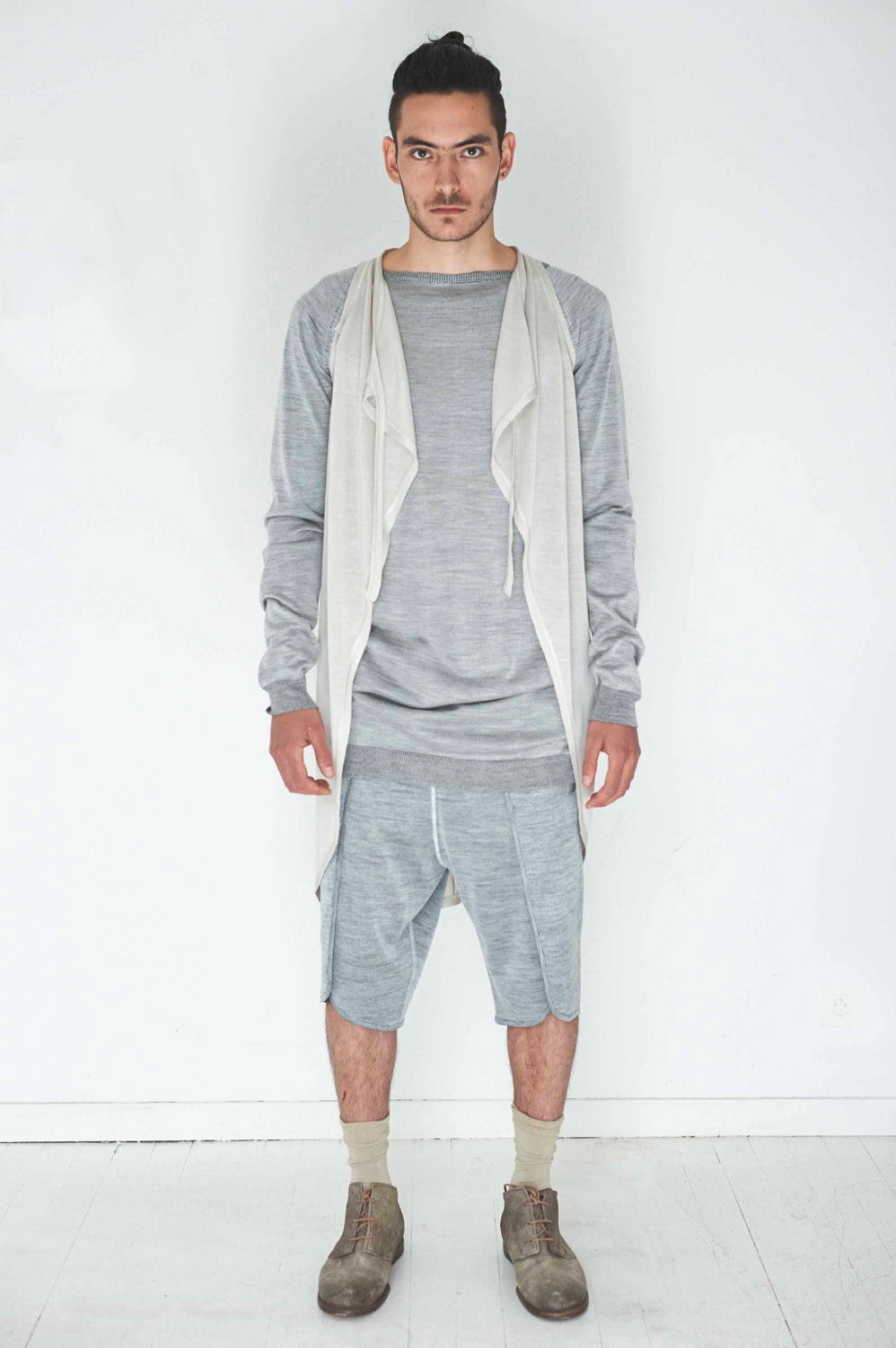 La collection présentée séduit par la clarté de la coupe et l’usage de matériaux traditionnels qui donne vie à cette mode masculine tant au plan visuel que tactile. Dans ses compositions, le designer combine les matériaux naturels les plus divers, convoquant cuir fin, corde brute, feutre, lin, laine, cachemire, porcelaine et corne. Le langage formel et matériel qu’il emploie rappelle clairement les paysages rudes et arides de l’Italie du Sud rurale, où la famille de Marzo puise ses racines. Il joue sur des coupes claires et unifiées qui s’inspirent d’habits liturgiques, des robes de moine, de vêtements de prêtre voire d’uniformes militaires. La palette adoptée par le designer est tout aussi intelligible: couleurs sourdes telles gris, blanc, noir, beige, sable et vert foncé dominent.