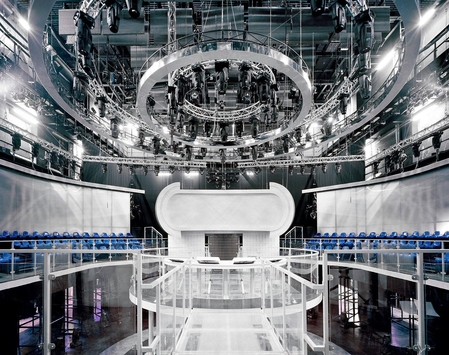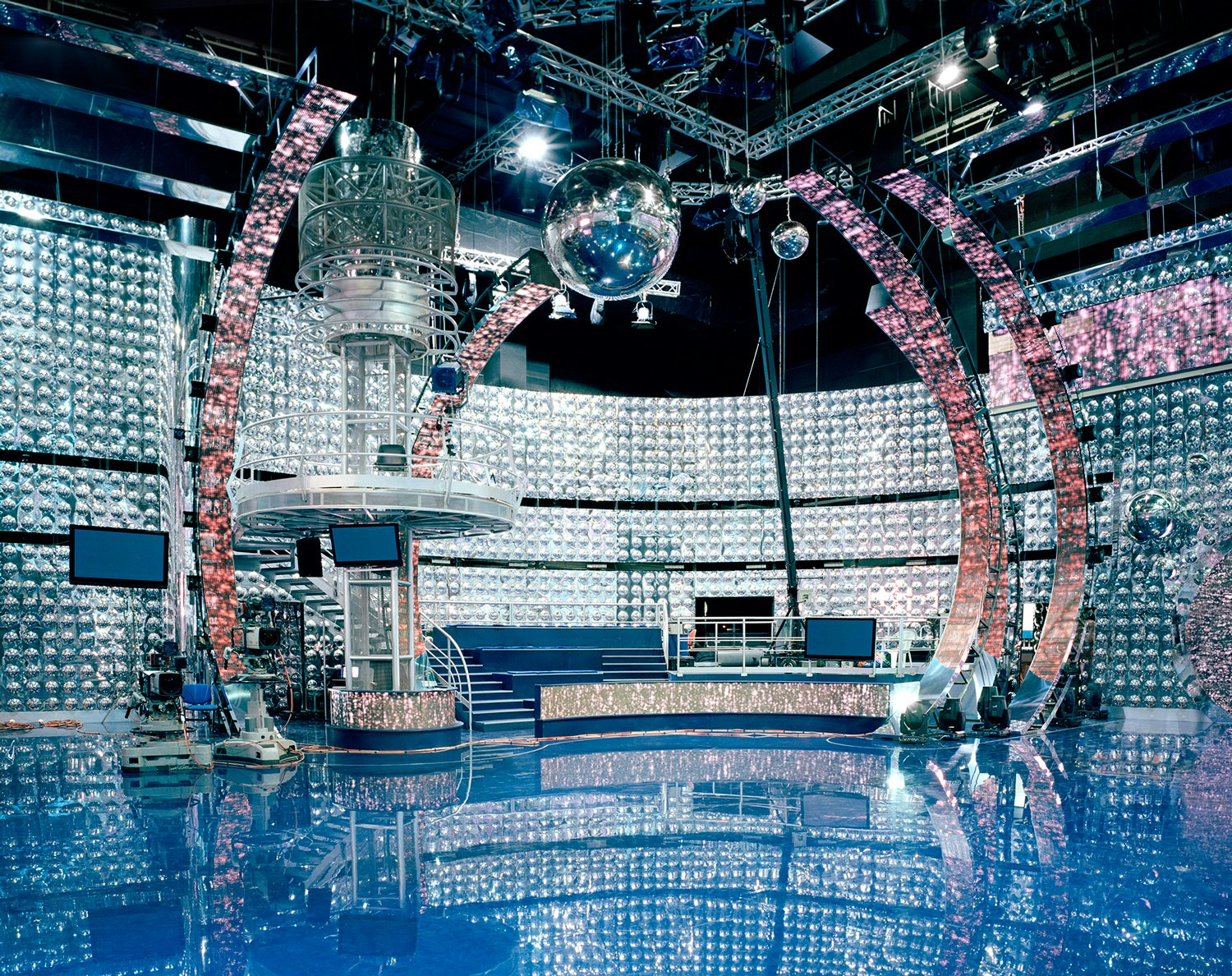 Née dans la partie italophone de la Suisse, le projet de Simone Cavadini à propos des postes de télévision questionne l’exercice du pouvoir dans le contexte du divertissement. Utilisant un appareil grand format, les photographies de Simone Cavadini révèlent des structures hyper baroques, saturées de lumière et mettant en valeur une vision de l’excès par l’accumulation d’éléments. L’utilisation d’impressions brillantes contribue à cet effet dans la tradition documentaire.