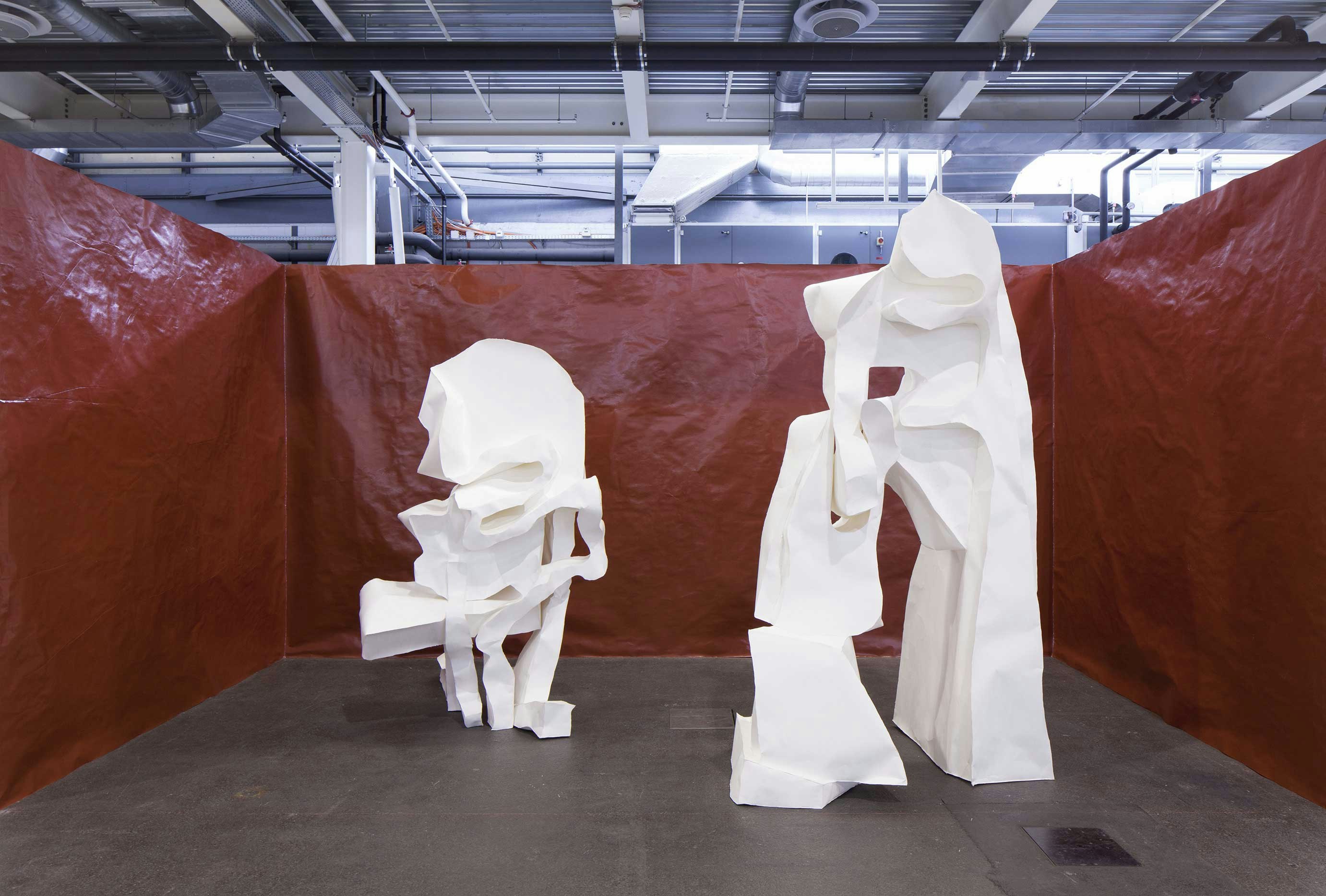 Simone Holliger réalise de grandes sculptures en papier, qui prennent l’allure de maquettes géantes ou de menhirs ancestraux. Faites de morceaux de papier assemblés et collés, ces formes à l’équilibre fragile possèdent un caractère bricolé assumé et renvoient formellement autant aux peintures d’Alberto Magnelli qu’aux maquettes de Thomas Demand. A l’image de la tôle froissée de John Chamberlain, l’artiste fait des accidents du papier manipulé la force poétique de son oeuvre. La surface mate des objets contraste avec le décor brillant, en papier lui aussi, qui recouvre les trois murs. Par cette installation ambitieuse et sensible, Simone Holliger revendique une esthétique de la vulnérabilité à la fois personnelle et maîtrisée.