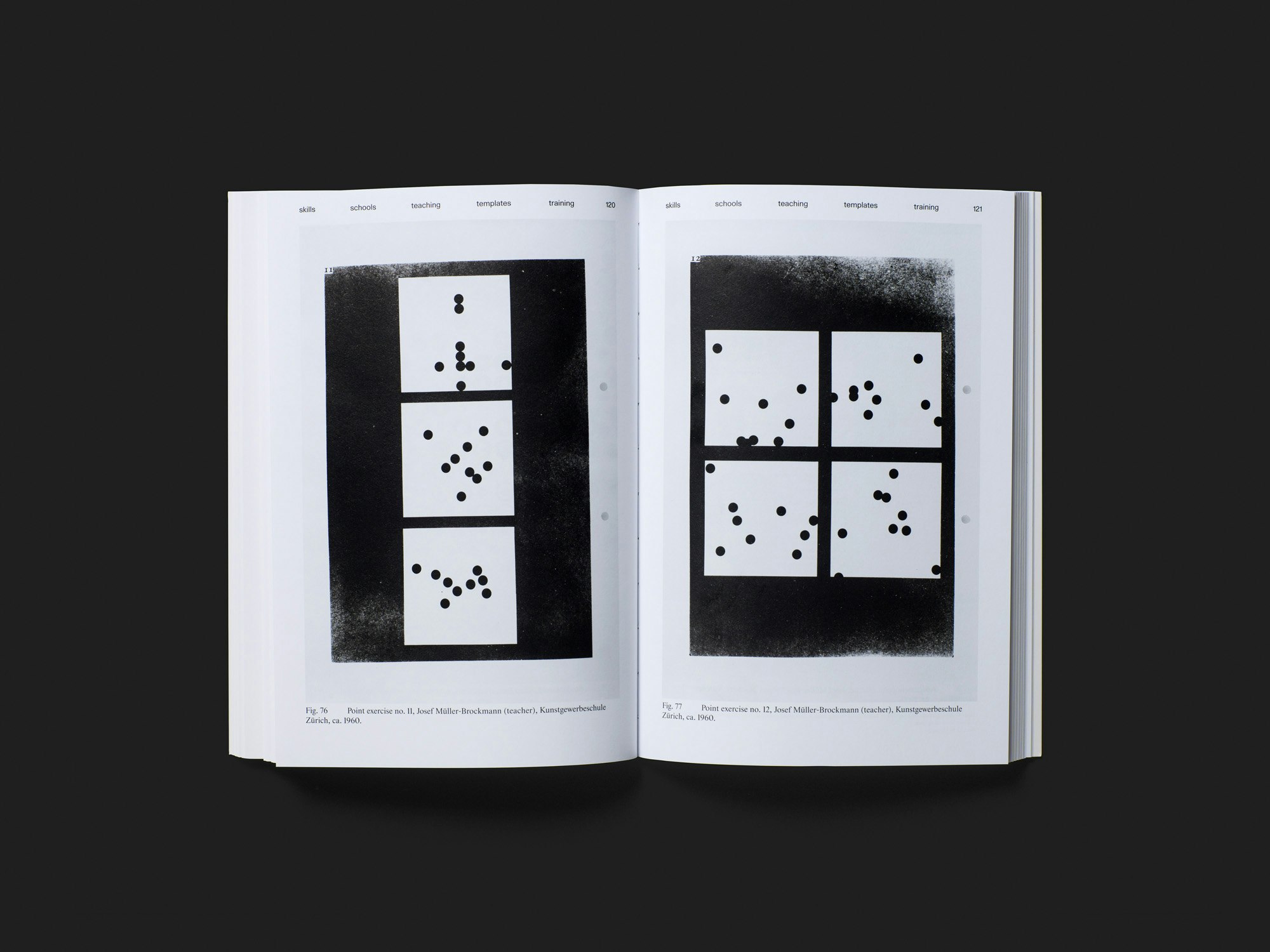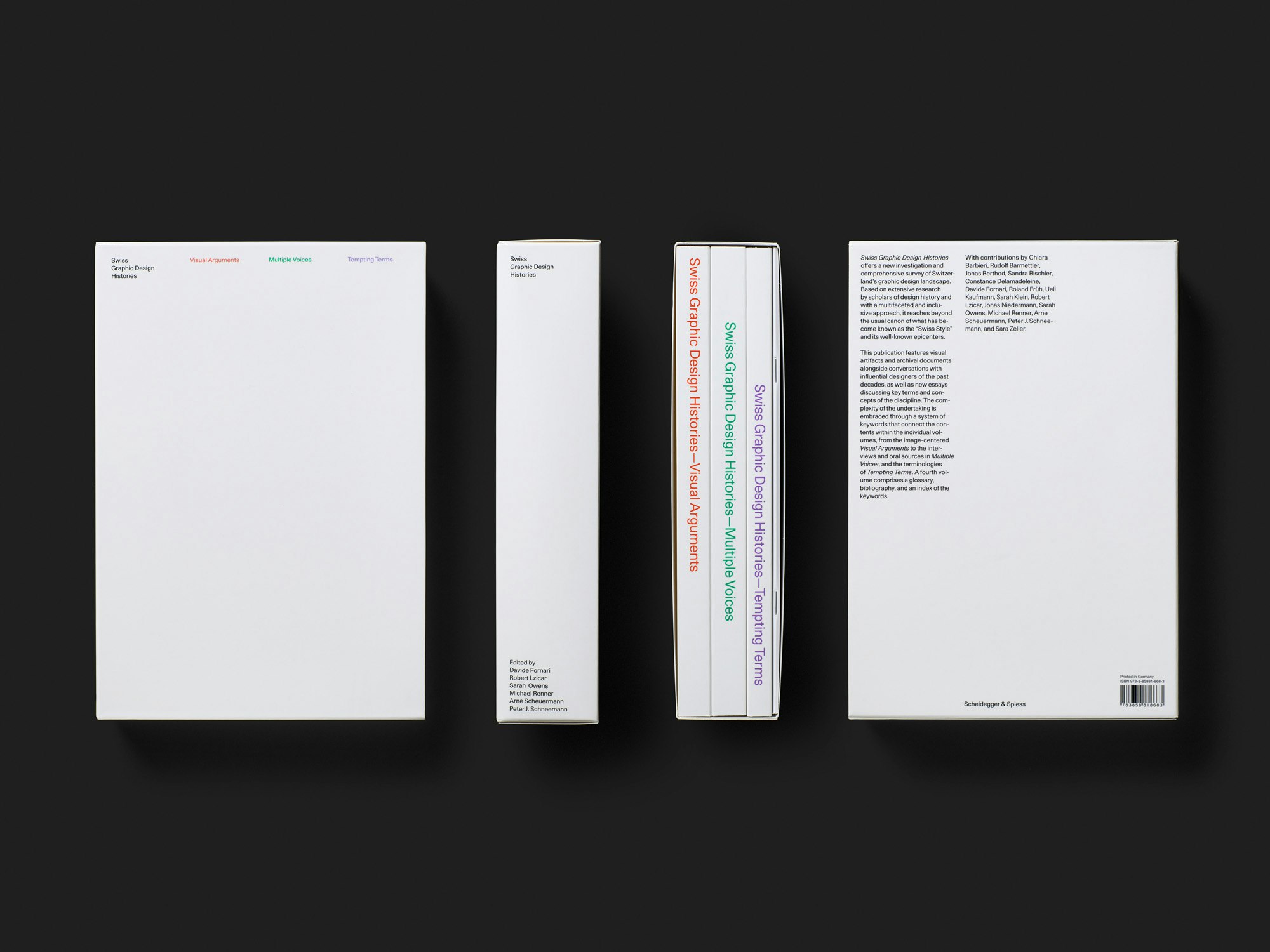 Cette publication est l’aboutissement d’un vaste projet de recherche mené par plusieurs écoles supérieures sur le « style suisse » de l’après-guerre et, grâce à une conception graphique astucieuse, il ne s’agit pas d’une énième célébration à la gloire d’un sujet rebattu. Les trois volumes de petit format, dont les couvertures souples blanches portent chacune un titre en petits caractères d’une couleur différente, sont discrets et exposent avec sobriété les différentes thématiques. Les trois titres sont placés à des hauteurs différentes, sur lesquelles sont alignées les pages de textes à l’intérieur ; cette hiérarchisation a pour effet de laisser des blancs de tête plus ou moins importants selon le volume. Un système de navigation présentant de longs titres courants, constitués pour chaque contribution d’une association de plusieurs mots clés, crée une structure commune aux trois volumes. Si, comme c’est souvent le cas lorsqu’il s’agit d’ouvrages consacrés au « style suisse », les mises en page citent des principes de grilles éprouvés, le travail sur les zones s’effectue ici de manière relativement enjouée. Le travail conographique est particulièrement pertinent puisque des choix et des agencements souvent inédits permettent de mettre en lumière des œuvres et des personnalités moins connues.