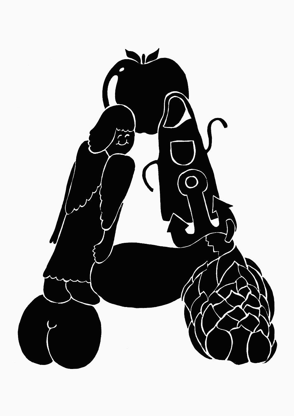 Le cahier 'Alphabet' a été réalisé en collaboration avec le groupe d'artistes lausannois 'Körner Union' (dont l'un des membres, Sami Benhadj, a également été récompensé cette année) et édité par Rollo Press. Divers objets qui commencent tous par la même lettre et qui sont dessinés sur un mode ludique, cru et tout simplement amusant, forment finalement la lettre elle-même. Au fil des pages, on rencontre ainsi une foule d'ustensiles quotidiens et de babioles insolites, qui permettent simultanément de réactiver ses connaissances d'anglais. Le cahier donne également la solution. La liste des objets dessinés est imprimée en-dessous ou à côté de chaque lettre traitée grossièrement. Tatiana Rihs parvient avec brio à instaurer un équilibre entre un aspect brut des illustrations et un dessin extrêmement soigné des détails ainsi qu'une rigueur dans la mise en page.