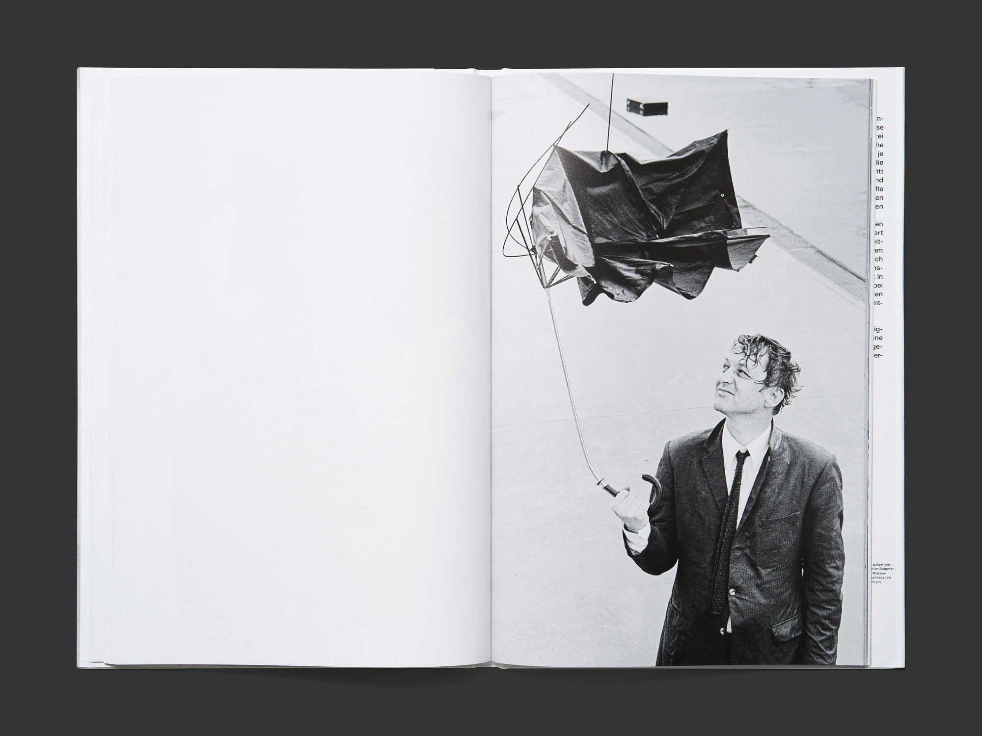 Ce livre de photographie cartonné avec jaquette, peu épais mais lourd, propose avec la publication d’une série de prises de vue inédites réalisées en mai 1969 un accès aussi original qu’éclairant à ces documents d’archives. Les plus de 60 photographies noir et blanc, systématiquement reproduites à fond perdu sur les pages de droite et sans aucun paratexte, montrent un journaliste du magazine « Sie und Er » coquettement vêtu, avec attaché-case et parapluie, qui s’en va tester les tout nouveaux canons à eau de la police municipale de Zurich et finit trempé jusqu’aux os. Alors que les images relèvent du reportage journalistique et n’avaient pas vocation à être publiées sous forme de série, cette présentation les place du côté de l’art conceptuel et performatif de l’époque. En même temps, elles forment aussi un témoignage visuel qui offre, à travers cette figure inédite de manifestant, un regard surprenant sur le contexte politique agité qui régnait à Zurich. De la taille au format, en passant par le papier épais et le corps gras de la typographie, tous les choix de conception sont réussis. Le papier inhabituel, antidérapant, de la jaquette fait ressortir le grain des photographies d’époque.