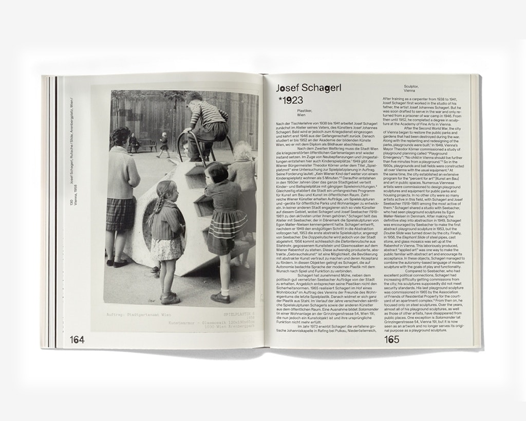 La Kunsthalle de Zurich a consacré une exposition aux projets, dispositifs et systèmes des aires de jeux pour enfants créées entre les années 1950 et 1980. Le catalogue de taille moyenne à couverture semi-rigide blanche associe matériel iconographique attrayant et textes informatifs sur des designers et des scientifiques, ce qui en fait un ouvrage aussi agréable à feuilleter qu'à lire attentivement. Sa conception est en phase avec le thème de l'aire de jeux en ce sens qu'il s'agit de repenser les limites fixées pour éventuellement explorer de nouveaux espaces. Le titre de couverture en lettres rouges, et en gras pour certaines, est repris en noir et en plus petit dans les titres de chapitres. Ce choix contribue à l'originalité typographique de l'ouvrage de même que les interlignes serrés et les numéros de pages en gros caractères placés à des endroits variables. Les textes allemand et anglais sont placés côte à côte sur deux colonnes (celle réservée à l'allemand étant plus large), ce qui peut parfois irriter mais n'en produit pas moins un effet surprenant.