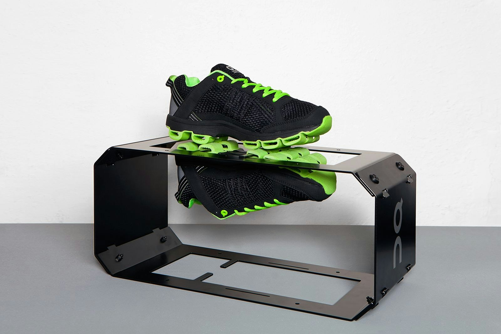 Parlons, par exemple, de la chaussure de jogging 'On', dont le design vise le coureur citadin branché: contrastant avec la chaussure noire, les cordons et le logo sur l'empeigne sont verts fluo, comme la semelle qui donne son identité à la chaussure. En effet, elle est assortie d'une fonction d'amortisseur, pensée tout spécialement pour la course sur asphalte. Elle a été développée à partir de vieux tuyaux de jardin et le premier prototype est sorti en 2005. Les picots semi-circulaires donnent au coureur l'impression de marcher sur un nuage. Le mérite de la mise au point revient à Thilo Brunner qui, en collaboration avec un coureur professionnel, a fait de l'objet ce qu'il est aujourd'hui: une chaussure de course suisse, novatrice et primée, également disponible dans trois autres combinaisons de couleurs.