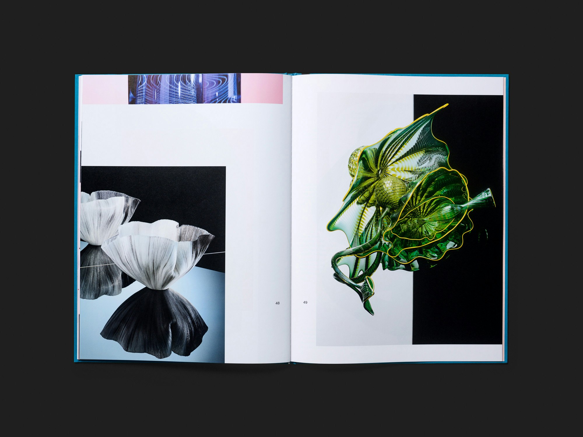 Ce livre très fin, rigide, avec une esthétique papier glacé, offre une vitrine idéale à une collection privée d’objets en verre coloré. Doté d’une matérialité luxueuse – titre doré à chaud, utilisation de différents types de papier –, il présente 36 photographies hyperréalistes d’un objet seul ou d’un groupe d’objets – souvent placés devant un miroir. La mise en scène paraît presque excessive mais elle sert bien ces créations verrières aux surfaces brillantes et réfléchissantes. La qualité de la conception graphique repose en grande partie sur l’excellent travail iconographique et lithographique. Les pages ont été coupées de manière à ce que figure à côté d’une grande photographie le bord d’une autre image. En donnant ainsi une forme de continuité à la collection, le graphisme débarrasse les objets d’une partie de leur unicité précieuse et incite au regard comparatif. Les numéros de pages servent aussi à numéroter les illustrations et contribuent, grâce à un placement subtil, à donner l’impression que les objets sont posés côte à côte sur une grande table et qu’il est possible de passer à loisir de l’un à l’autre. Au cours de la lecture, on peut à tout moment se reporter à l’index didactique des illustrations, imprimé sur les pages de garde rose clair.