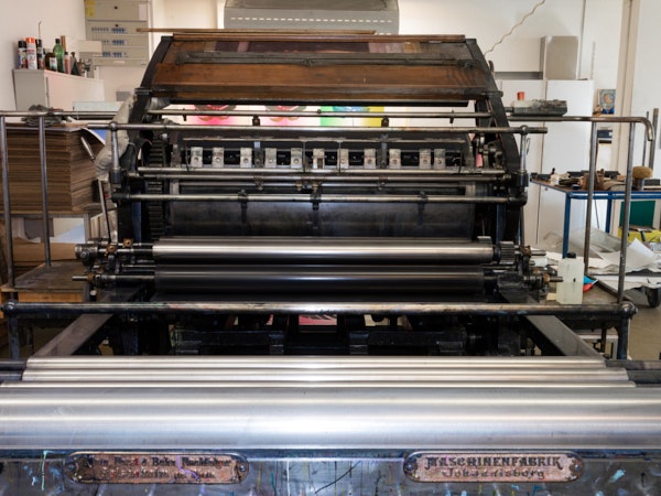 Les presses de l’atelier de lithographie portent des noms tels qu’Emma Stone ou Gertrude Stein et cet endroit constitue un morceau de l’histoire de l’impression en Suisse. Fondée en 1902, l’imprimerie graphique J.E. Wolfensberger SA s’était dès l’origine donné pour objectif de conjuguer art et produits imprimés de haute qualité. Lorsque Thomi Wolfensberger a repris le département lithographie de l’entreprise familiale à la fin des années 80, cette technique classique d’impression avait cependant déjà connu des jours meilleurs. Mais il a dès le début vu dans l’art et dans les collaborations fructueuses avec les artistes un moyen pour maintenir ce métier en vie.