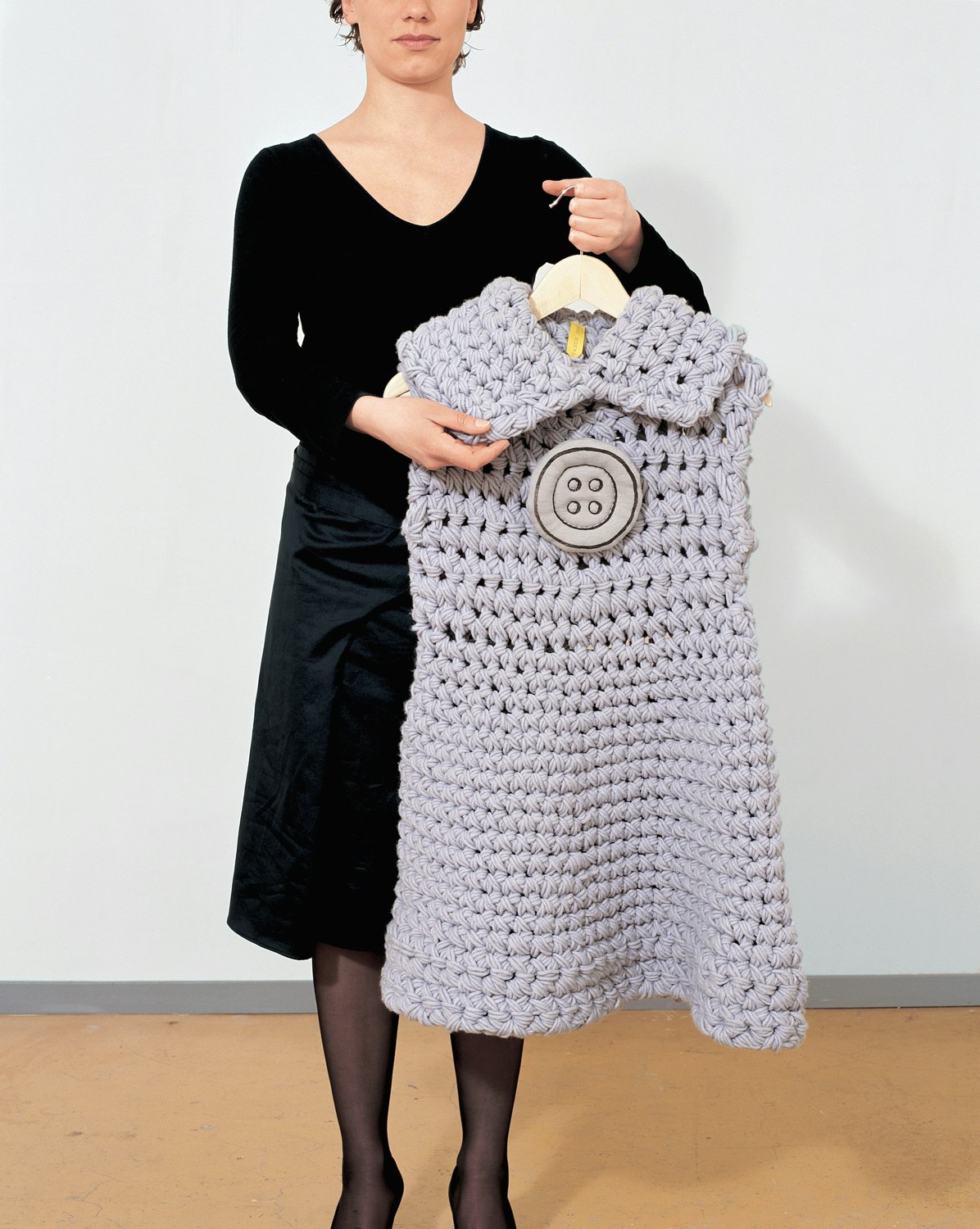 S'inspirant de l'artiste japonais Yoshitomo Nara et de ses êtres oscillant entre un adorable infantilisme et une monstruosité infecte, Valerie Jantz nous entraîne, avec les six tenues de sa collection de diplôme ‘just not big enough', vers un autre monde - un monde aux dimensions imprévisibles, aux proportions décalées et aux sensations ambivalentes. Ce sont les couleurs claires et la fermeté de l'épais feutre industriel, les gros boutons et cols cousus et molletonnés, ainsi que les mailles surdimensionnées de la laine crochetée par quatre brins qui donnent à ces tenues des airs d'objets plutôt que de vêtements. ‘Emballés' dans ces habits, les corps des porteuses changent de proportions, deviennent immuables comme des poupées et semblent subitement bizarrement fragiles. Avec une clarté conséquente et une présence convaincante, Valerie Jantz applique son idée et présente une collection qui impressionne de par l'originalité de l'idée fondamentale réalisée - une idée qui contient un grand potentiel irritatif.