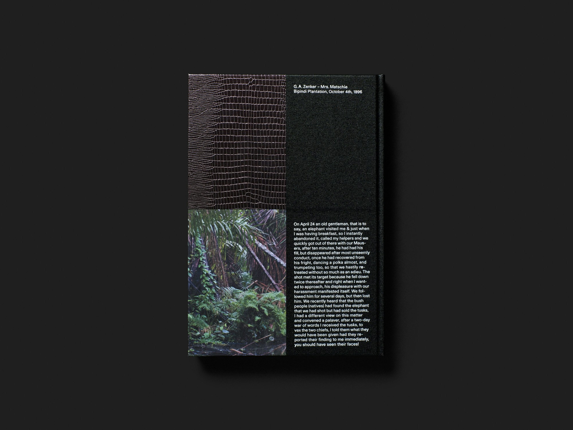 Dans ce livre de photographie de moyen format relié en demi-toile noire, qui dresse le portrait de la famille germano-camerounaise Zenker sur cinq générations, le graphisme fait habilement ressortir les exotismes et conflits de l’histoire coloniale allemande.Sur la couverture avant, les motifs en simili cuir, le nom de famille estampé et la photographie d’une jungle ténébreuse véhiculent des stéréotypes autant qu’ils créent une aura énigmatique. Sur la quatrième de couverture, l’extrait d’une lettre écrite en 1896 par le fondateur de la famille – le botaniste et colonialiste Georg August Zenker – dévoile un homme qui braconnait, trafiquait de l’ivoire et traitait les populations locales avec une grande condescendance. Sans émettre de jugement explicite, ces partis pris donnent le ton à l’ensemble de l’ouvrage qui mêle une douzaine de lettres de Zenker (sur des pages de textes en noir et blanc) à des photographies anciennes et des portraits couleur pleine page des descendants actuels à la peau foncée. Les images contemporaines relèvent parfois d’une démarche documentaire un peu conventionnelle, mais leur association avec les lettres d’époque suscite une tension fertile qui soulève de multiples questions liées à la condition postcoloniale. La grille particulièrement bien pensée et fluide donne de la cohérence à ce matériau hétérogène. Une transposition typographique intelligente rend les lettres accessibles sans pour autant gommer les particularités individuelles de l’écriture telles que les soulignages ou les ratures.