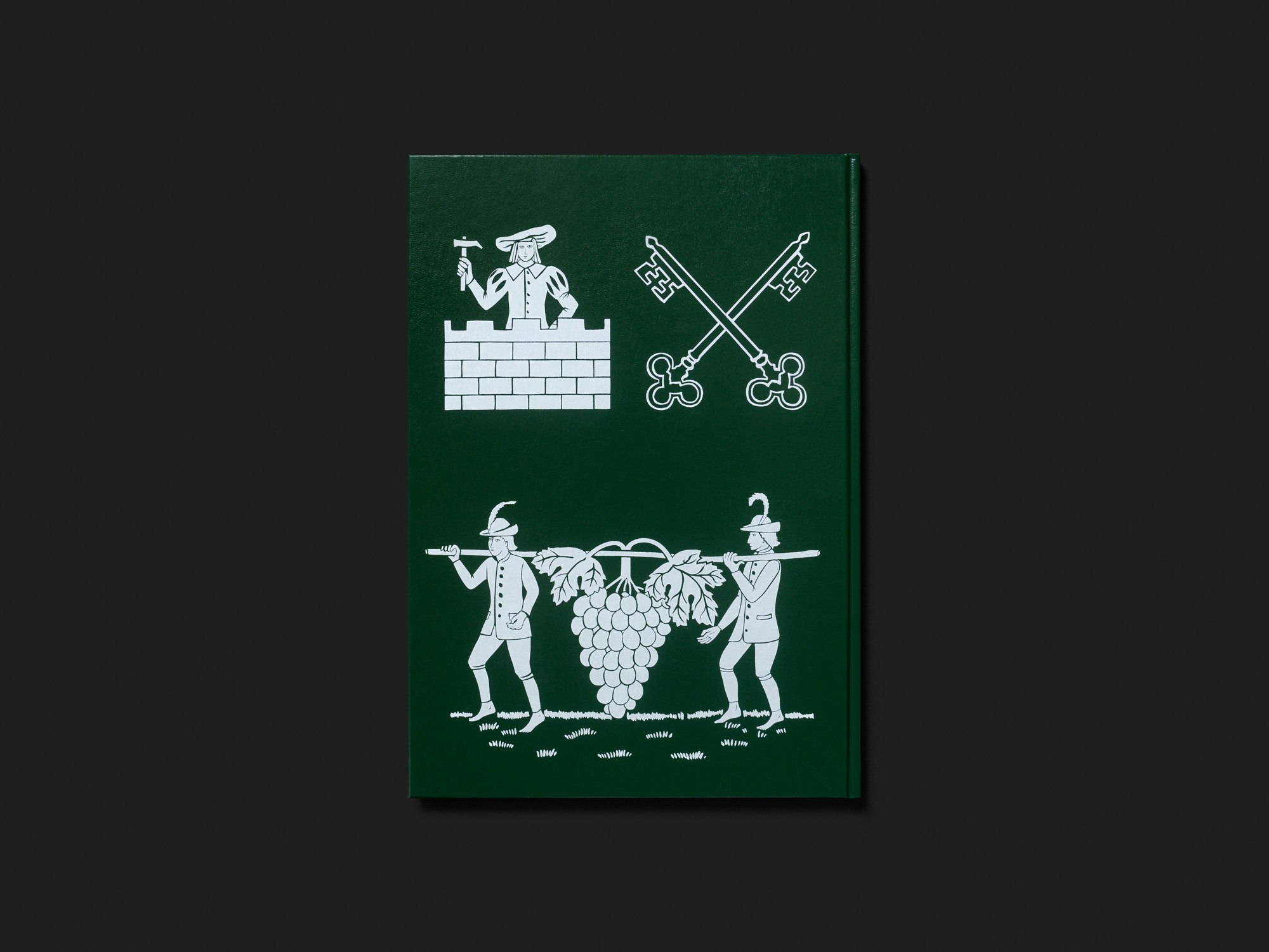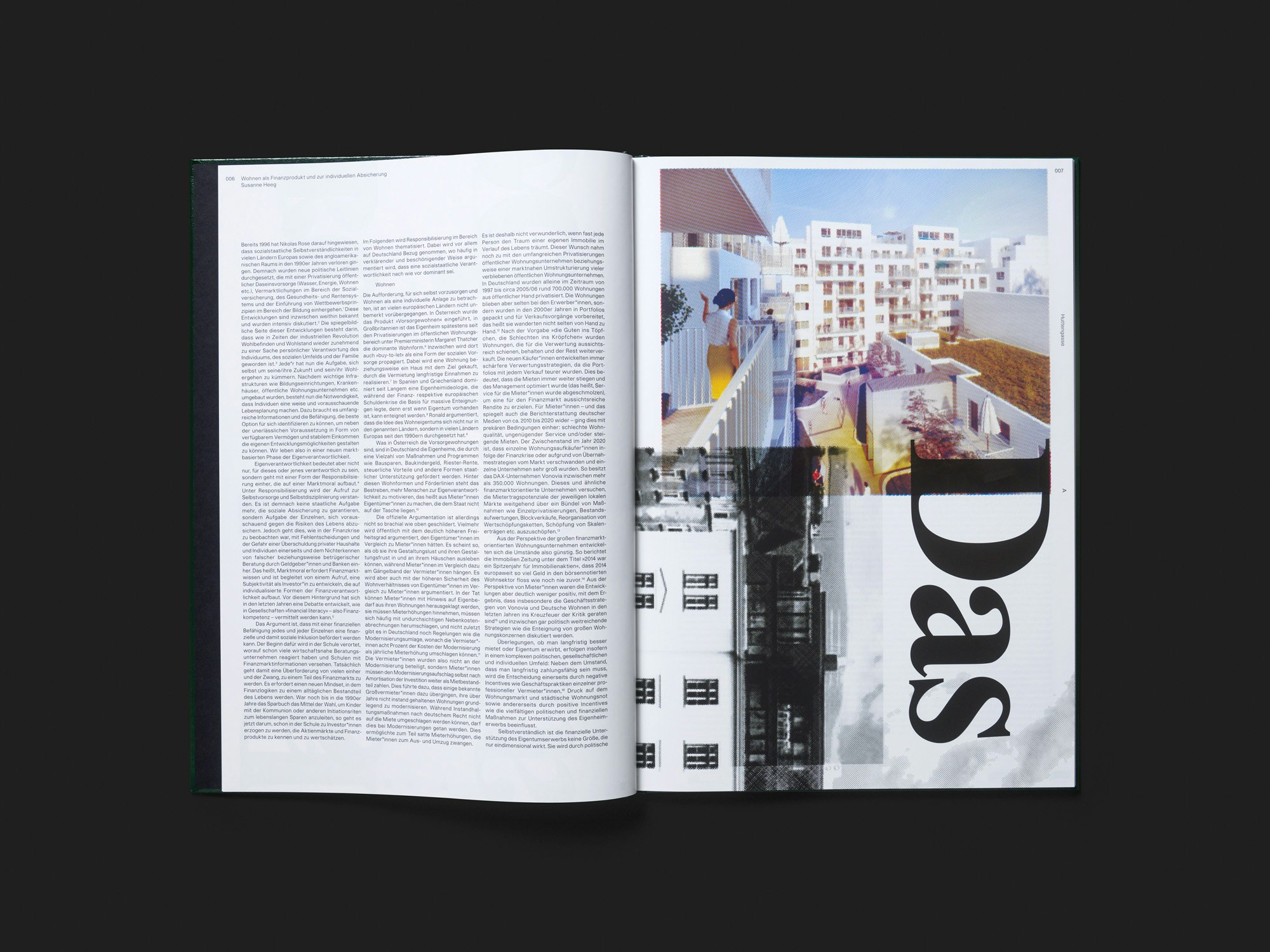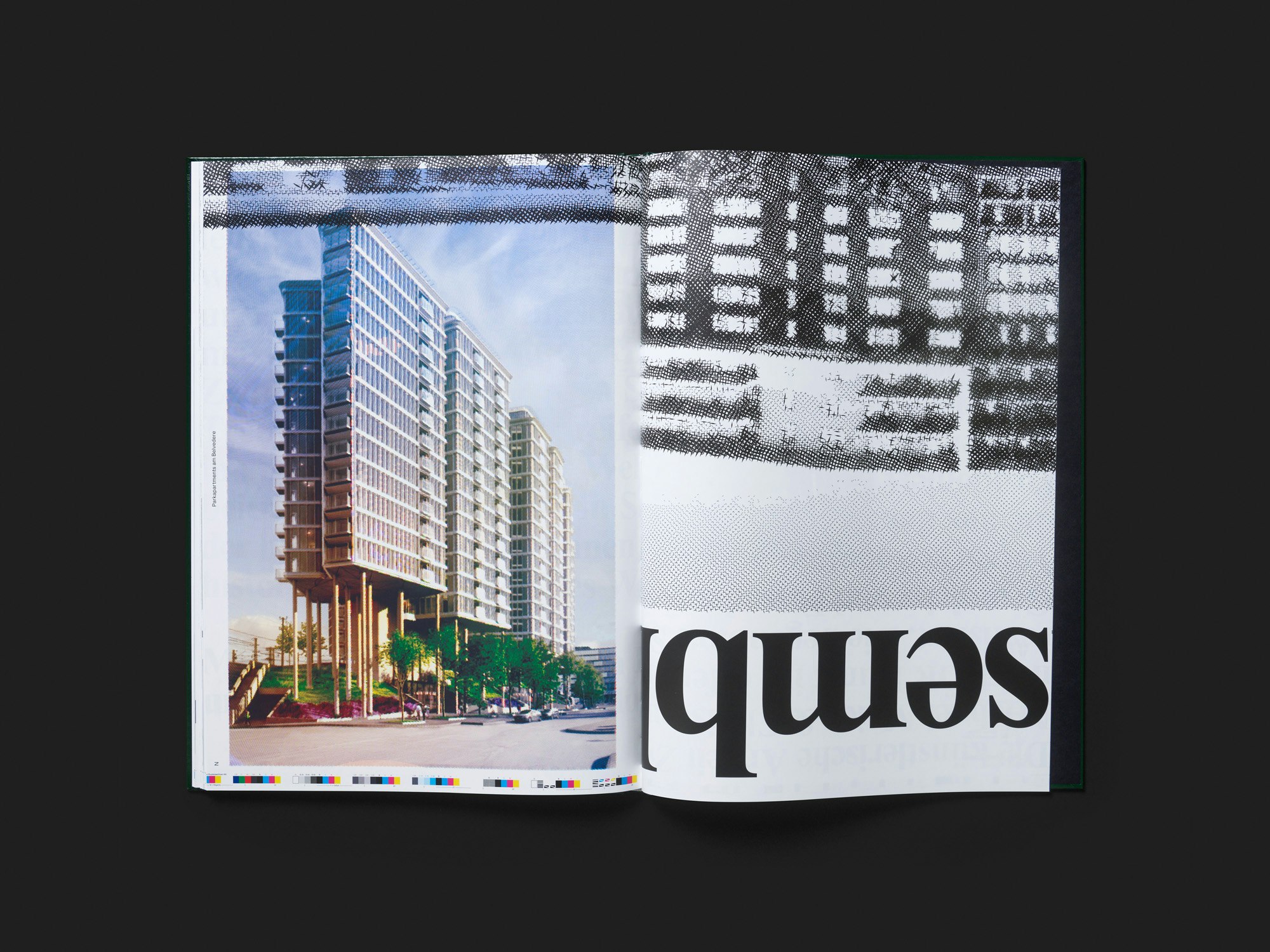 Cet ouvrage de grand format du duo d’artistes Michael Meier et Christoph Franz, peu épais et à la couverture rigide verte, se distingue parce qu’il fait partie intégrante de la pratique artistique. Meier et Franz ont érigé à Vienne une sculpture praticable en briques sur le modèle de l’un de ces petits appartements destinés à l’investissement locatif que les promoteurs immobiliers construisent en série. Ils ont ensuite pavé le sol de leur sculpture avec les matrices du livre. Douze sociologues, architectes, urbanistes et activistes avaient rédigé, à la demande des artistes, des textes sur le marché immobilier ; leurs écrits posent ainsi les fondations discursives de l’installation. Composées sur trois colonnes en petits caractères, les pages textuelles ont dû être difficiles à déchiffrer in situ – contrairement aux pages d’illustration. De nombreuses photographies en quadrichromie de 14 programmes immobiliers actuellement en projet à Vienne y sont altérées par des trames et des moirés et surimprimées de blasons au ton argenté. Elles avaient été assemblées sur les matrices pour former des unités plus importantes, voire de véritables posters. Ainsi, si de nombreuses illustrations sont fortement rognées dans le livre, c’est en raison de leur agencement au sol de l’installation ; la méthode, rigoureuse, produit des résultats aussi expérimentaux que ludiques. Aucune prise de vue de la sculpture ne figure dans l’ouvrage, la spatialité de l’installation est uniquement suggérée par le jeu formel entre le proche et le lointain. La reliure verte et la typographie basique du titre imitent l’aspect d’un dossier de candidature pour un appel à projet ou d’un dossier documentaire des archives municipales.