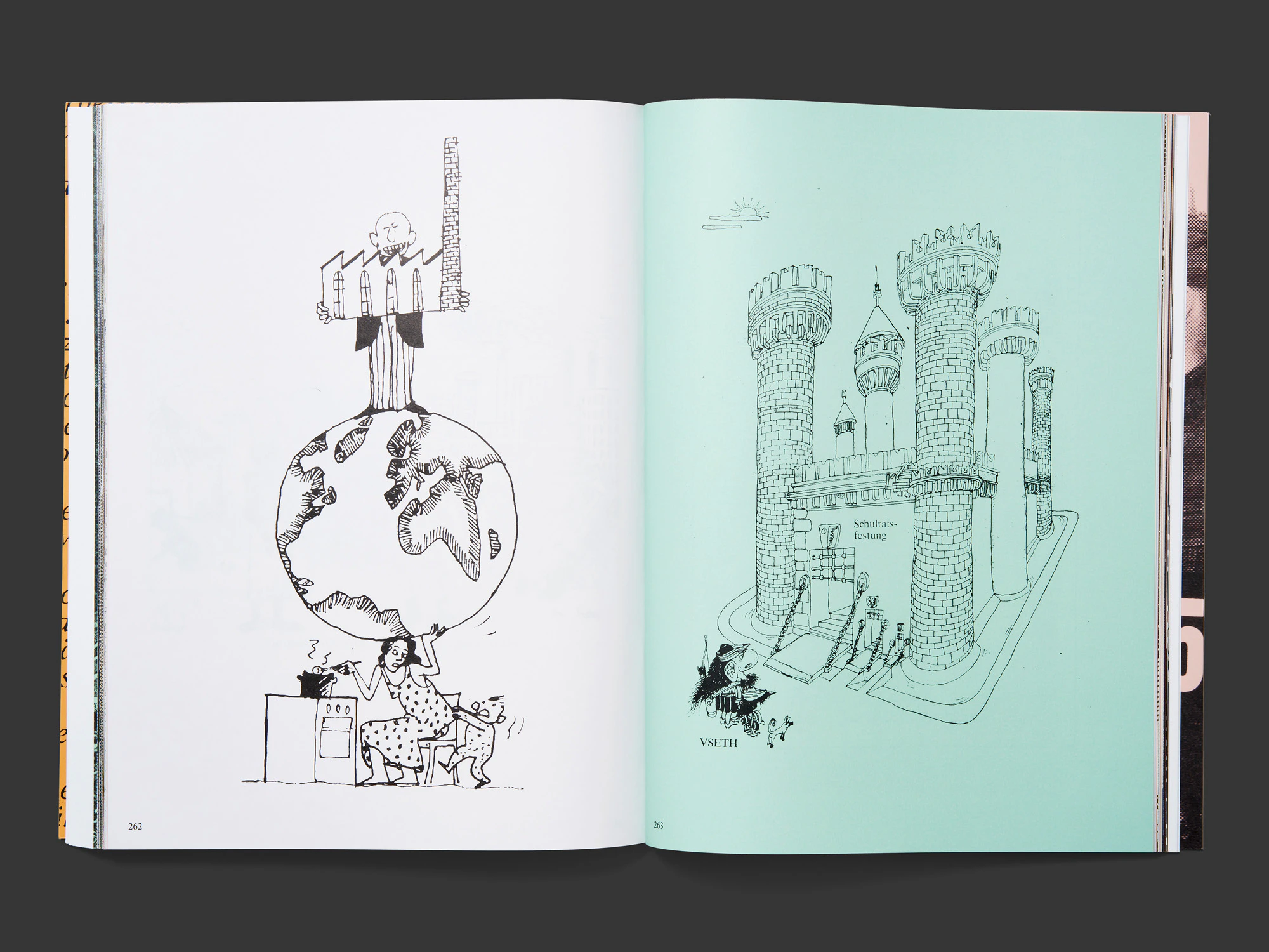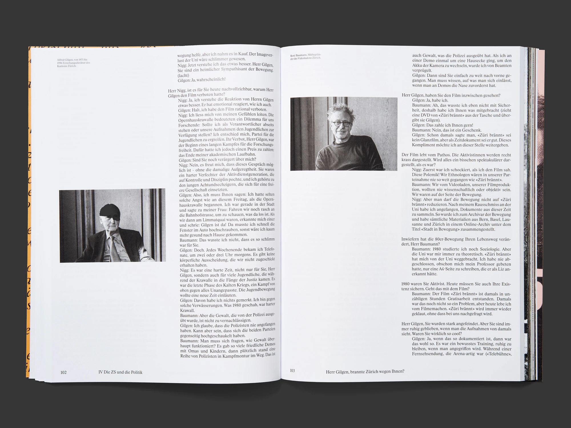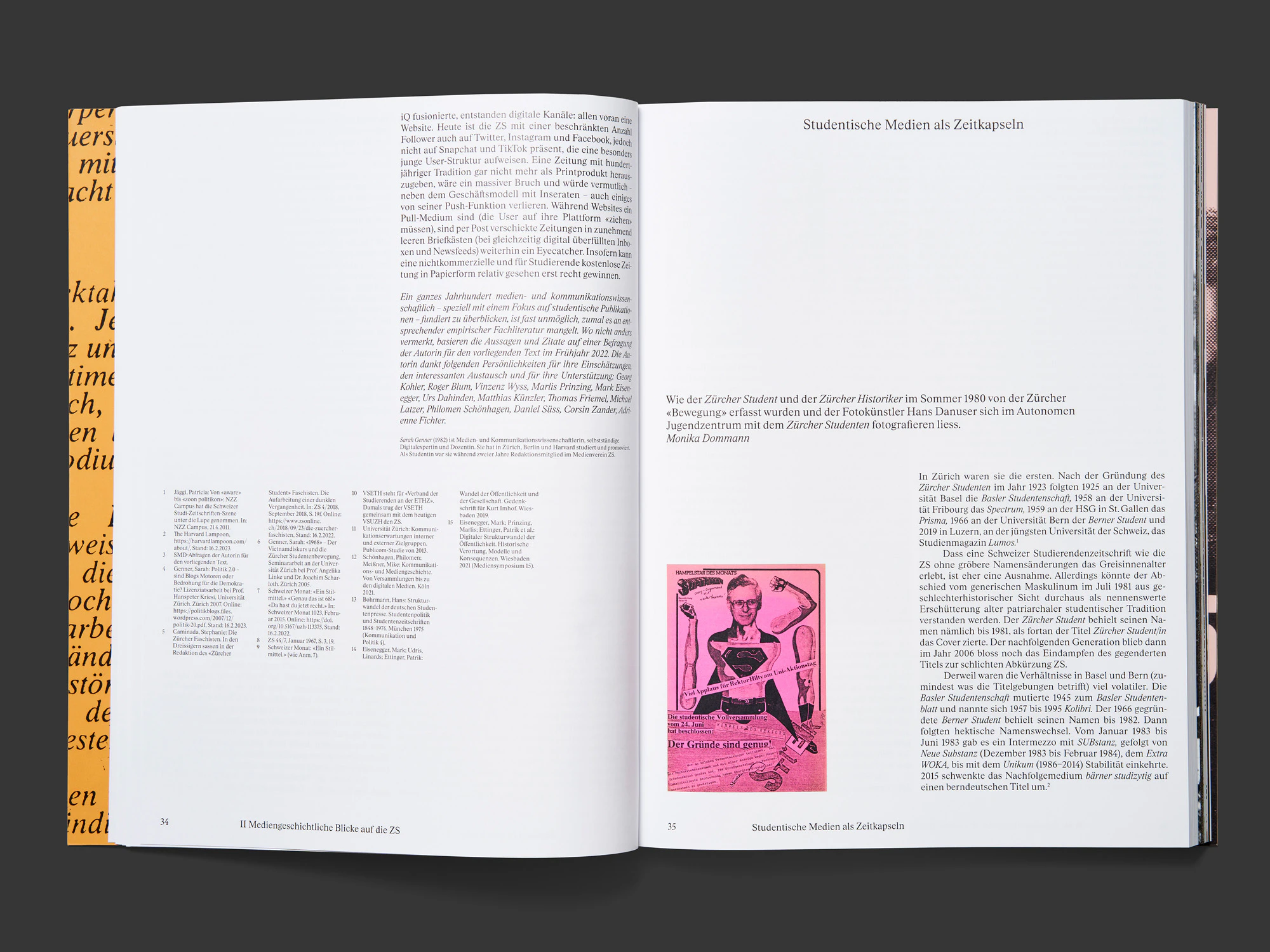 Questa pubblicazione di grande formato, pesante e molto flessibile, realizzata per il centenario del giornale studentesco zurighese Zürcher Studierendenzeitung (ZS) è un libro «sentimentale» ricco di contenuti, che invita a soffermarsi grazie al design ragionato e alla stampa ottimale su carta piacevole. La sovraccoperta per la copertina morbida è un poster ripiegato con quattro ritagli del giornale, colorati e fortemente ingranditi. La prima parte del libro contiene una ventina di contributi testuali di ex collaboratrici e collaboratori, disposti in un layout asimmetrico a una colonna con un carattere serif e occasionali illustrazioni nella colonna a margine. La seconda parte è stampata su carta più sottile ed è completamente riempita con immagini e ritagli, per lo più stampati al vivo, spesso ingranditi e mai commentati. Come svela il successivo indice delle figure, i contenuti grafici sono raggruppati in cinque categorie (ritagli, pagine di layout, caricature, pubblicità e prime pagine) e disposti in ordine cronologico all’interno della singola categoria. Nonostante l’approccio sistematico, l’abile lavoro di selezione e composizione delle immagini svolge un ruolo determinante affinché il materiale, di per sé non sempre accattivante, produca ritagli e confronti spettacolari.