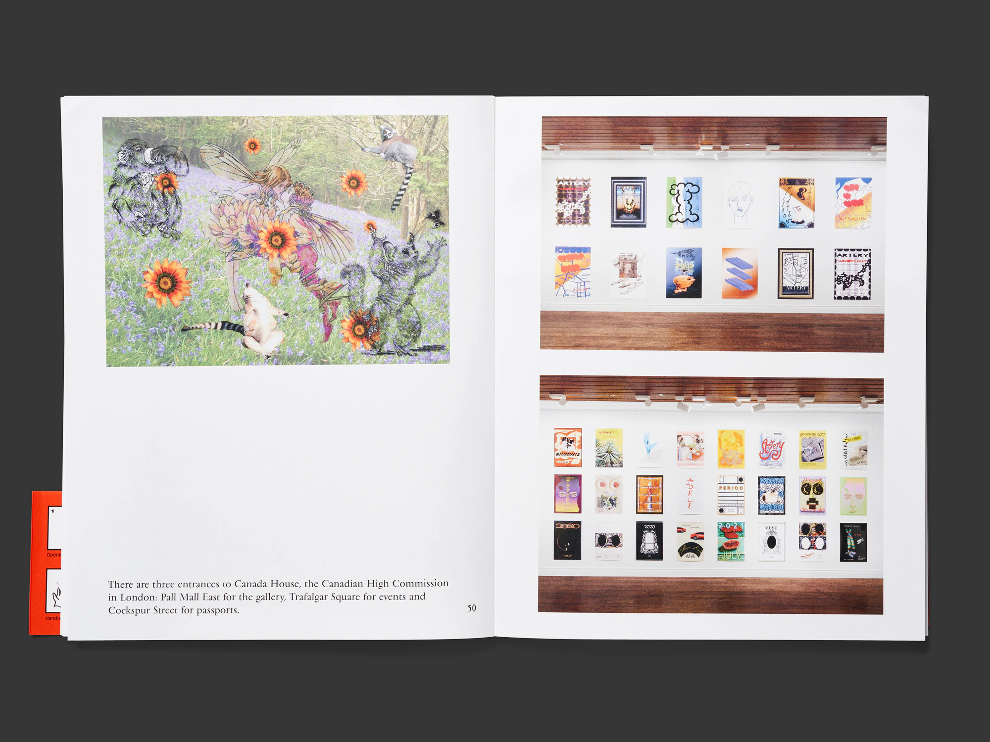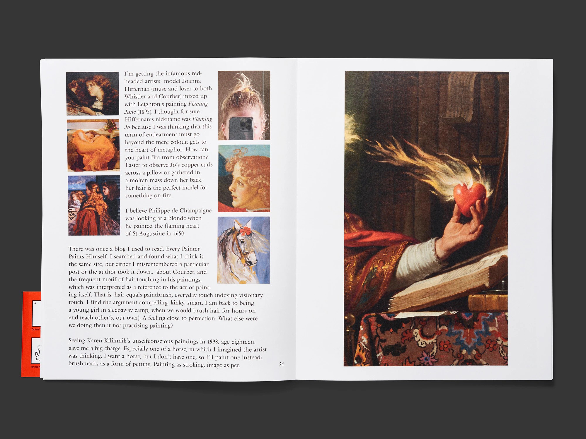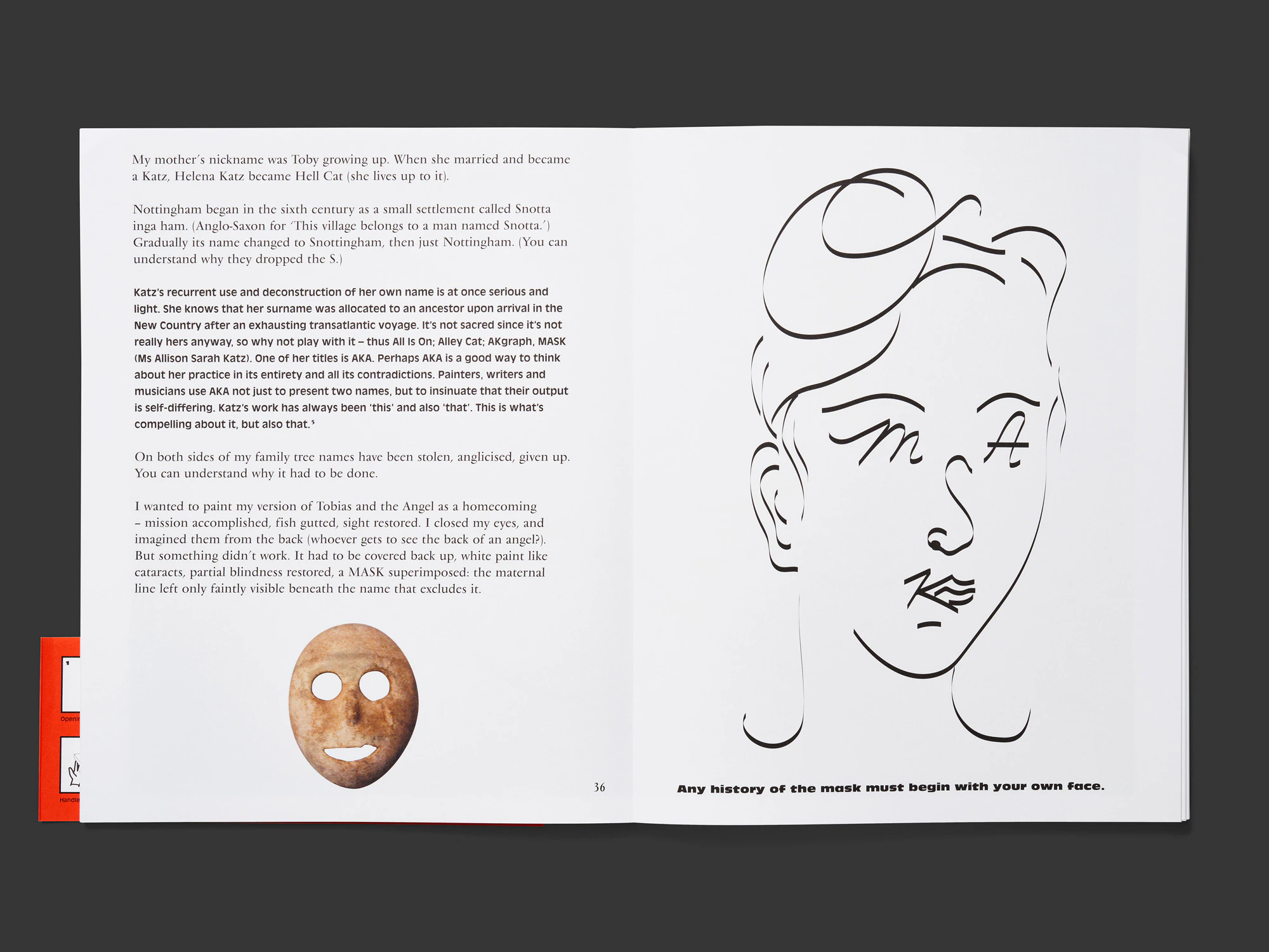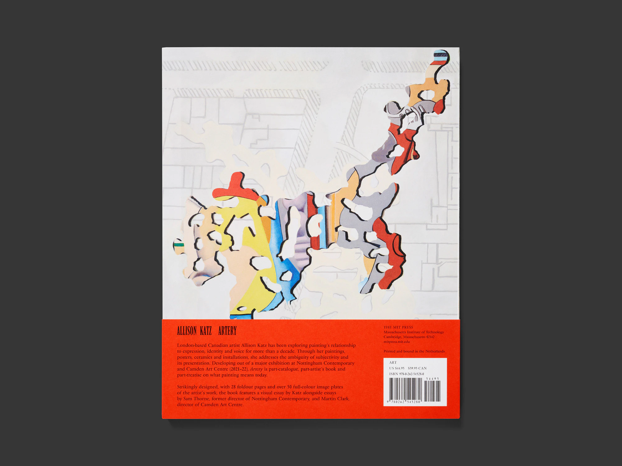 con annotazioni che ricordano un diario, riflessioni concettuali e richiami alla storia dell’arte. Il mix virtuoso offre numerose combinazioni sorprendenti di tipografia e immagini. Inoltre, una doppia pagina ogni due si può aprire verso l’alto per rivelare un grande dipinto o un poster dell’artista. Sui poster si ritrovano molti dei tipi di carattere utilizzati nel testo. Nonostante la struttura sbalorditiva e i contenuti complessi, il libro non appare artefatto o complicato ma con la sua generosità spaziale offre tutta una serie di modalità d’accesso, semplificate anche dalla fascetta rossa avvolta intorno alla copertina morbida, su cui sono riportate una breve presentazione e le istruzioni per aprire le doppie pagine. L’interazione simbiotica tra arte e design fa intuire la stretta collaborazione avvenuta tra le parti coinvolte.
