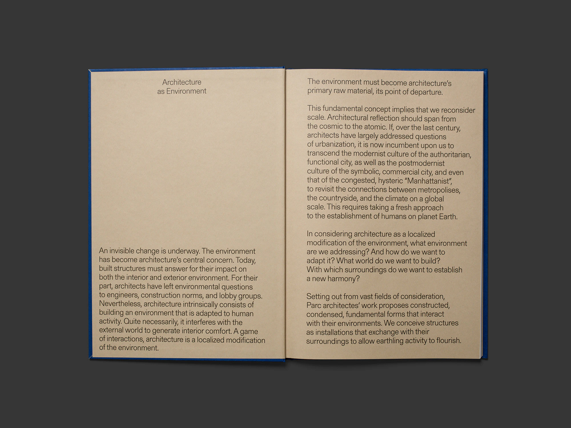 Questo libro sottile di grande formato con copertina rigida blu di Parc architectes (Parigi) avvolge chi lo sfoglia in un ammaliante flusso di immagini e testo con cui vengono presentati gli edifici e i progetti dello studio, in contesti che si ampliano con cenni di cosmologia e ambiente. Tutto comincia con la carta beige del risguardo, che riporta un testo introduttivo a caratteri grandi e si presenta come se fosse pensato per un libro tascabile. Le 80 pagine che seguono adottano una chiara struttura tematica, dove i capitoli partono dal cosmo, attraversano l’atmosfera e scendono fino agli abitanti della Terra e al suolo. All’interno dei singoli capitoli, tuttavia, non è difficile perdere la visione d’insieme, perché su ogni coppia di pagine si combinano liberamente, all’interno di una griglia, immagini e blocchi di testo di vario tipo e dimensioni. L’effetto è meno quello di un libro che si presta a una lettura lineare e più quello di un sito web, nel quale scegliere cosa guardare o leggere senza seguire un ordine prestabilito. Tutto sprizza energia, ma anche attenzione per i dettagli. Si percepiscono l’impegno e la gioia di tutte le persone coinvolte. Una delle pubblicazioni di architettura inusuali del concorso di quest’anno, testimonianza del nuovo entusiasmo del design grafico francese.