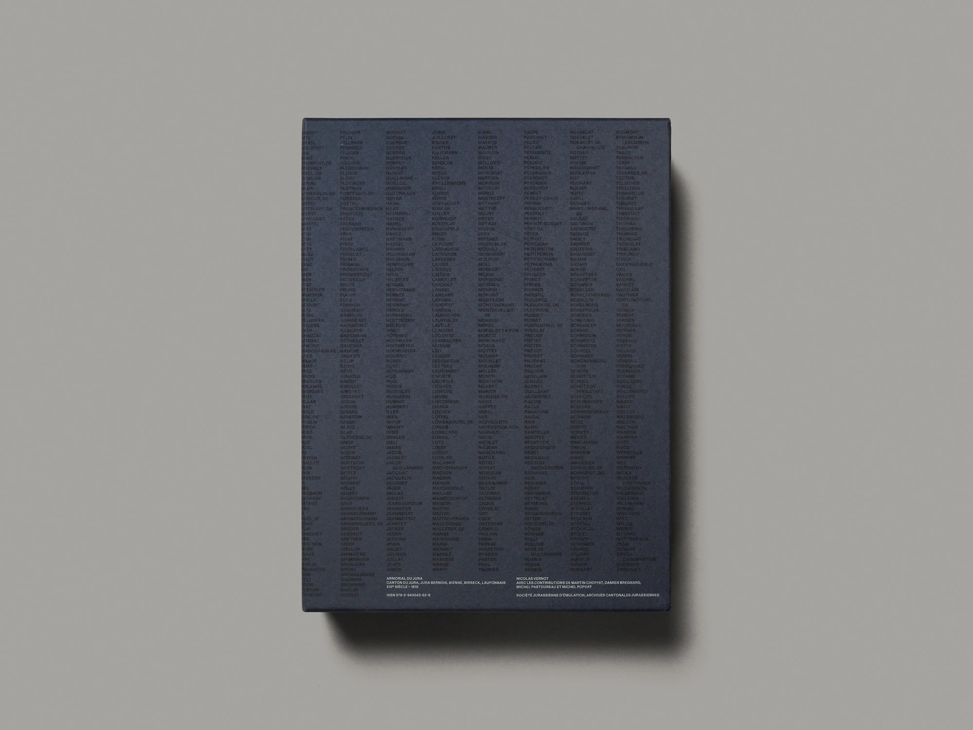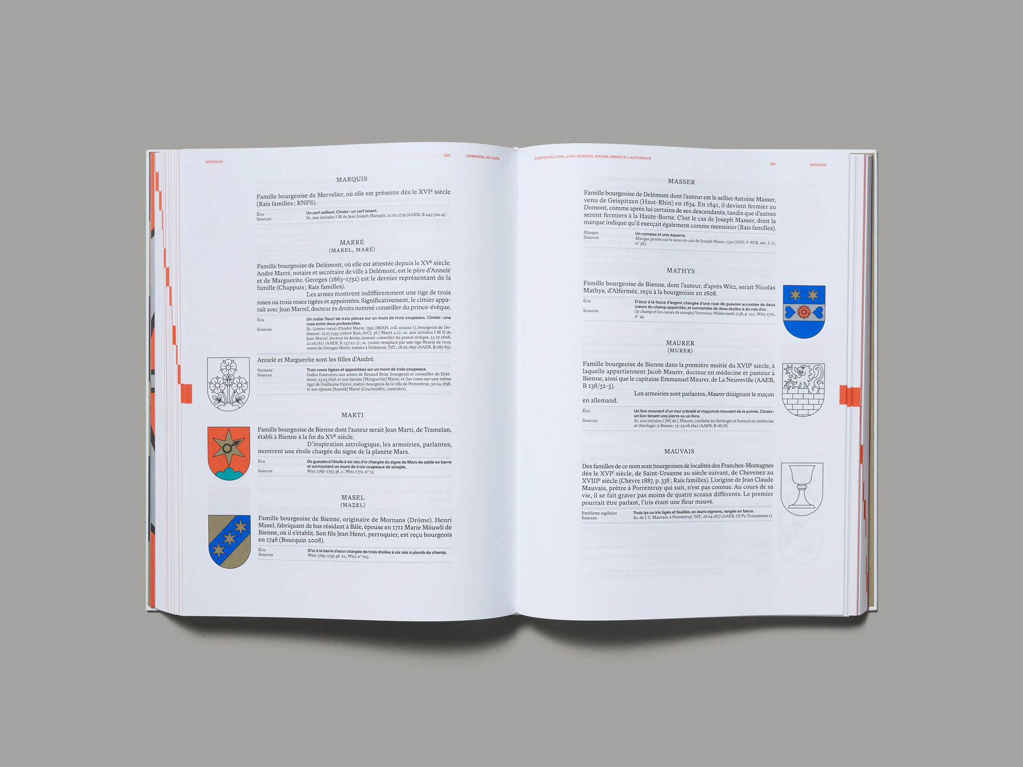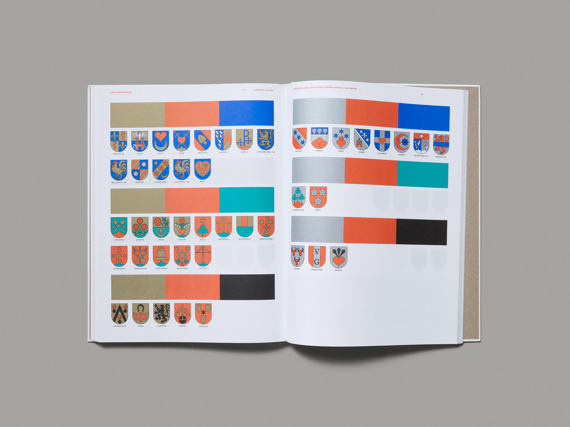 Due pesanti volumi con copertina rigida e goffratura bianca su bianco in una custodia di cartone nera presentano stemmi di famiglia giurassiani risalenti al periodo dal XIII al XIX secolo in un’estetica ibrida che oscilla tra corporate identity, preservazione della tradizione e ricerca scientifica. Il più grande dei due volumi, di cui nel cofanetto si vede brillare intensamente il dorso colorato, elenca su più di 500 pagine oltre 1000 blasoni in ordine alfabetico. Gli stemmi sono disposti in una griglia rigorosa ma elegante sul margine della pagina e corredati di brevi informazioni sulle famiglie, gli elementi araldici e le fonti. Tutti gli stemmi sono stati ridisegnati, uniformandone i colori entro un set di sei colori speciali: oro, argento, rosso chiaro, blu scuro, verde e nero. Le pagine hanno un aspetto meraviglioso e facilitano il reperimento delle informazioni desiderate. Il volume più sottile offre un’introduzione scientifica e una sezione di circa 50 pagine di foto di fonti documentali. Vi sono inoltre diversi tipi di indice, in cui i vari blasoni ritornano in riproduzioni e disposizioni variabili. In un glossario araldico, ad esempio, risalta in rosso chiaro soltanto l’elemento degli stemmi designato dal rispettivo termine; in un indice per colori, invece, gli stemmi sono raggruppati per combinazioni cromatiche. Si percepiscono la massima ambizione e la laboriosità profuse nell’opera, che riesce così a regalare una meravigliosa esperienza istruttiva.