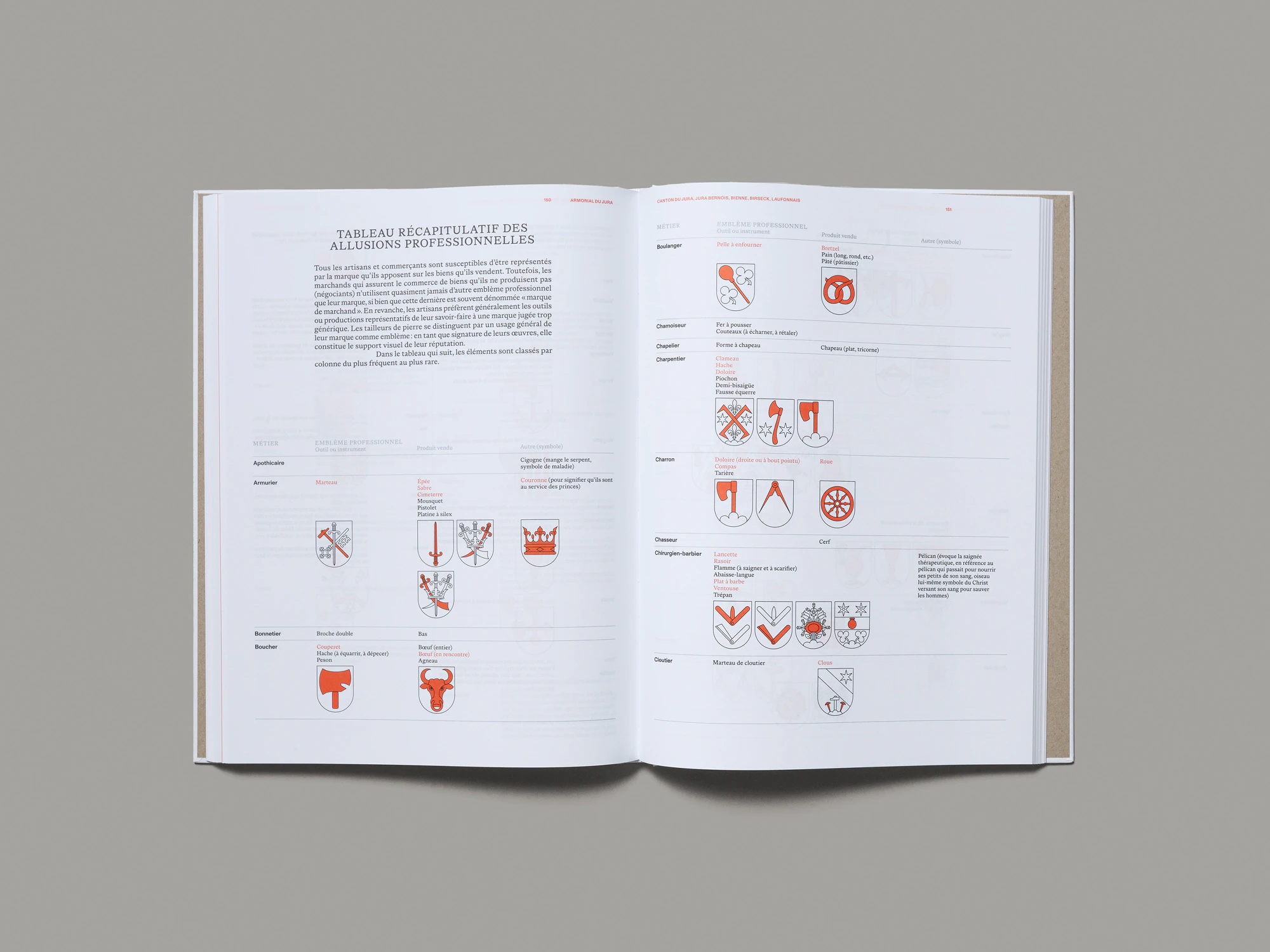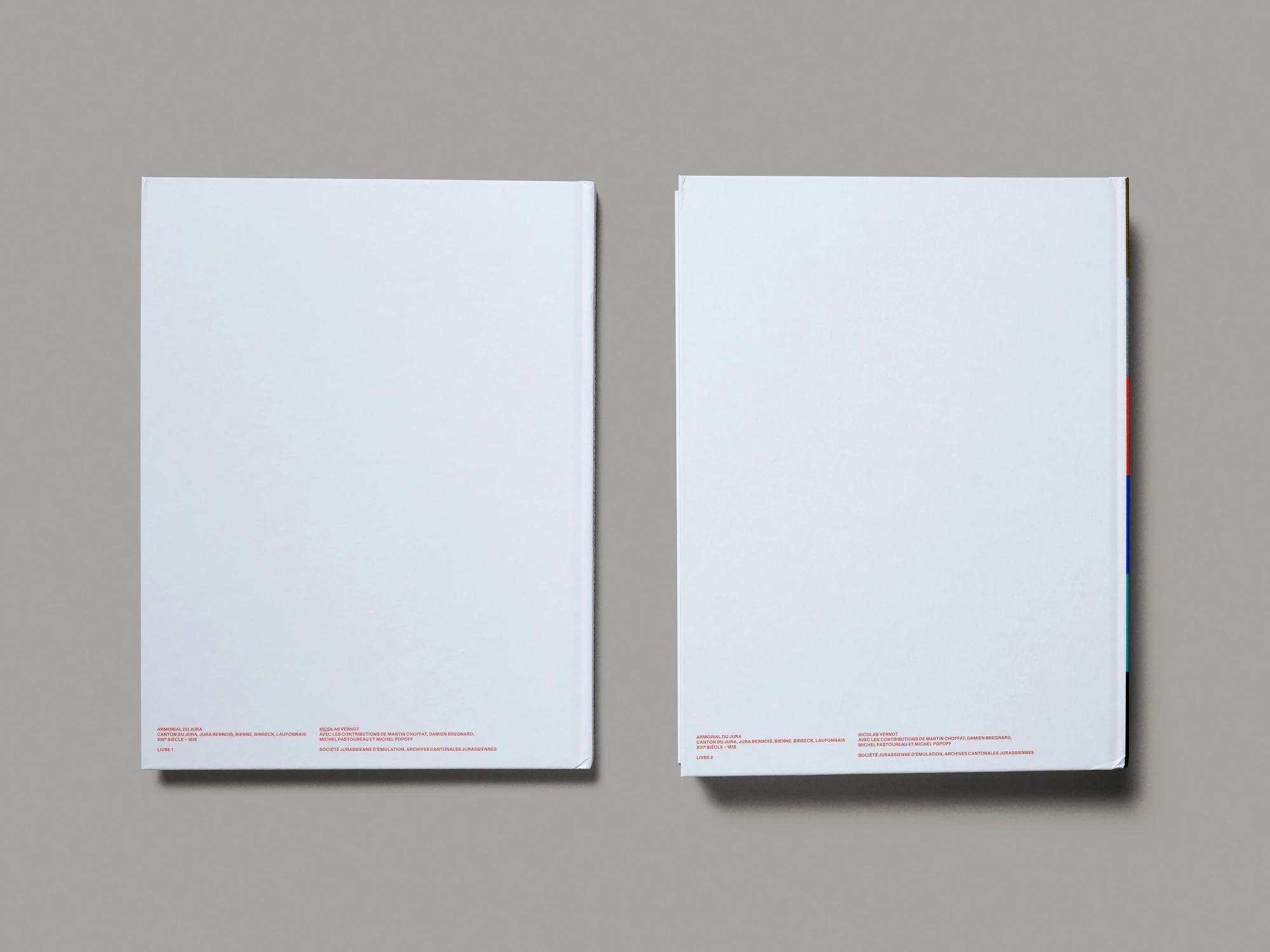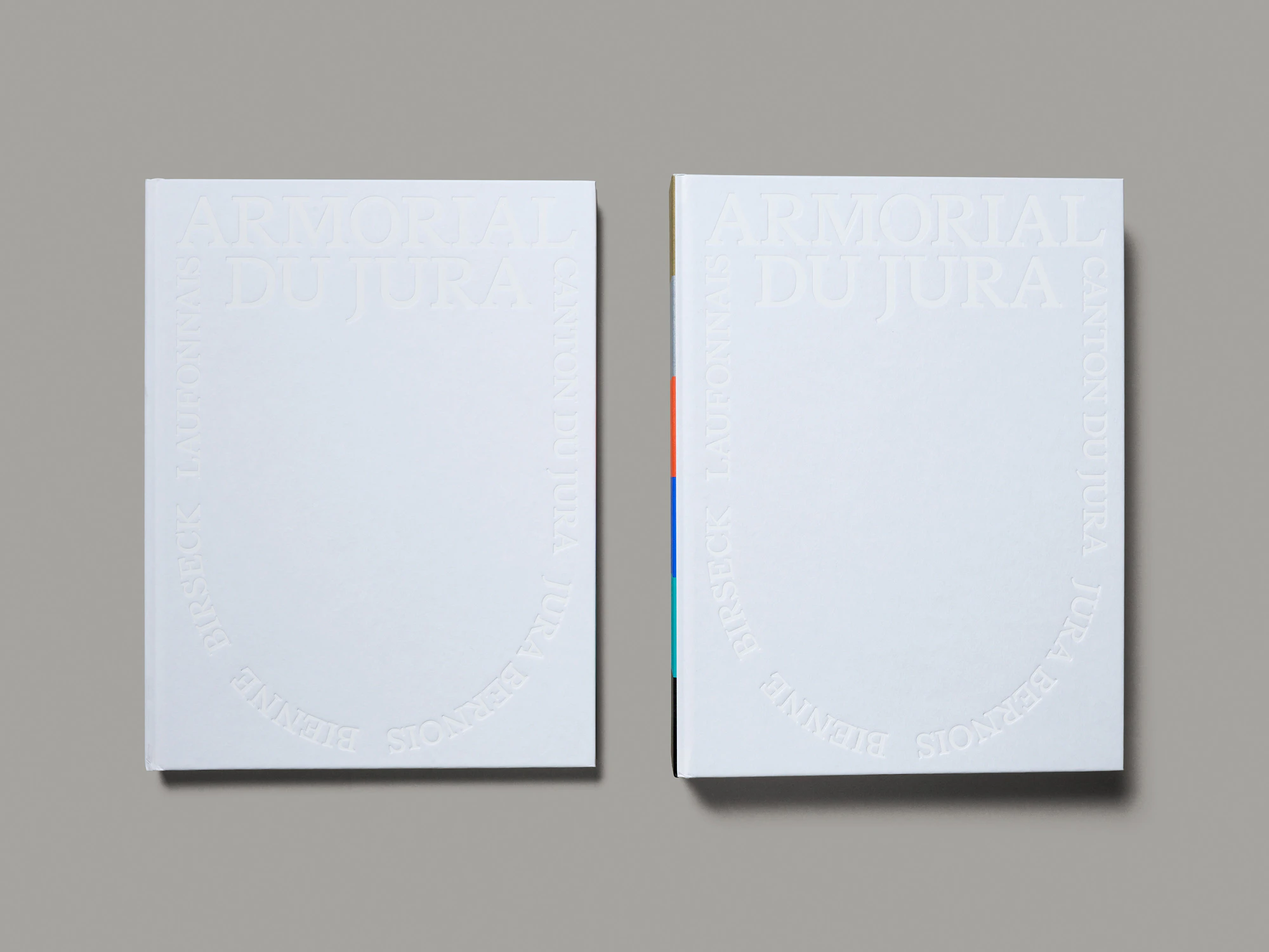 Due pesanti volumi con copertina rigida e goffratura bianca su bianco in una custodia di cartone nera presentano stemmi di famiglia giurassiani risalenti al periodo dal XIII al XIX secolo in un’estetica ibrida che oscilla tra corporate identity, preservazione della tradizione e ricerca scientifica. Il più grande dei due volumi, di cui nel cofanetto si vede brillare intensamente il dorso colorato, elenca su più di 500 pagine oltre 1000 blasoni in ordine alfabetico. Gli stemmi sono disposti in una griglia rigorosa ma elegante sul margine della pagina e corredati di brevi informazioni sulle famiglie, gli elementi araldici e le fonti. Tutti gli stemmi sono stati ridisegnati, uniformandone i colori entro un set di sei colori speciali: oro, argento, rosso chiaro, blu scuro, verde e nero. Le pagine hanno un aspetto meraviglioso e facilitano il reperimento delle informazioni desiderate. Il volume più sottile offre un’introduzione scientifica e una sezione di circa 50 pagine di foto di fonti documentali. Vi sono inoltre diversi tipi di indice, in cui i vari blasoni ritornano in riproduzioni e disposizioni variabili. In un glossario araldico, ad esempio, risalta in rosso chiaro soltanto l’elemento degli stemmi designato dal rispettivo termine; in un indice per colori, invece, gli stemmi sono raggruppati per combinazioni cromatiche. Si percepiscono la massima ambizione e la laboriosità profuse nell’opera, che riesce così a regalare una meravigliosa esperienza istruttiva.