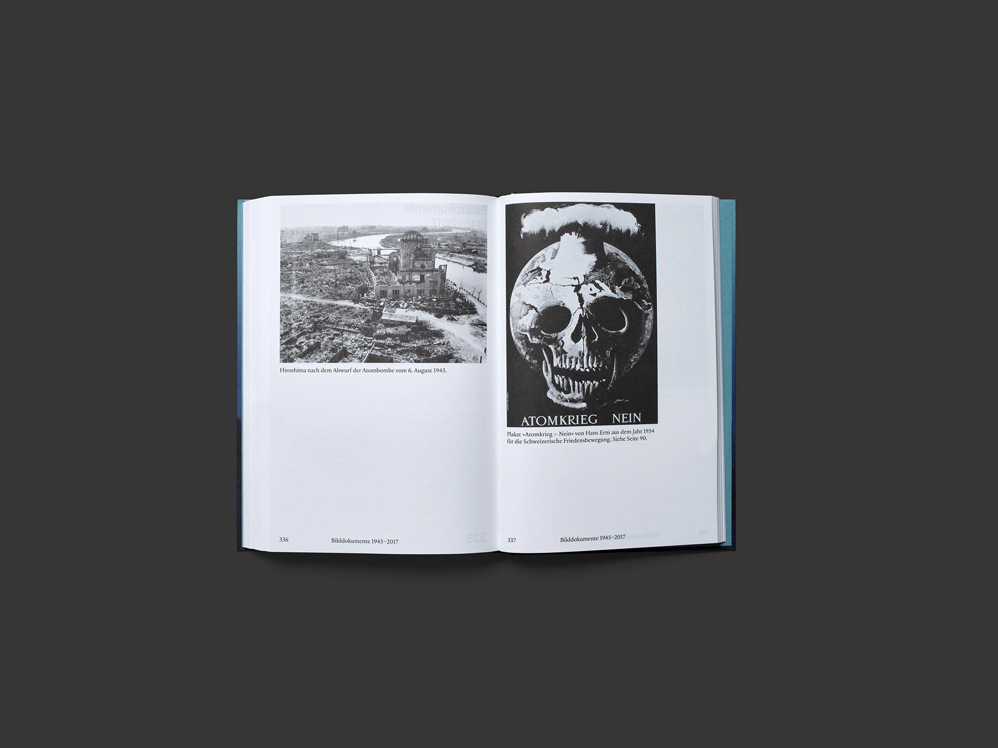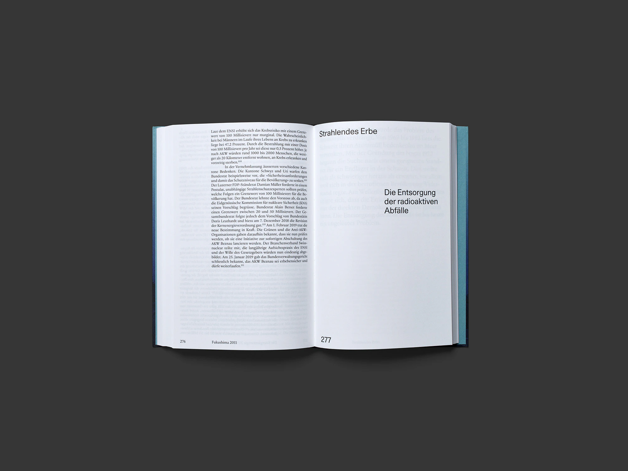 Questo studio approfondito della storia dell’energia nucleare in Svizzera appare sia interessante che accessibile grazie ad appropriate scelte grafiche. Le oltre 300 pagine di testo della prima parte del libro presentano un’impaginazione asimmetrica con proporzioni peculiari che nel margine sinistro lascia spazio per le note. Tutti gli elementi testuali, inclusi i numeri e i titoli a piè di pagina, sono impostati con uno stile e una dimensione del carattere uniformi. Solo le pagine singole su cui appaiono i titoli dei capitoli utilizzano un secondo tipo di carattere, più grande, e un layout a due colonne che appare anche sulla copertina, al disopra della fotografia di una torre di raffreddamento al crepuscolo, che prosegue a cavallo del dorso. La seconda parte del libro riporta tre dozzine di immagini in ordine cronologico, ciascuna allineata in alto a sinistra nella pagina, con una legenda dettagliata immediatamente sotto. Tutto è semplice e chiaro, con un effetto complessivo molto bello. Un esempio ben riuscito della pratica meritoria della casa editrice, che si è posta l’obiettivo di trasporre in formato libro l’archiviazione della storia contemporanea svizzera.