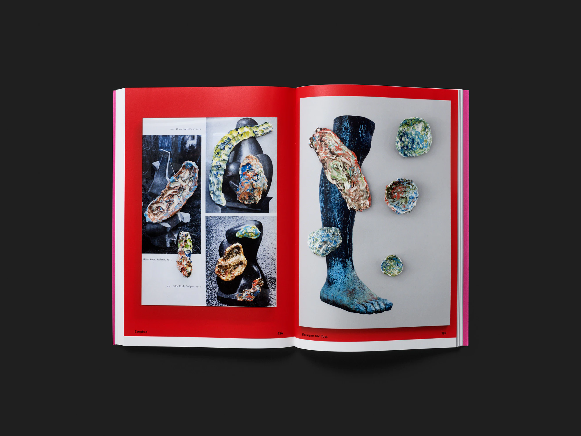 Un libro flessibile, rosa, con copertina morbida e sovraccoperta, che mostra le umoristiche opere in ceramica di Bastian Aubry e Dimitri Broquard, gioca con diverse tipologie di libro ponendosi come oggetto ibrido. Mentre la carta e la fattura della copertina ricordano un quaderno per schizzi, la veste grafica di quest’ultima, corredata da disegno, nome degli artisti e titolo, rimanda a una monografia d’artista classica. L’ingrediente tipico della foto scattata nell’atelier, però, appare una sola volta, nascosto sotto la sovraccoperta. La presentazione degli oggetti all’interno del volume – singolarmente o in piccoli gruppi su una pagina – a prima vista fa quasi pensare a un archivio cronologico, ma la disposizione segue un virtuoso lavoro di scelta delle immagini e narrazione. Per lo più colorati, gli oggetti sono fotografati davanti a sfondi sgargianti, che in alcuni casi sembrano far parte della pratica artistica, a testimonianza della strettissima collaborazione con la designer. Molti di essi sembrano quasi personaggi cui il design ha magicamente dato vita. Anche l’oggetto libro si può percepire come un soggetto vivace e complesso. L’intera organizzazione è estremamente accurata, e l’esplorazione artistica sul filo tra serietà e umorismo risalta in modo eccellente, perché la concezione grafica a sua volta rinuncia completamente alla comicità.