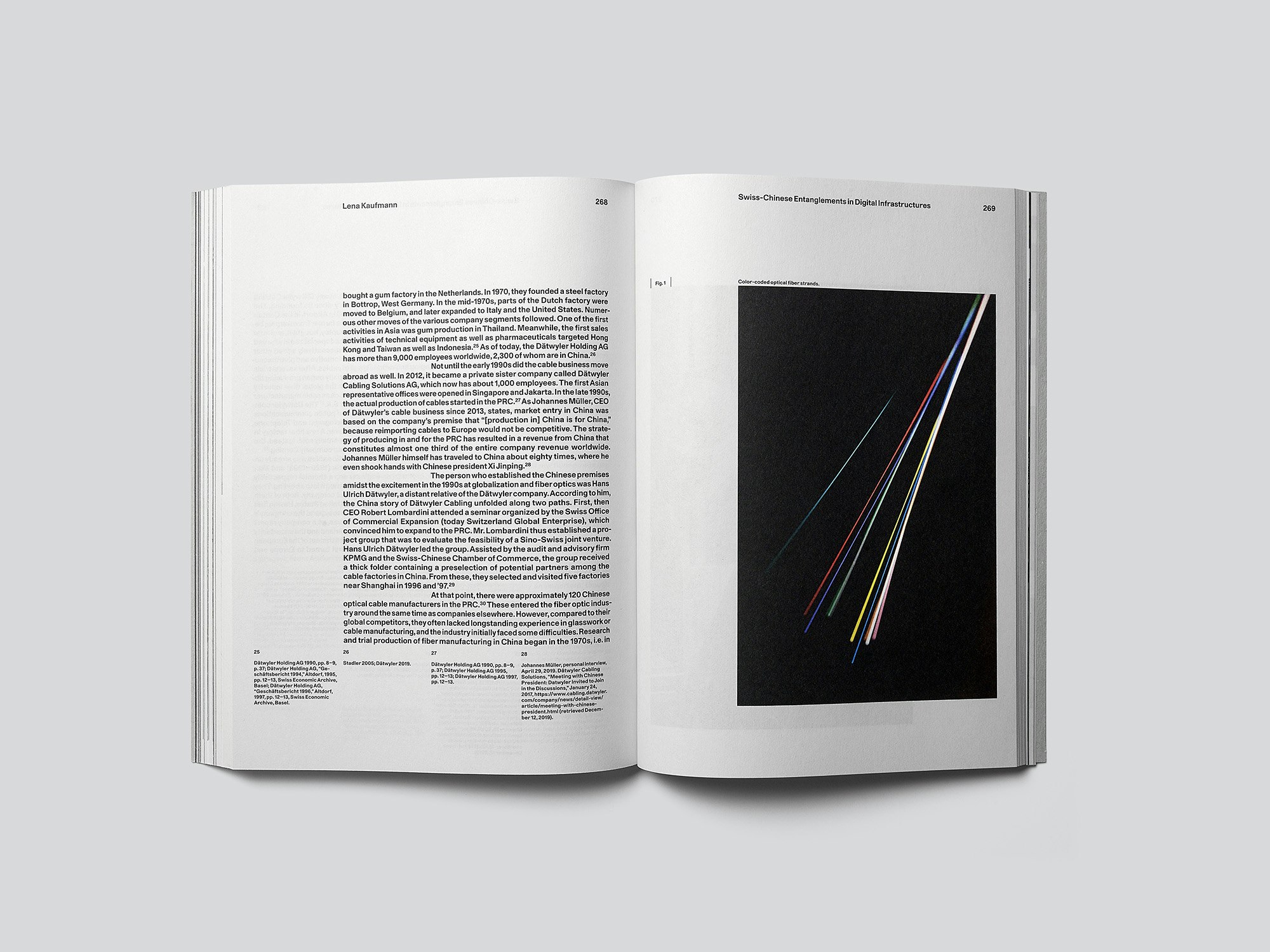 L’abile layout regala ai densi contenuti di una raccolta scientifica sul contesto giuridico, politico ed economico-energetico dell’infrastruttura server svizzera una leggerezza sorprendente, che permette al volume di rivolgersi a un vasto pubblico. Tra i contributi testuali accompagnati da immagini per lo più in bianco e nero, che su carta grigia e in un layout uniforme producono la giusta impressione di un’arida trasmissione di informazioni, si inseriscono saggi fotografici in quadricromia, che trasferiscono su foto lucide – sempre una per pagina o doppia pagina – l’estetica sterile delle stazioni server. La disposizione asimmetrica del testo, con le note a piè di pagina che in modo insolito si estendono da sinistra verso destra su tutta la larghezza della pagina, crea enorme dinamismo. Non coincidendo sempre con il testo principale, tali note danno piuttosto l’impressione di informazioni pluristratificate, che giungono in un flusso di dati a cadenza regolare. La copertina flessibile, realizzata in cartoncino grigio uso mano, dona morbidità al libro e trasmette, insieme alla propria veste tipografica, un senso di semplicità. La coerenza del libro come oggetto tridimensionale è sottolineata dalle leggere transizioni grafiche che si notano dalla prima alla quarta di copertina, attraverso il dorso.