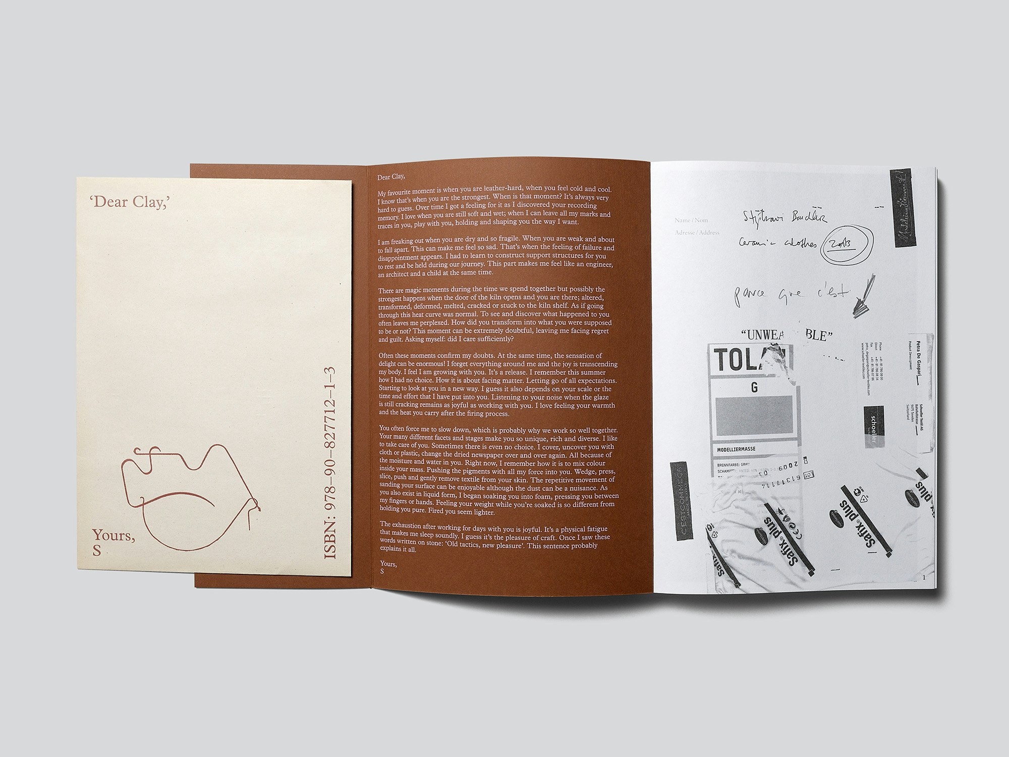 L’artista Stéphanie Baechler (*1983), proveniente dal fashion design, produce oggetti e installazioni in argilla e tessuti; in questa monografia offre una soluzione lineare per presentare il suo lavoro, mostrando esclusivamente i processi seguiti. Componente principale del volume sono le pagine degli sketchbook di Baechler, alcune delle quali sono riprodotte in facsimile con i bordi visibili. Inoltre, ci sono fotografie di singoli passaggi della produzione delle opere, raggruppate senza un ordine particolare e a volte leggermente oblique sulla pagina. L’interazione fra disegni e fotografie è armonica e si traduce in una pubblicazione coerente e dall’aspetto organico che offre una buona prospettiva sul modo di lavorare dell’artista. C’è armonia anche fra i tre tipi di carta e la copertina flessibile leggermente ruvida. Nonostante alcuni dettagli appariscenti, come i segnalibri di stoffa liberamente inseriti o i disegni e la firma sui risvolti, il design non appare pretenzioso. Due testi dell’artista e due di autori esterni, inseriti rispettivamente sui lati interni della sovraccoperta e su fogli sciolti riposti in un sacchetto di campioni di ritaglio inserito nel volume, spiegano prassi e obiettivi artistici in stile epistolare, rivolgendosi a elementi e materiali con incipit quali «Dear Silhouette» o «Dear Clay».