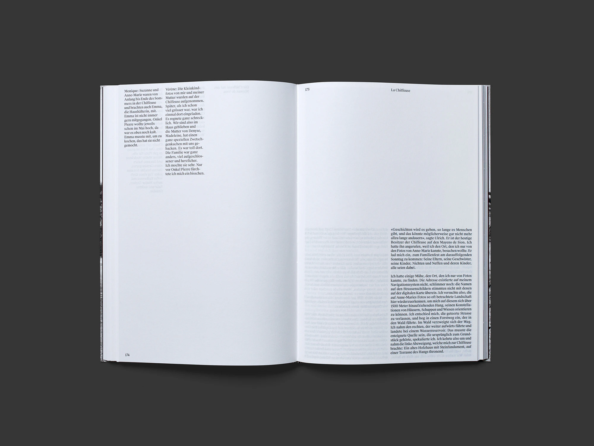 Questo libro di fotografia di medio formato, la cui copertina rigida mostra uno scatto in bianco e nero di una strada di campagna che continua a cavallo del dorso, presenta l’affascinante opera della finora sconosciuta autodidatta Anne-Marie von Wolff (1893–1974). Circa 200 fotografie in bianco e nero della metà del Novecento, spesso quadrate, sono disposte con margine bianco e larghezza identica perlopiù a coppie su una doppia pagina. Le immagini mo-strano la quotidianità di una vita familiare ripartita fra varie località ed evasioni estive dagli occhi di un’emarginata che, a causa dell’epilessia e della tubercolosi, non poteva frequentare la scuola e raramente aveva il permesso di uscire all’aperto. Si intervallano pagine di testo con considerazioni della curatrice del libro (e pronipote della fotografa) ed estratti di conversazioni con i familiari. Alcune doppie pagine fotografiche contengono sparute righe di testo dall’effetto poetico, e trovano posto anche singole fotografie di ambienti vuoti scattate dalla curatrice, stampate al vivo a colori. La selezione delle immagini e le combinazioni sulle doppie pagine sono tutte delicate e poetiche, in un layout tanto semplice quanto elegante. Un libro d’archivio che narra anche una storia familiare dal mondo decaduto di una classe sociale.