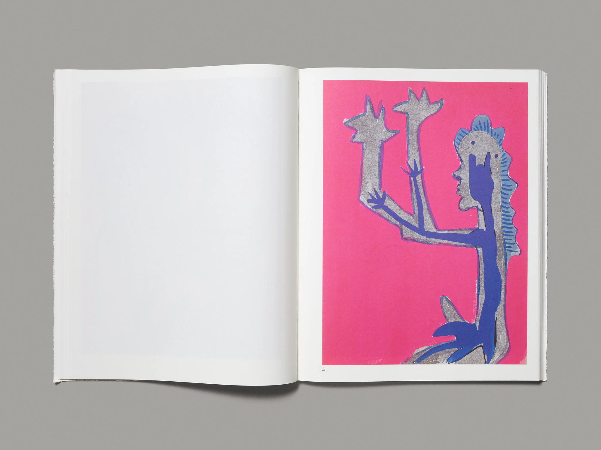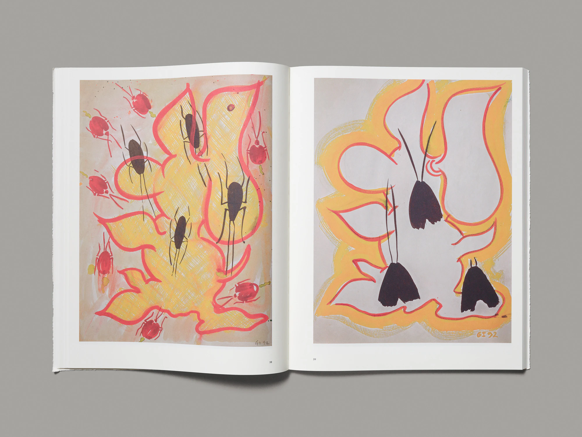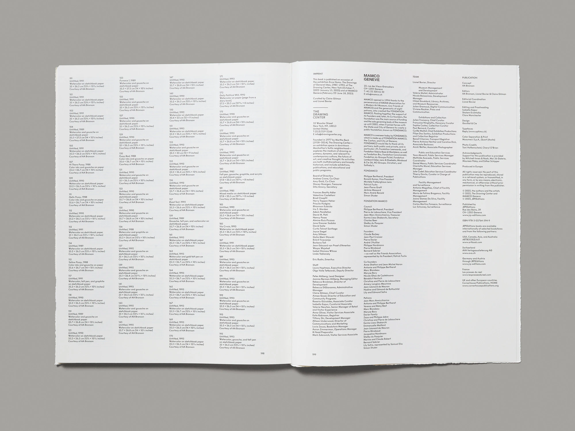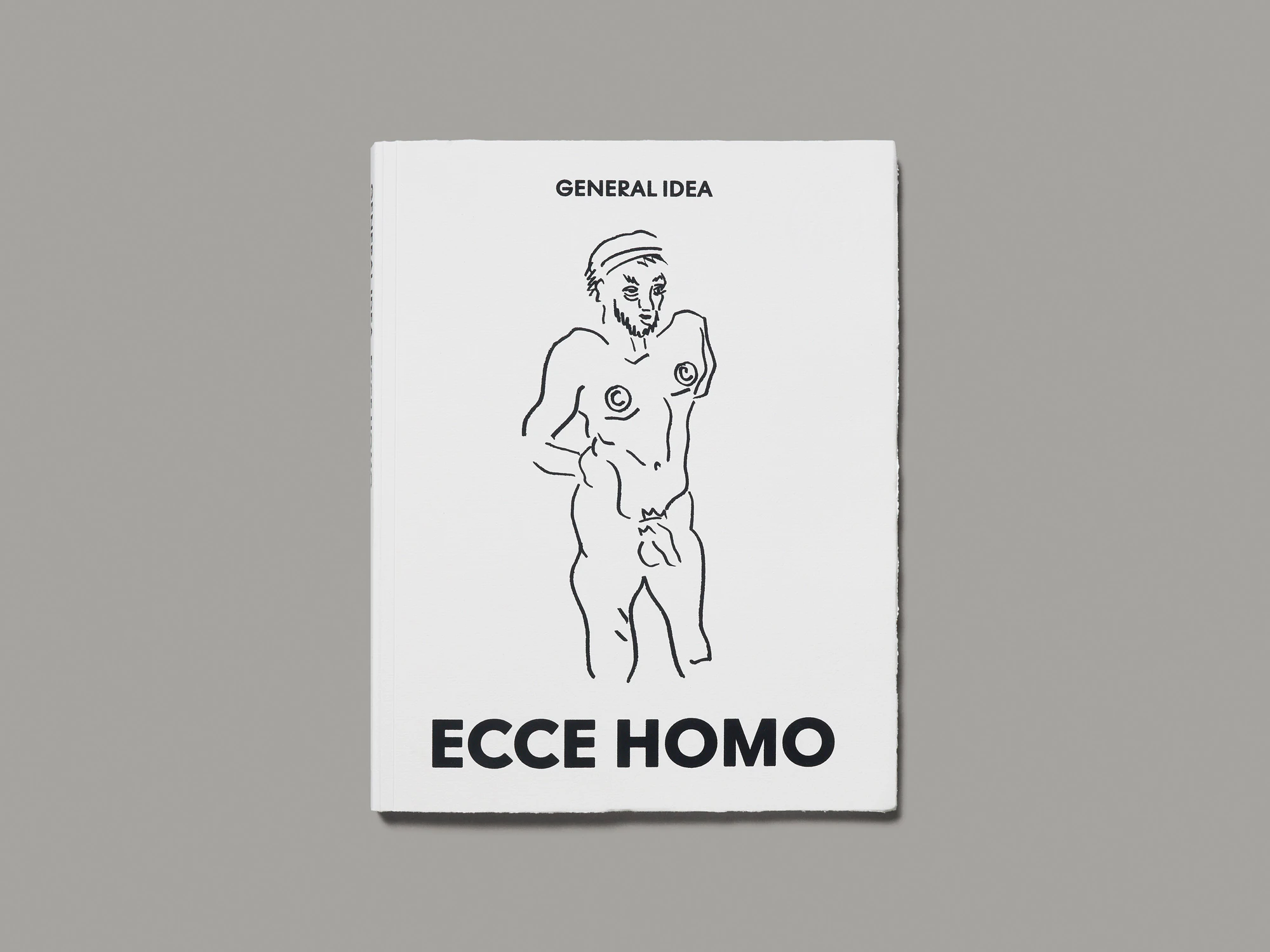 Questo libro grande e pesante ma alquanto flessibile di General Idea produce sin da subito un forte effetto tattile grazie agli irregolari bordi strappati della copertina morbida stampata in nero su bianco. Si tiene molto bene in mano e invita a sfogliare le pagine. Su ogni pagina destra (ogni tanto anche sulla sinistra) si può osservare, sempre nello stesso grande formato, un disegno colorato di volti e figure caricaturali, composto di forme astratte, genitali, corpi di animali, oggetti della quotidianità o motivi buddisti. I disegni nascono come attività collaterale dell’arte concettuale di General Idea, praticata in varie sessioni di lavoro all’inizio degli anni Novanta. Nonostante la firma collettiva G.I., sono tutte opere di Jorge Zontal, morto di AIDS nel 1994, come il collega Felix Partz. Il volume è edito da AA Bronson, terzo membro di General Idea, che in questo modo commemora i suoi amici e la comunità omosessuale newyorkese di quegli anni, devastata dalla sindrome da HIV. Proprio con quella comunità vuole creare un richiamo il titolo Ecce Homo, alludendo a un topos caro a un determinato filone artistico e conferendogli un’accezione differente. Fisicità e vulnerabilità si esprimono anche in un sottile pieghevole rosa contenente due testi esplicativi e inserito nel libro. La riproduzione dei disegni è eccellente nonostante la carta uso mano.