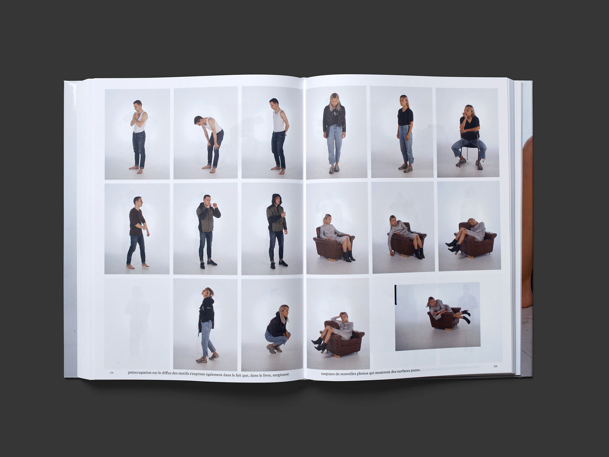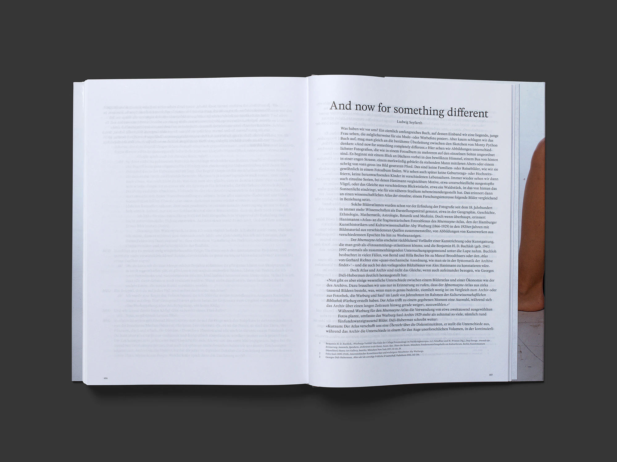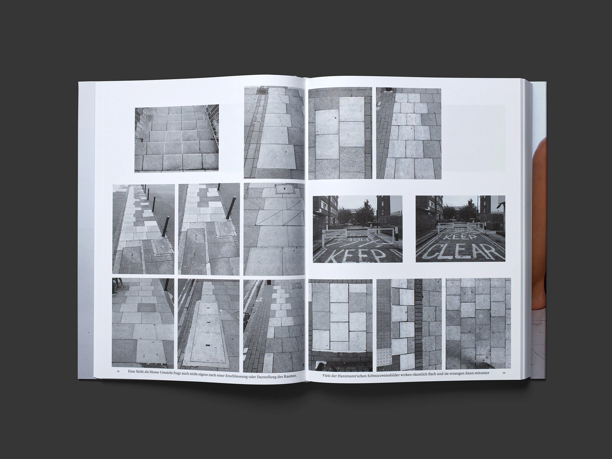 Più di 3000 fotografie scattate in dodici anni di lavoro preparatorio e ricerca dell’artista sangallese Alex Hanimann vengono presentate in uno spesso e pesante volume a copertina rigida il cui design sfida con sicurezza le convenzioni del genere. La sovraccoperta lucida quadricromatica, che mostra un ritratto della designer Romy Strasser che prosegue a cavallo del dorso, si rivela essere un poster piegato con ampi bordi bianchi e grigi. Si pone in contrasto con l’elegante rilegatura in lino grigio e il marcato carattere con serif, con la carta blu del risguardo come pure con la carta opaca e il layout essenziale delle fotografie all’interno del libro, spesso in bianco e nero. Le immagini sono presentate tutte con dimensioni omogenee, da cinque a nove per pagina e prive di qualsiasi indicazione, benché si riconoscano dei raggruppamenti per tecnica o argomento. I formati verticale e orizzontale seguono una griglia propria ma vengono combinati tra loro a piacimento, il che spesso produce singolari spazi bianchi e un’impaginazione poco chiara. Lungo il margine inferiore delle figure scorre un testo continuo a riga singola nel citato font con serif, con il quale si producono associazioni casuali e inattese con le varie immagini. Un libro performativo che non teme gli «errori» di composizione grafica.