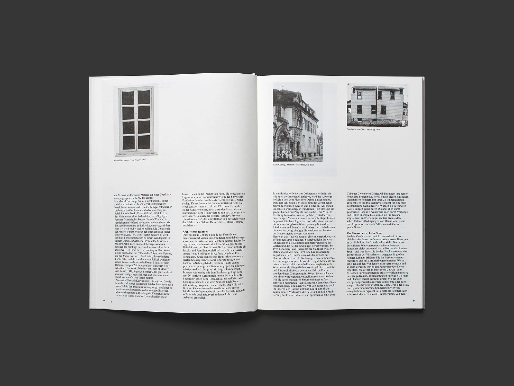 Il catalogo di grande formato del pittore norvegese Fredrik Værslev aderisce con precisione concettuale, nell’organizzazione grafica, alla mostra che documenta. Værslev aveva riprodotto repliche di piccoli telai in legno delle finestre del museo, inserendo sullo sfondo strisce colorate dipinte e motivi floreali che li facevano apparire come scorci paradossali su carte da parati. Il libro presenta il gioco fra interno ed esterno già sulla copertina, che sul lato esterno si presenta con carta da risguardo e riproduce in arancione la struttura di base a sei riquadri dei dipinti. In una prima parte fotografica del libro si trovano su ogni doppia pagina da due a otto dipinti, mostrati in dimensioni uniformi all’interno di una griglia rigorosa. La disposizione sulle singole pagine riproduce l’ordine con cui le opere erano appese alle pareti, come svelano nella seconda parte del volume numerose fotografie degli spazi espositivi. Si tratta di viste stampate al vivo su uno o entrambi i lati che si alternano a doppie pagine bianche su cui appaiono soltanto le legende e la cui forte luminosità porta avanti il gioco tra finestra e luce. La prima e l’ultima pagina del libro sono incollate direttamente sulla copertina. I vari elementi del catalogo danno vita a una vera e propria scenografia, e sebbene il libro ricordi le opere storiche di riferimento, l’effetto è di singolare novità.