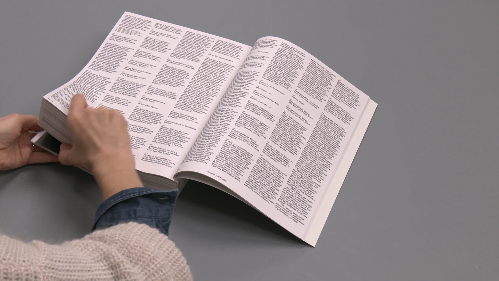 Un libro di fotografia molto spesso e flessibile realizzato con carta riciclata presenta un carosello di immagini di respiro globale che creano un debordante «flusso di coscienza ». Oltre 600 fotografie, per lo più in bianco e nero, realizzate nel corso di un decennio in quattro continenti, si presentano senza commenti, in genere disposte individualmente su una pagina. Per quanto siano tutte allineate rigidamente a un angolo della griglia di composizione, attraverso le dimensioni e i posizionamenti variabili, i layout interagiscono abilmente con le peculiarità formali delle singole immagini. Si intervallano qua e là anche ampie fotografie a doppia pagina, che lasciano uno stretto margine bianco solo a sinistra e a destra. La sequenza delle immagini segue criteri tematici e formali: spesso è un’analogia visiva o estetica a creare il passaggio da un’immagine alla successiva. Il risultato è una narrativa enigmatica, che si dipana solo alla fine in una parte testuale di quattro colonne con didascalie dettagliate. Tuttavia, poiché i numeri delle immagini che fungono da sistema di riferimento in tutto il libro sono stampati molto all’interno della pagina, vicino alla rilegatura, e risultano quindi appena visibili, l’uso delle didascalie rimane facoltativo. L’accattivante oggetto libro sconcerta per la presenza di una colonna di didascalie sul dorso. Benché due immagini formalmente simili sulla prima e sulla quarta di copertina diano una giusta indicazione sul contenuto del libro, la prima impressione è piacevolmente criptica.