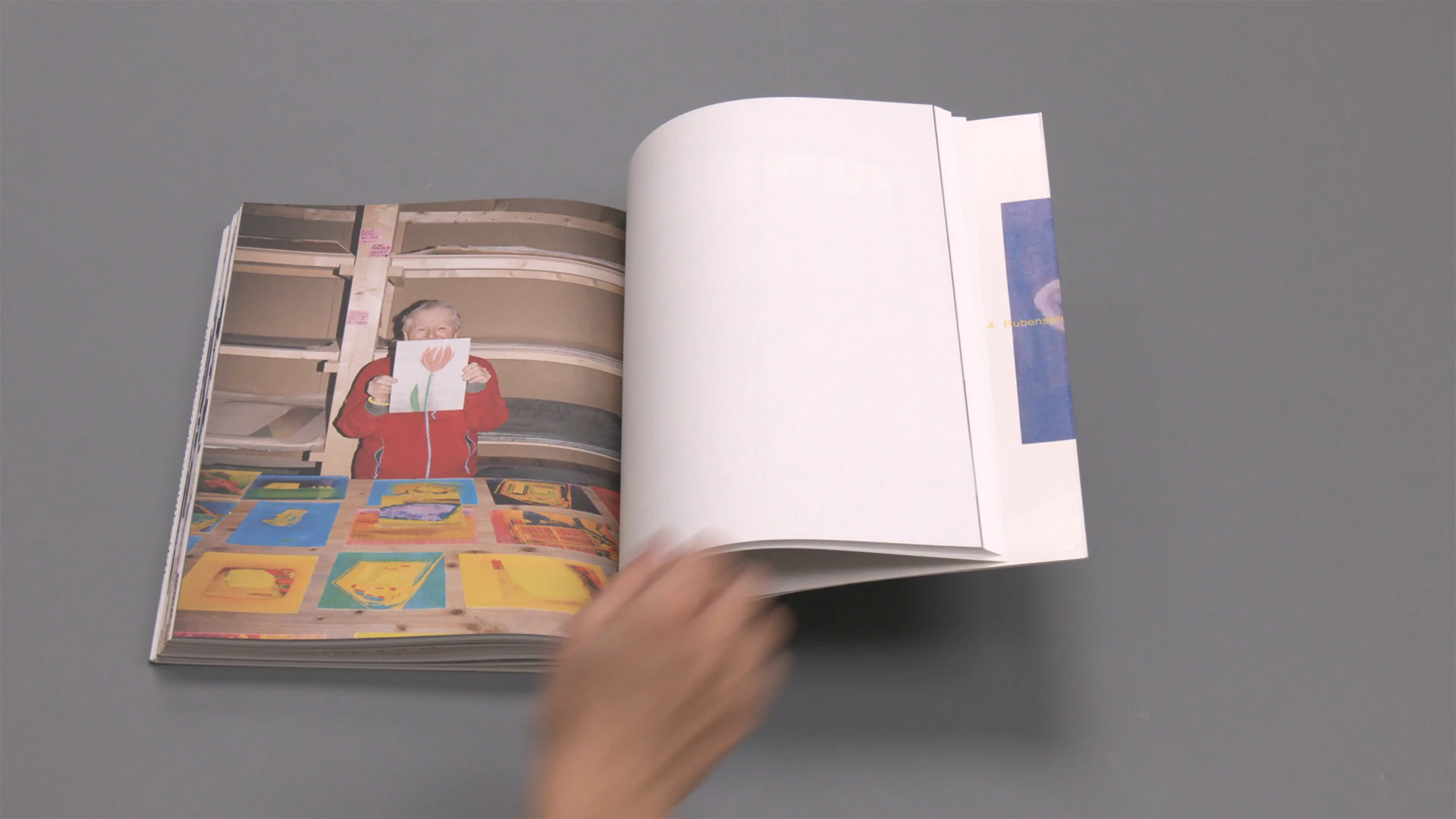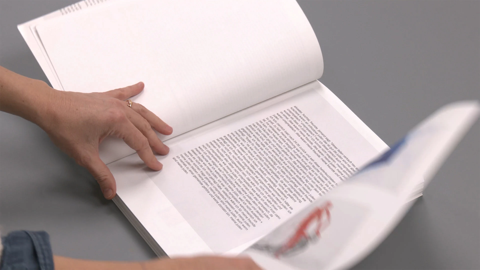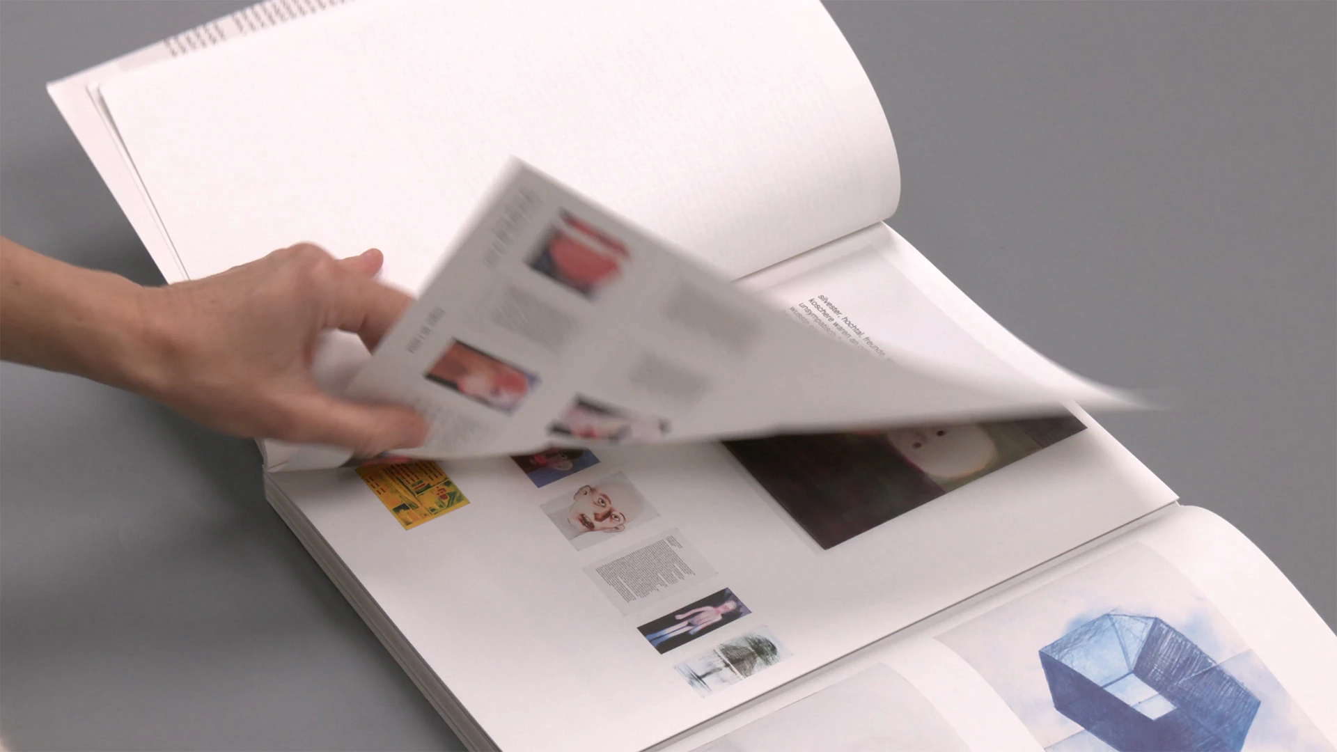 Questo catalogo, ampio ma comunque molto maneggevole e gradevole al tatto, illustra una retrospettiva di Miriam Cahn, offrendo una virtuosa trasposizione dell’installazione espositiva nell’oggetto libro. Ogni capitolo presenta i dipinti che erano esposti nella stessa sala riunendoli all’interno di una doppia pagina ripiegata. Aprire un risvolto equivale a entrare in una sala e immergersi in una sequenza di pagine fotografiche (pochi dipinti disposti liberamente su un generoso sfondo bianco) e immagini degli spazi espositivi (sempre a doppia pagina e stampate al vivo). In entrambe le varianti rappresentative, le didascalie si collocano in modo uniforme sotto le immagini, a sottolineare l’analogia tra parete e pagina. Alcuni dipinti vengono presentati più volte in scale differenti, come se il pubblico si avvicinasse o si allontanasse dalla parete. Questo dinamismo prosegue nelle successive parti testuali, in cui i caratteri rimpiccioliscono progressivamente per simboleggiare l’allontanamento di chi osserva. Dato che grazie alle pagine ripiegate alcune sale si possono saltare, si lascia al pubblico parte della grande libertà di cui fanno uso la pittrice e la designer.