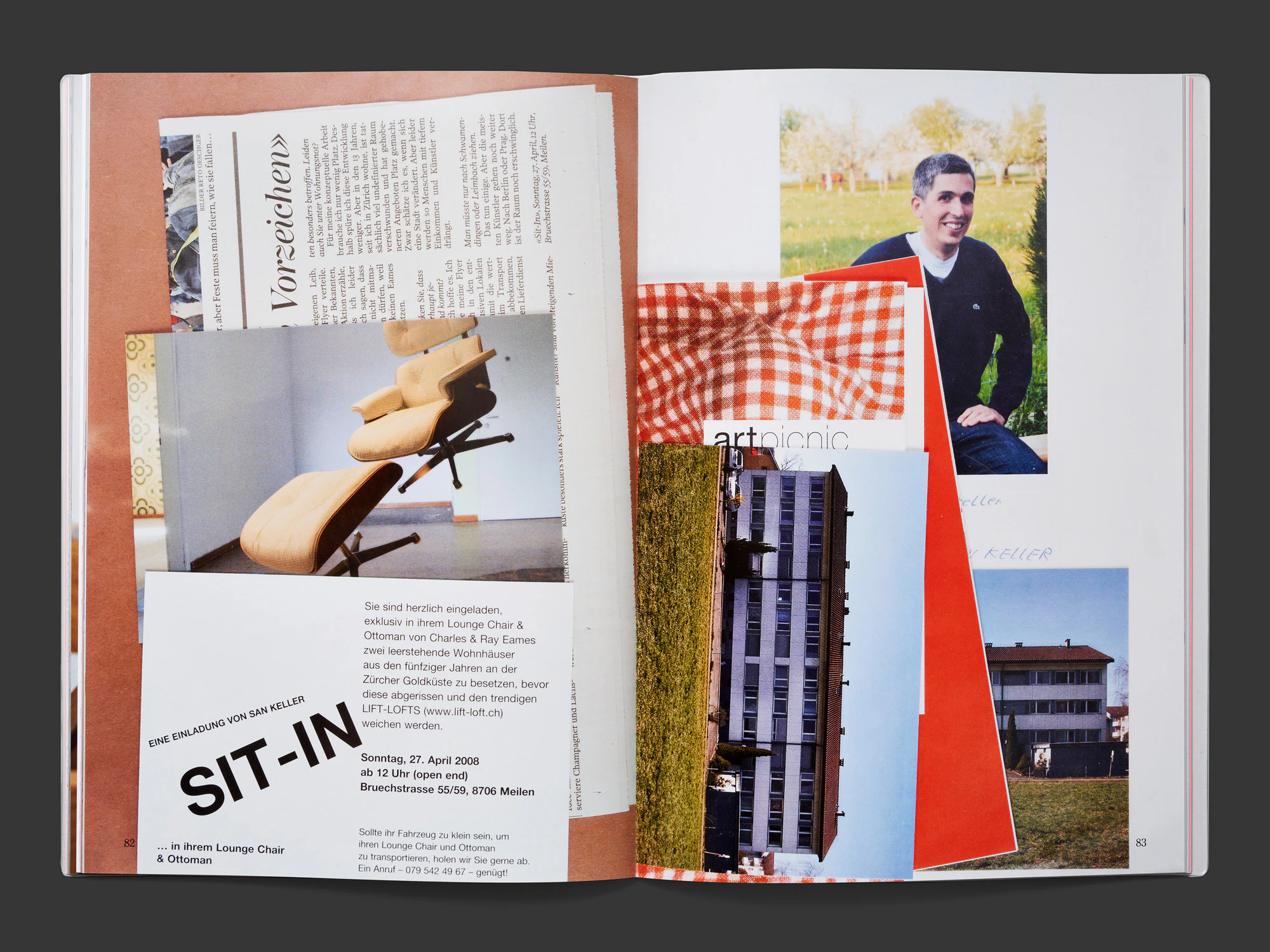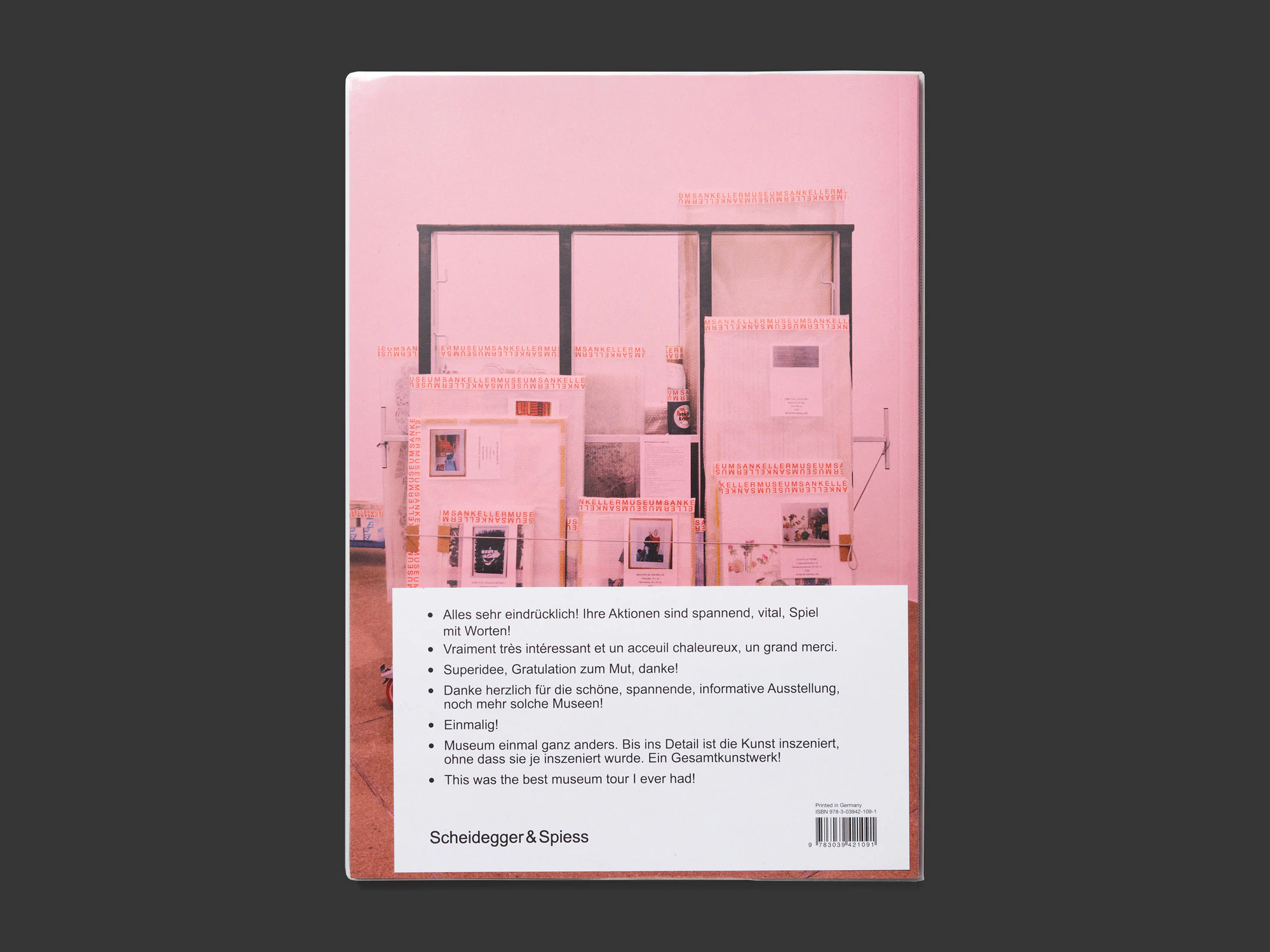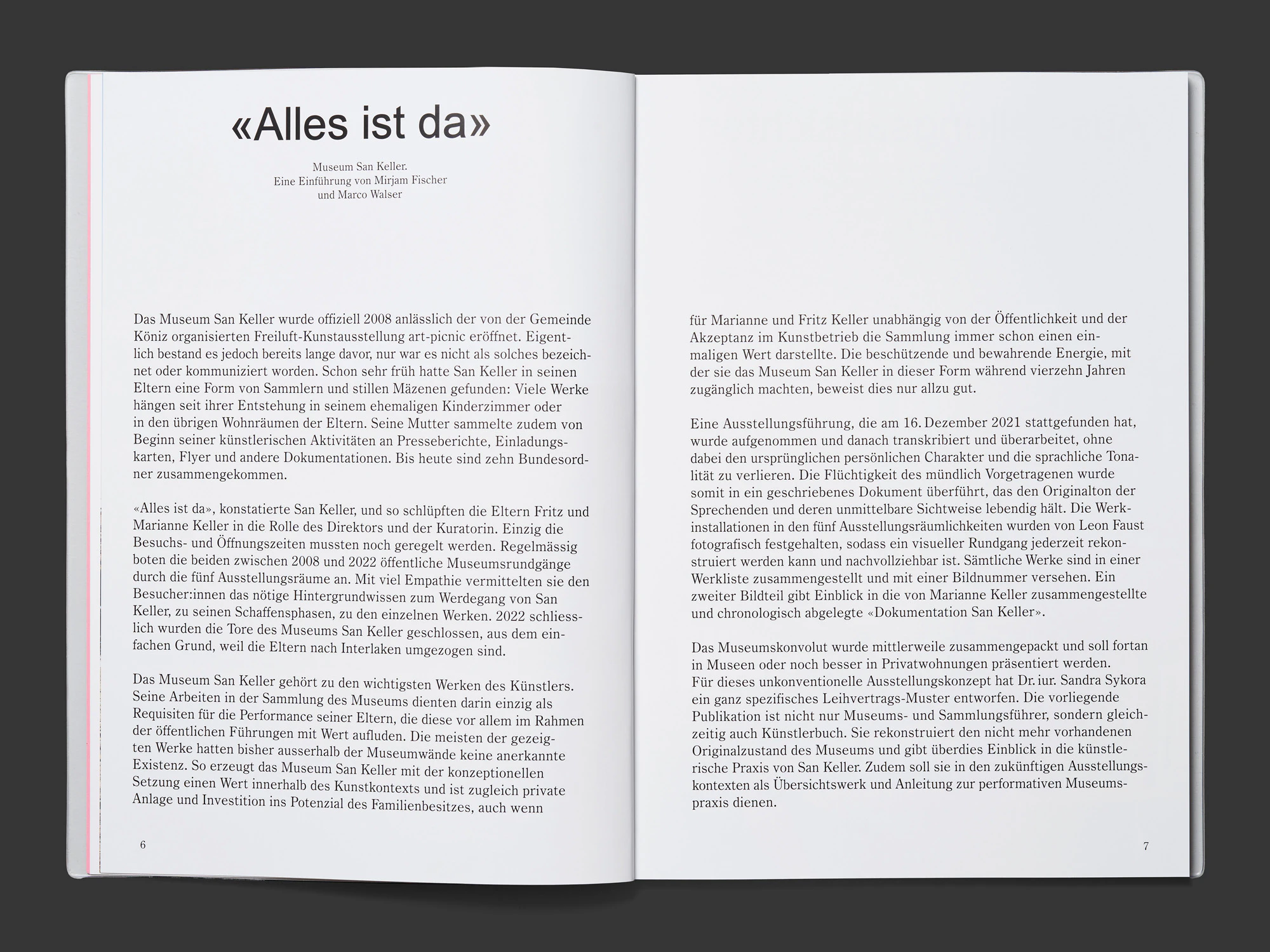 Il catalogo del museo San Keller trasporta abilmente l’esposizione nel formato libro e sviluppa le riflessioni dell’artista sul rapporto tra arte e pubblico. Il museo, aperto dal 2008 al 2022, coincideva con l’abitazione dei genitori di Keller, che avevano conservato numerose opere del figlio e offrivano visite guidate private. La prima parte del libro presenta un insieme di viste dell’esposizione, stampate al vivo su doppia pagina, e riproduce un tour dell’appartamento. Le opere appese alle pareti sono contrassegnate con numeri inseriti a posteriori nelle foto per rinviare all’elenco esplicativo alla fine di questa parte. Una seconda sezione fotografica presenta, tra gli altri, inviti a esposizioni e ritagli di giornale che parlano di Keller: vengono mostrati all’interno di cartelline trasparenti sovrapposte, le stesse in cui i genitori avevano raccolto il materiale. Il catalogo si sfoglia con grande semplicità, così com’era accessibile il museo, e il design con i caratteri grandi è scorrevole e lineare. La sovraccoperta in plastica trasparente e le etichette di carta sottostanti ricordano una raccolta personalizzata, ma creano un contrasto con la carta lucida. Il libro sarebbe stato benissimo su una mensola o un tavolino del museo San Keller.