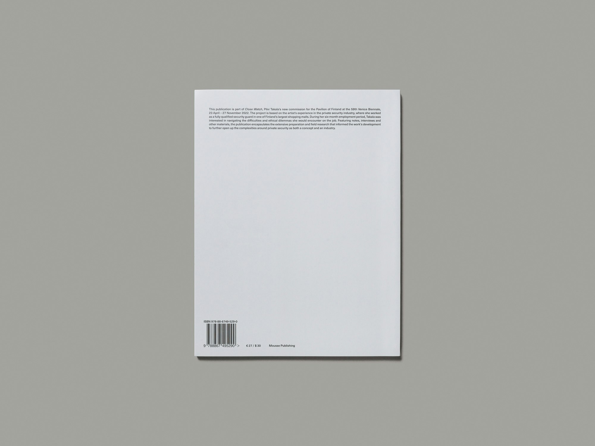 Un sottile catalogo d’arte nel formato tipico delle monografie Phaidon è caratterizzato dall’aspetto burocratico tipico di un’azienda privata di servizi di sicurezza che il lavoro artistico si propone di studiare. La finlandese Pilvi Takala si è fatta ingaggiare per sei mesi come addetta alla sicurezza di un centro commerciale, trasformando poi le sue esperienze in un’installazione video per la Biennale di Venezia. Il libro in brossura svizzera si presenta come una pila di documenti all’interno di una cartellina cartonata: moduli, lettere, distinte dei compensi, appunti presi dall’artista sul campo e numerose foto ravvicinate stampate al vivo di spazi di lavoro e conversazioni tra membri del team nella loro uniforme grigio-blu. Tutti i testi sono stampati in caratteri e dimensioni uniformi, in genere su tre colonne, mentre i documenti sono riprodotti come facsimile e in alcuni casi (anche) trascritti. L’effetto generale è di stoicismo, a volte anche di freddezza, e dal punto di vista del design è una scelta coraggiosa permettere che sia così. Dirompono con enorme nettezza l’estetica della violenza istituzionalizzata e le sue dimensioni performative. La trattazione pacata dei contenuti favorisce una riflessione seria sul tema, rendendolo accessibile, soprattutto di fronte alle scene di abuso di violenza talvolta riportate.
