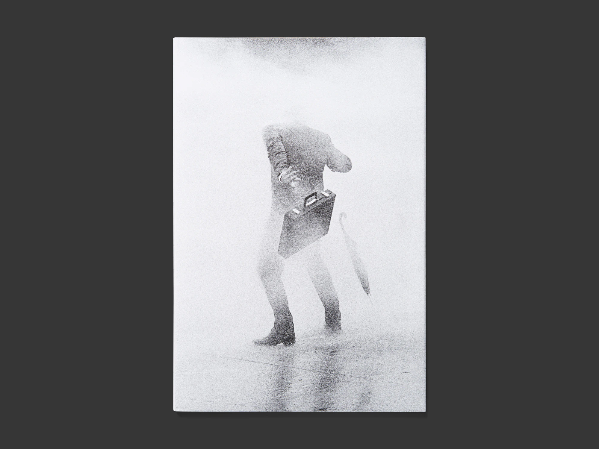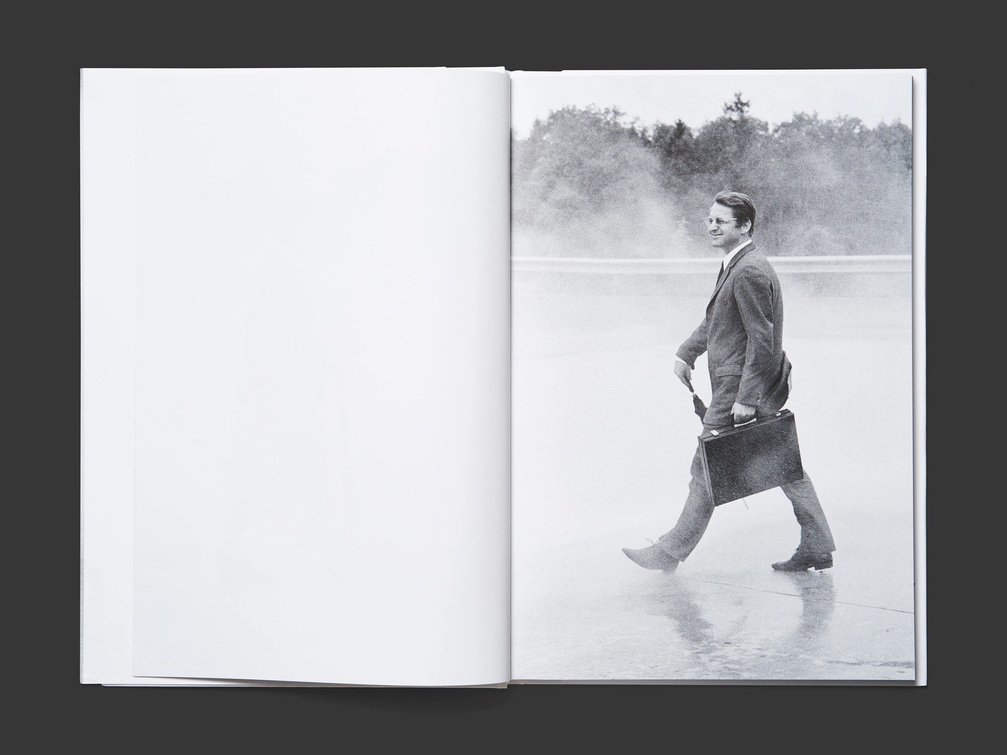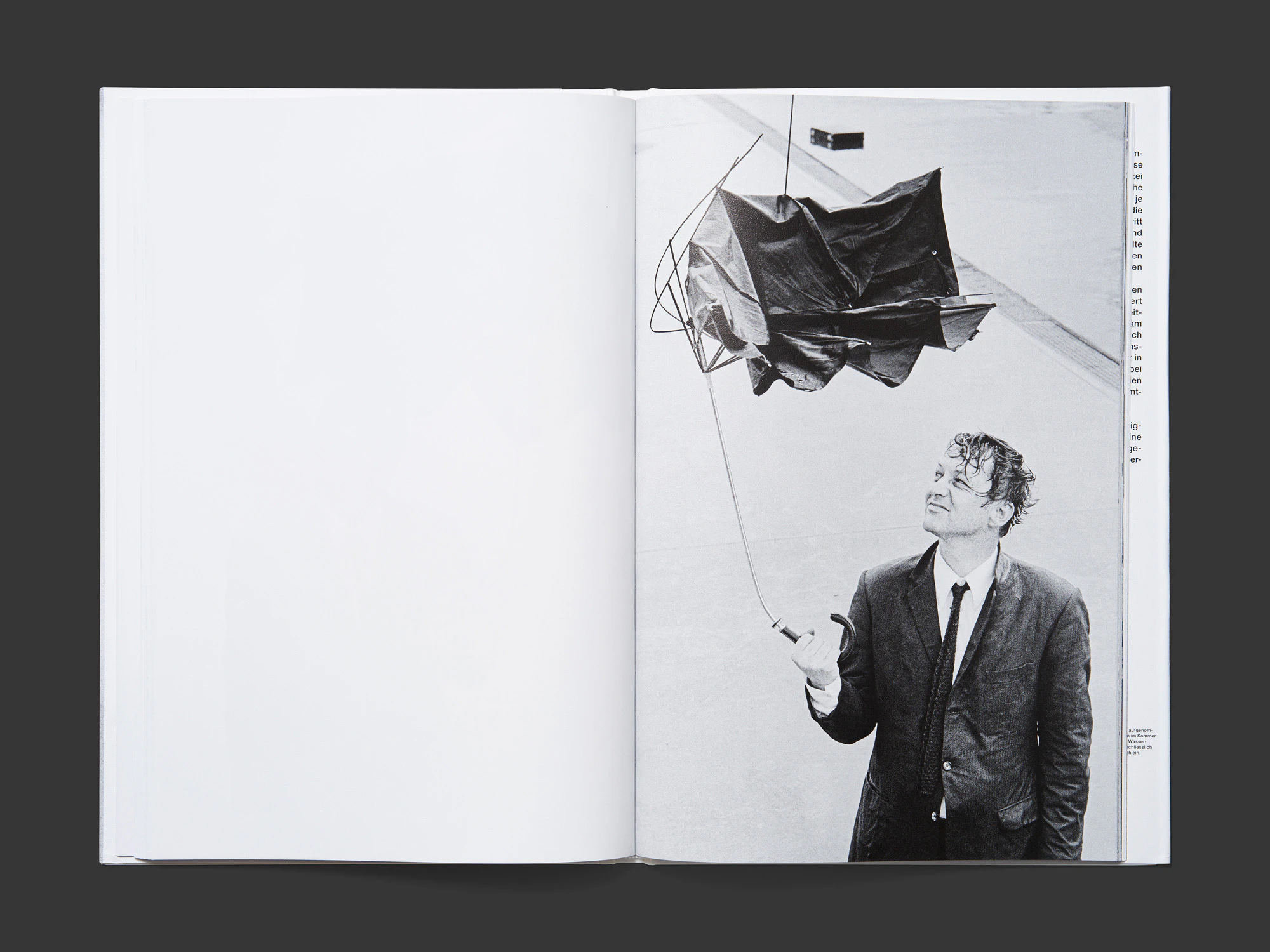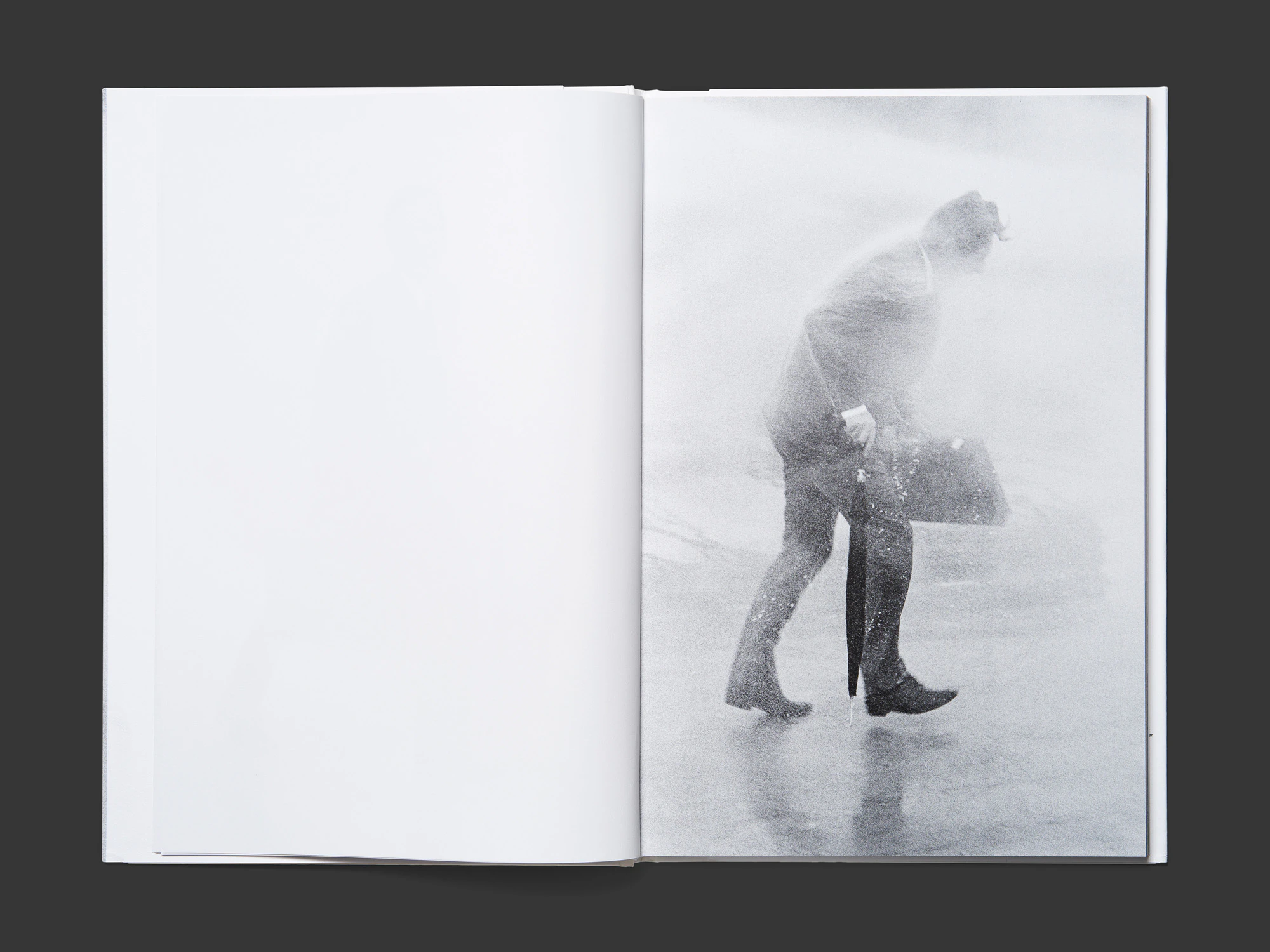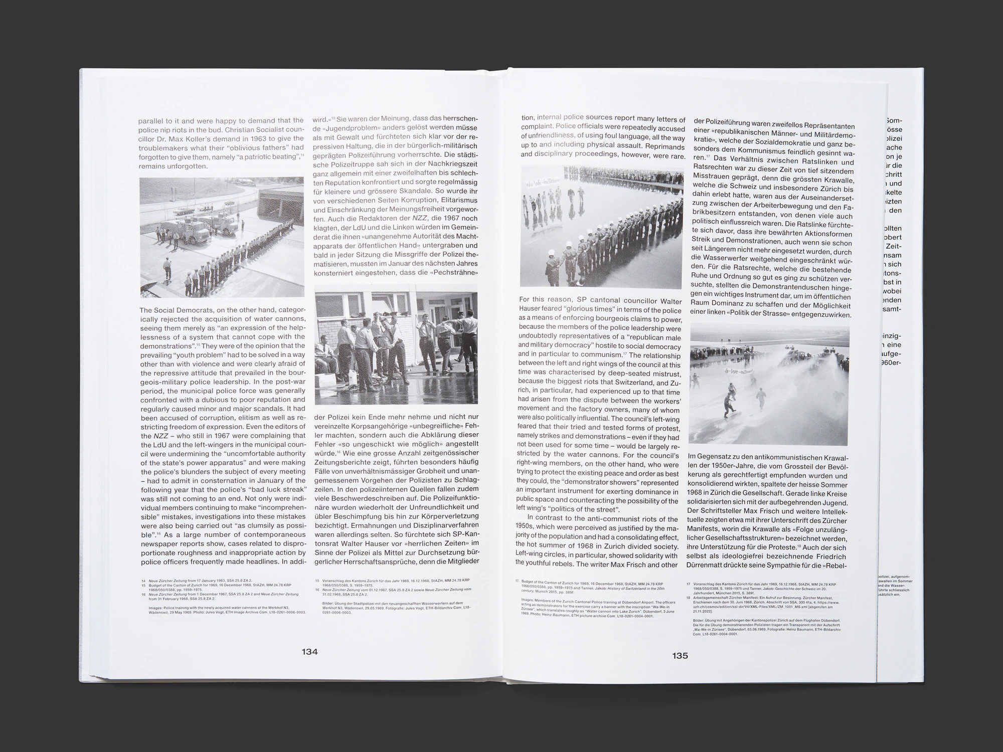 Un libro di fotografia sottile ma pesante, con copertina rigida e sovraccoperta, trova un approccio originale e illuminante per una serie di immagini inedite realizzate nel maggio del 1969. Prive di qualsiasi elemento tipografico, le oltre 60 istantanee in bianco e nero, tutte stampate al vivo sulla pagina destra, mostrano un giornalista della rivista Sie und Er, vestito di tutto punto con ventiquattrore e ombrello, che durante un test si piazza davanti ai cannoni ad acqua che la polizia di Zurigo aveva appena acquistato, fino a infradiciarsi completamente. Benché siano state scattate per scopi giornalistici e non se ne prevedesse una pubblicazione seriale, con questa nuova presentazione le immagini evocano l’arte concettuale e performativa dell’epoca. Al contempo fungono da memoria visiva che, con un manifestante dall’aspetto inedito, offre una visione sorprendente dei disordini politici di Zurigo. Dalla dimensione al formato, dalla carta spessa ai caratteri larghi, tutte le decisioni di impaginazione sono azzeccate. L’insolita carta antiscivolo della sovraccoperta enfatizza la granularità delle foto storiche.