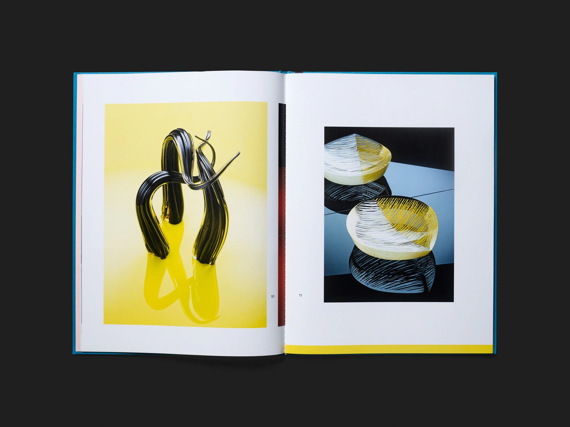 Il libro molto sottile e rigido dall’estetica lucida funge da vetrina perfetta per una collezione privata di oggetti in vetro colorato. In un design sontuoso con titolo stampato a rilievo e varie tipologie di carta vengono mostrate 36 fotografie iperrealistiche di manufatti singoli o a gruppi – per lo più davanti a degli specchi. La messa in scena sembra quasi esagerata, ma rende giustizia alle opere d’arte vetraria con le loro superfici scintillanti e riflettenti. Gran parte del lavoro di design risiede nell’eccellente redazione delle immagini e nella litografia. Le pagine sono state tagliate in modo tale da far sempre vedere accanto a una fotografia in grande formato la parte iniziale di una seconda, dando l’impressione che la collezione sia un continuum. Questa scelta toglie un po’ di pregiata unicità agli articoli, stimolando i raffronti. I numeri di pagina valgono anche come numeri delle immagini e contribuiscono, con la loro accorta disposizione, all’idea che gli oggetti si trovino uno accanto all’altro su un grande tavolo, così che gli osservatori possano spostare lo sguardo dall’uno all’altro a piacimento. Un indice didattico delle figure sulla carta rosa chiaro del risguardo permette di mantenere sempre la visione d’insieme.