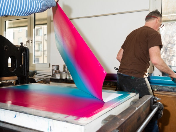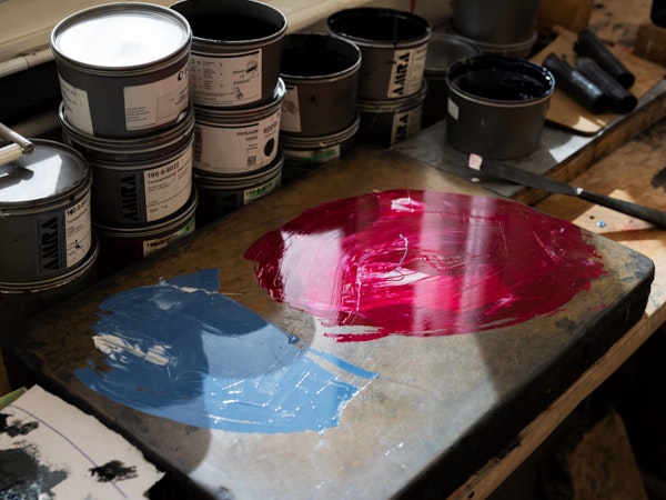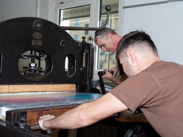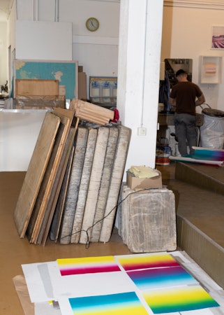 Lo studio di litografia (in tedesco Steindruck, letteralmente stampa su pietra) di Thomi Wolfensberger, dove le macchine da stampa portano nomi quali Emma Stone o Gertrude Stein (ossia pietra, rispettivamente in inglese e tedesco), rappresenta un pezzo di storia della stampa svizzera. Sin dalla fondazione nel 1902, l’istituto grafico J.E. Wolfensberger AG di Zurigo si è posto l’obiettivo di coniugare arte e prodotti stampati di alta qualità. Alla fine degli anni Ottanta, quando Thomi Wolfensberger assunse la direzione del reparto litografia dell’azienda di famiglia, il periodo di gloria della litografia classica era terminato. Da subito egli trovò nell’arte e in proficue collaborazioni con artisti e artiste il modo per mantenere vivo il lavoro manuale. Per rendere reali le visioni artistiche Wolfensberger sfrutta le possibilità offerte dai processi litografici e scopre sempre soluzioni molto specifiche e nuove, che si tratti di ulteriori sviluppi tecnologici nella stampa di gigantografie, all’aria aperta o direttamente sui muri, di prove sperimentali nel campo del monotipo, della fotografia, dell’uso del colore, oppure di uno speciale processo per rilevare litograficamente l’impronta di un animale. La propensione al rischio e la fiducia reciproca sono la base di qualsiasi cooperazione. Collaborazioni durature e frequenti con artisti e artiste svizzeri come Fischli/Weiss, Samuel Buri, Shirana Shahbazi, Huber/Huber, Zilla Leutenegger, Dominique Lämmli, Michael Günzburger, Dominik Stauch, Adrian Schiess, ma anche internazionali quali John Baldessari, Wade Guyton, Wolfgang Laib e Douglas Gordon hanno reso lo studio di litografia un vero e proprio centro di stampa per artisti e artiste.