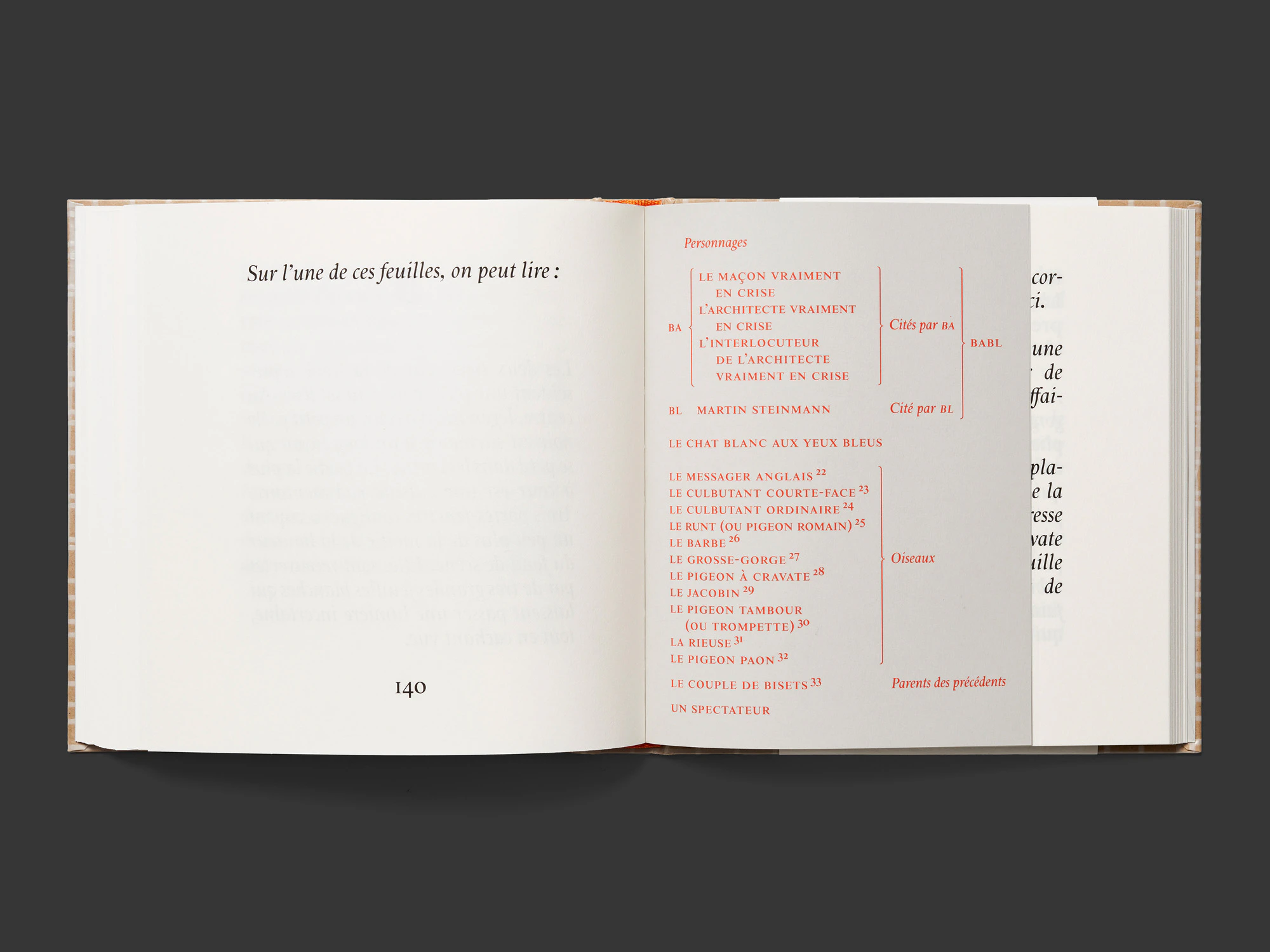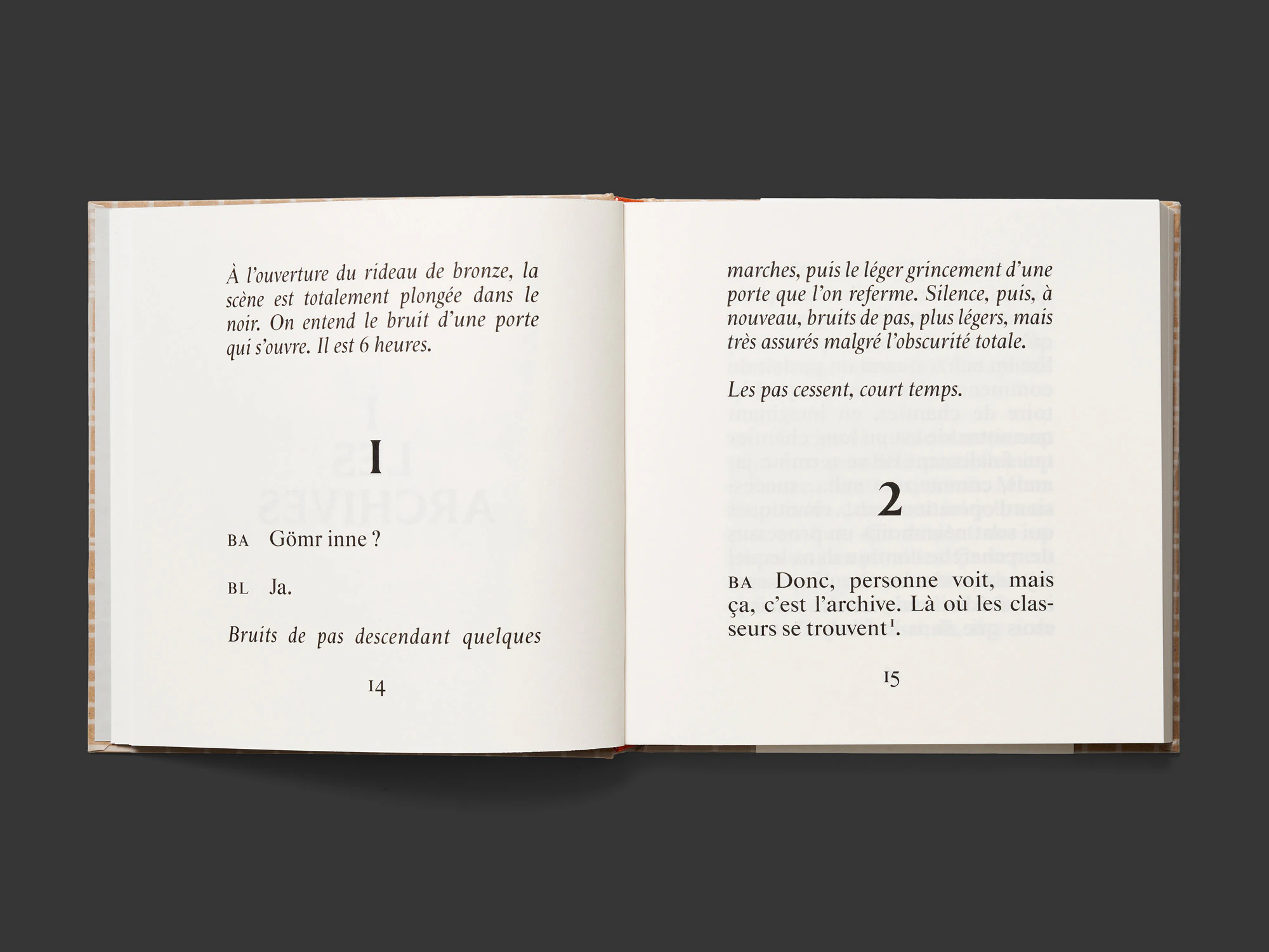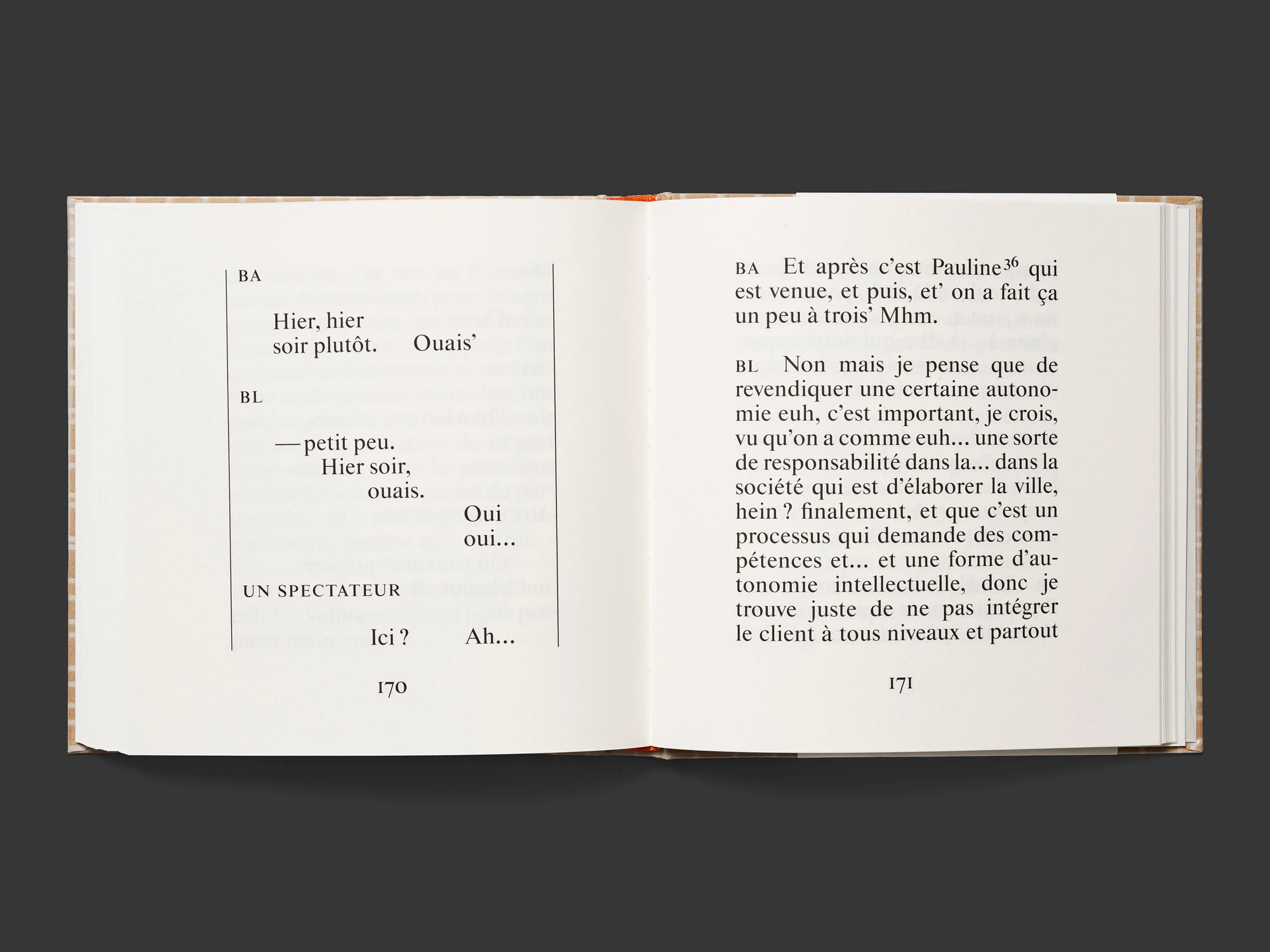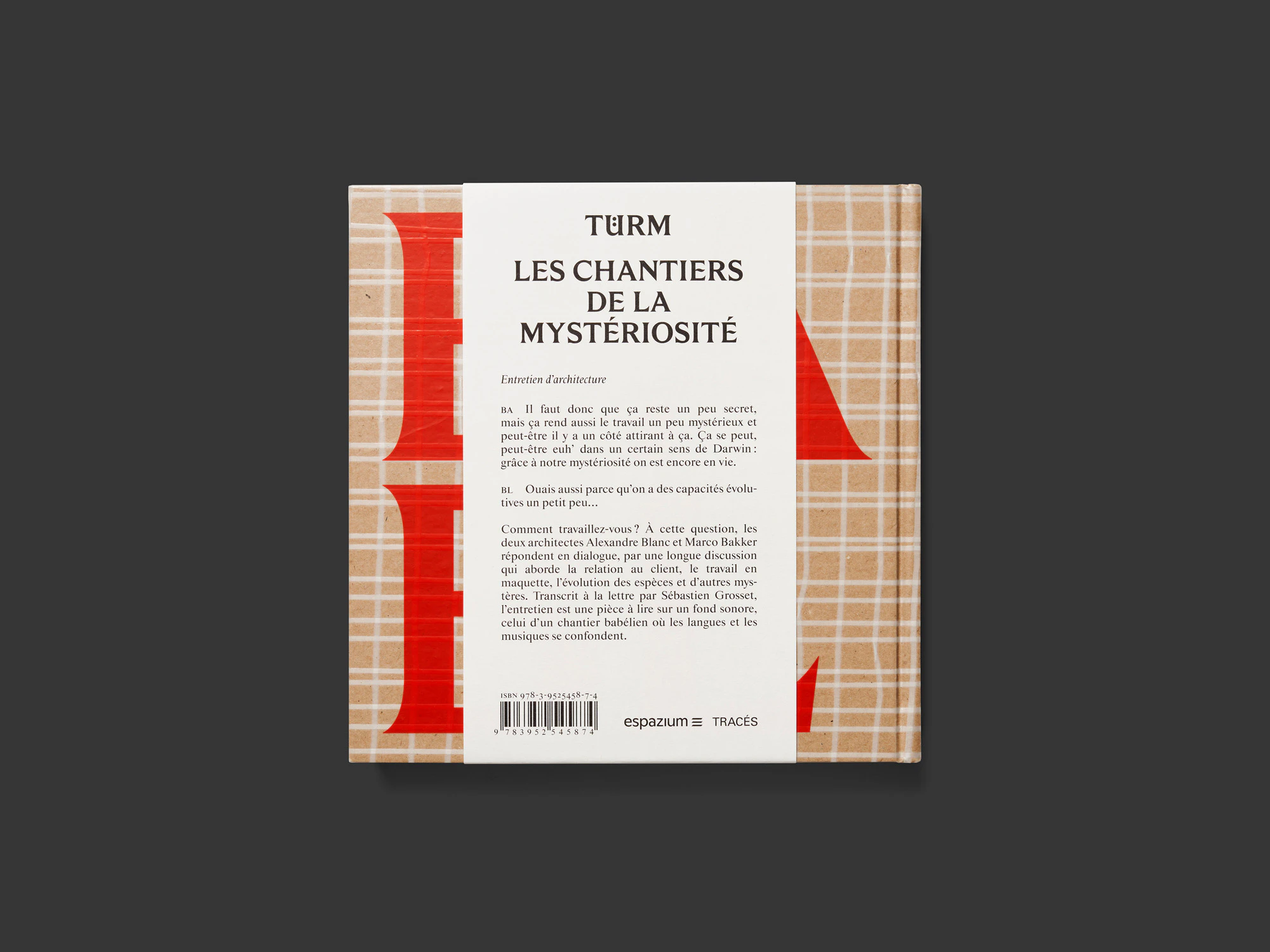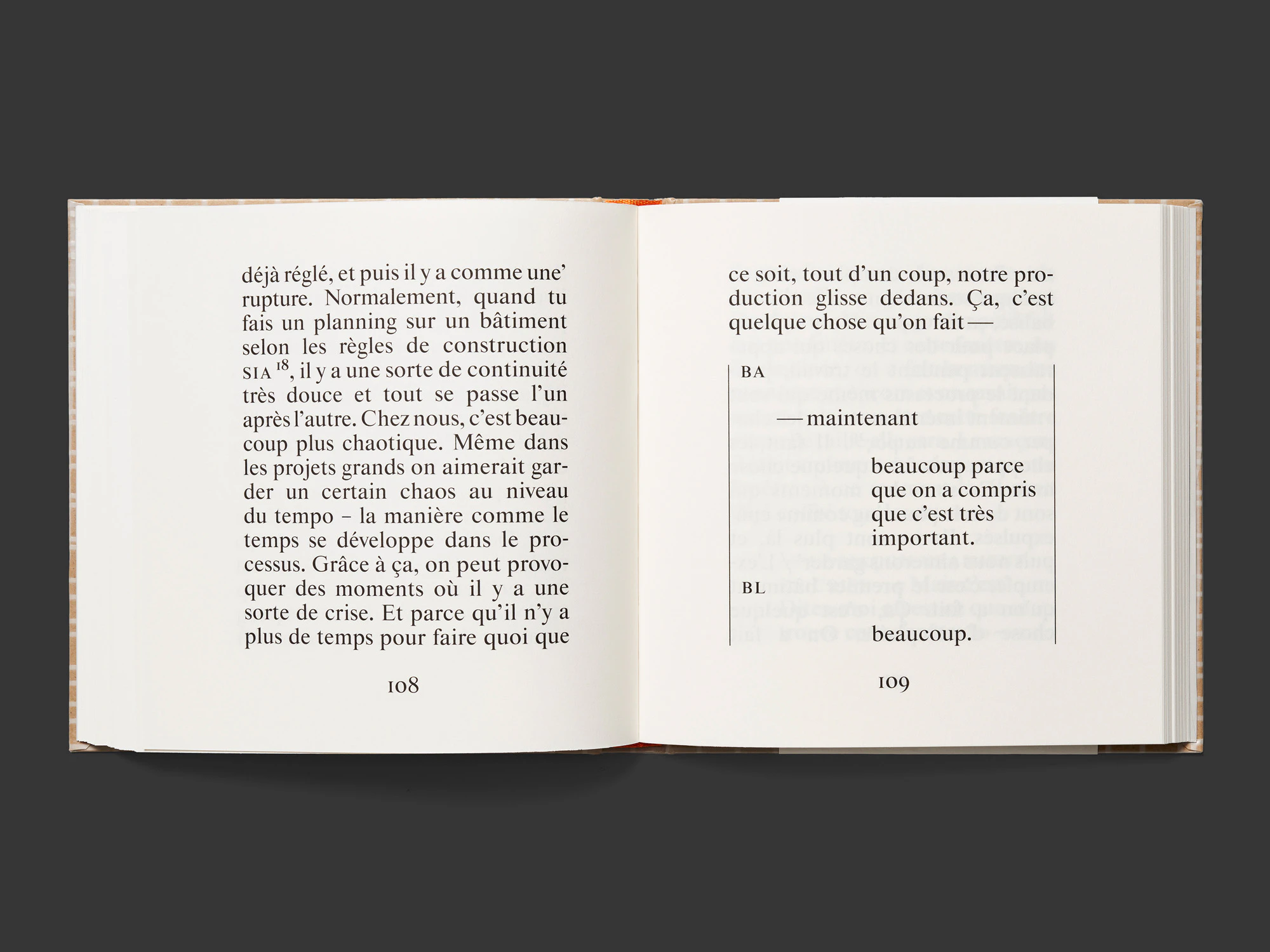 Un libro testuale quadrato, piuttosto piccolo, con una spessa copertina rigida di colore beige-rosso porta letteralmente in scena, in chiave marcatamente performativa, una conversazione tra gli architetti losannesi Bakker e Blanc. Senza che ci sia neanche una sola immagine, il dialogo si offre alla lettura come uno spettacolo teatrale con atti, istruzioni di regia, elenco dei personaggi ecc. L’ampio carattere serif e i brevi blocchi di testo a una colonna ricordano in alcuni punti le stampe degli inizi dell’epoca moderna. Nel contempo sembra anche quasi un manuale di tipografia, dato che il carattere distintivo varia più volte: singole lettere che riempiono una pagina intera all’inizio; titoli intermedi molto grandi al centro della pagina; sezioni verticali e in corsivo nel testo teatrale; dimensioni di carattere più piccole in un inserto bibliografico stampato in rosso su quattro pagine grigie più strette. Per il rivestimento della copertina è stato utilizzato un materiale isolante da edilizia e nella terza di copertina è inserito un piccolo disco in vinile. Il tutto è estremamente elegante e raffinato. Il libro farebbe bella figura anche come oggetto di scena sul palcoscenico del teatro.